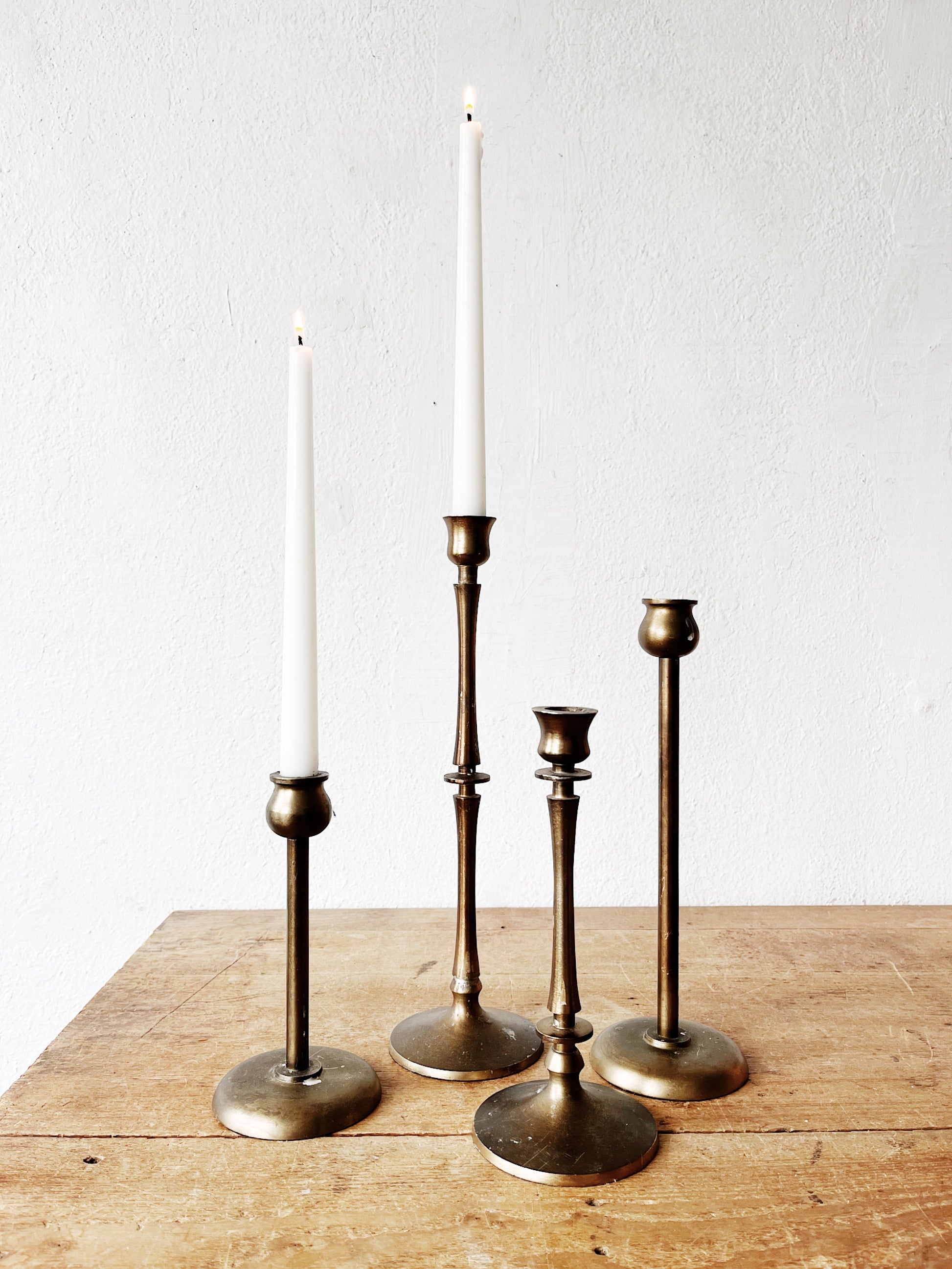 Vintage candle holders in graduated sizes. Burnished mixed metal material. Felt bottoms. Takes standard taper candles.