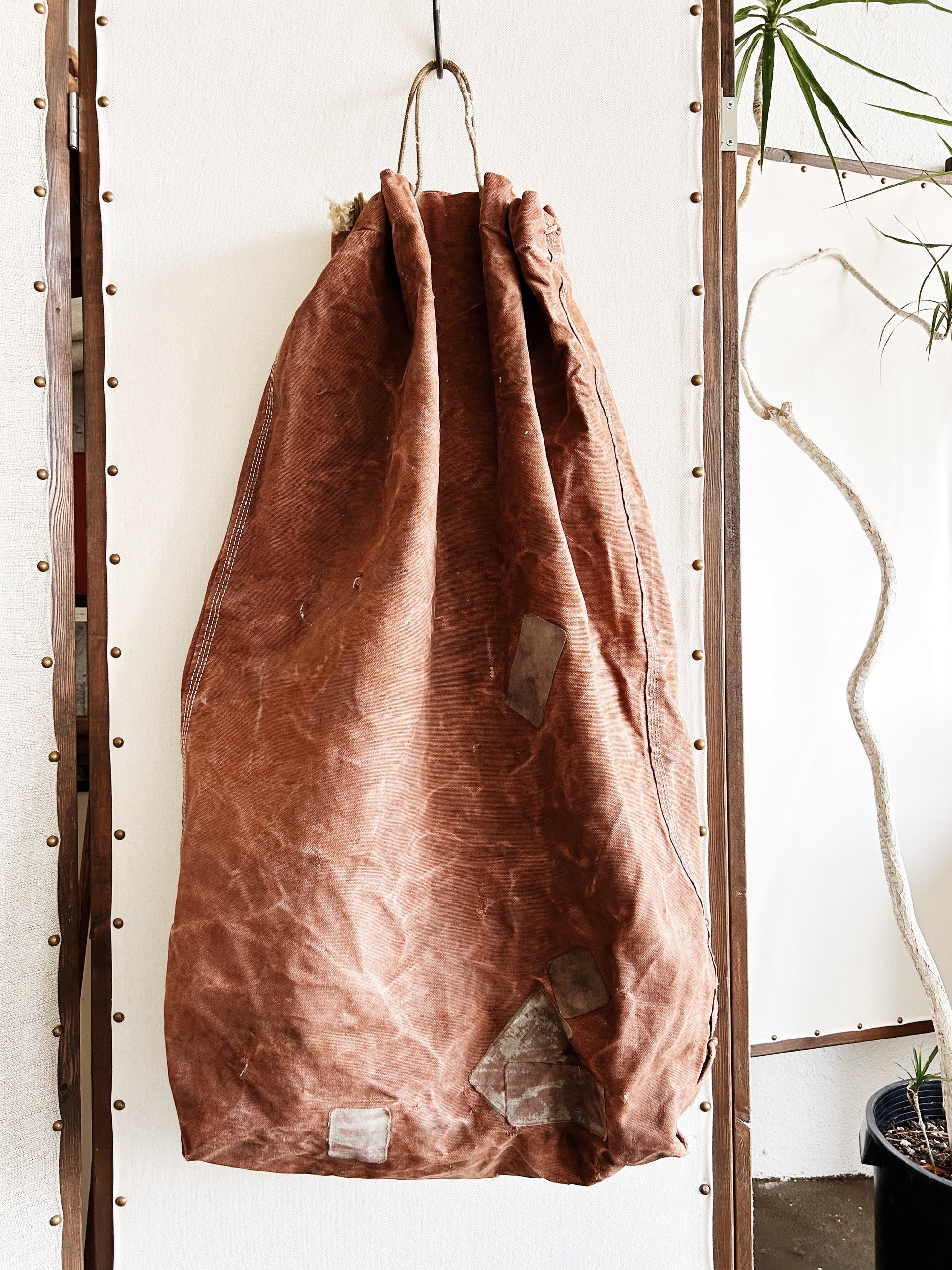 A nice old large military duffle in the rarer rust color with hand patching and nylon cord. Metal grommets all in nice condition. A gem, great to look at and useful too.