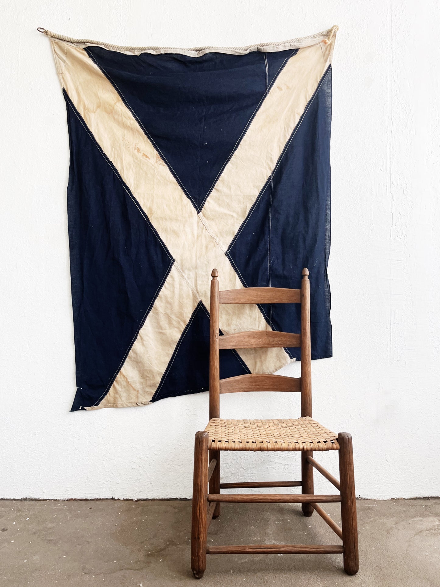 Worn in canvas with rope tie hangers and brass ring. Navy blue with tea stained canvas. Even if you’re not Scottish, this has a great look that would act well as a curtain, noren or closet door. The patina is awesome