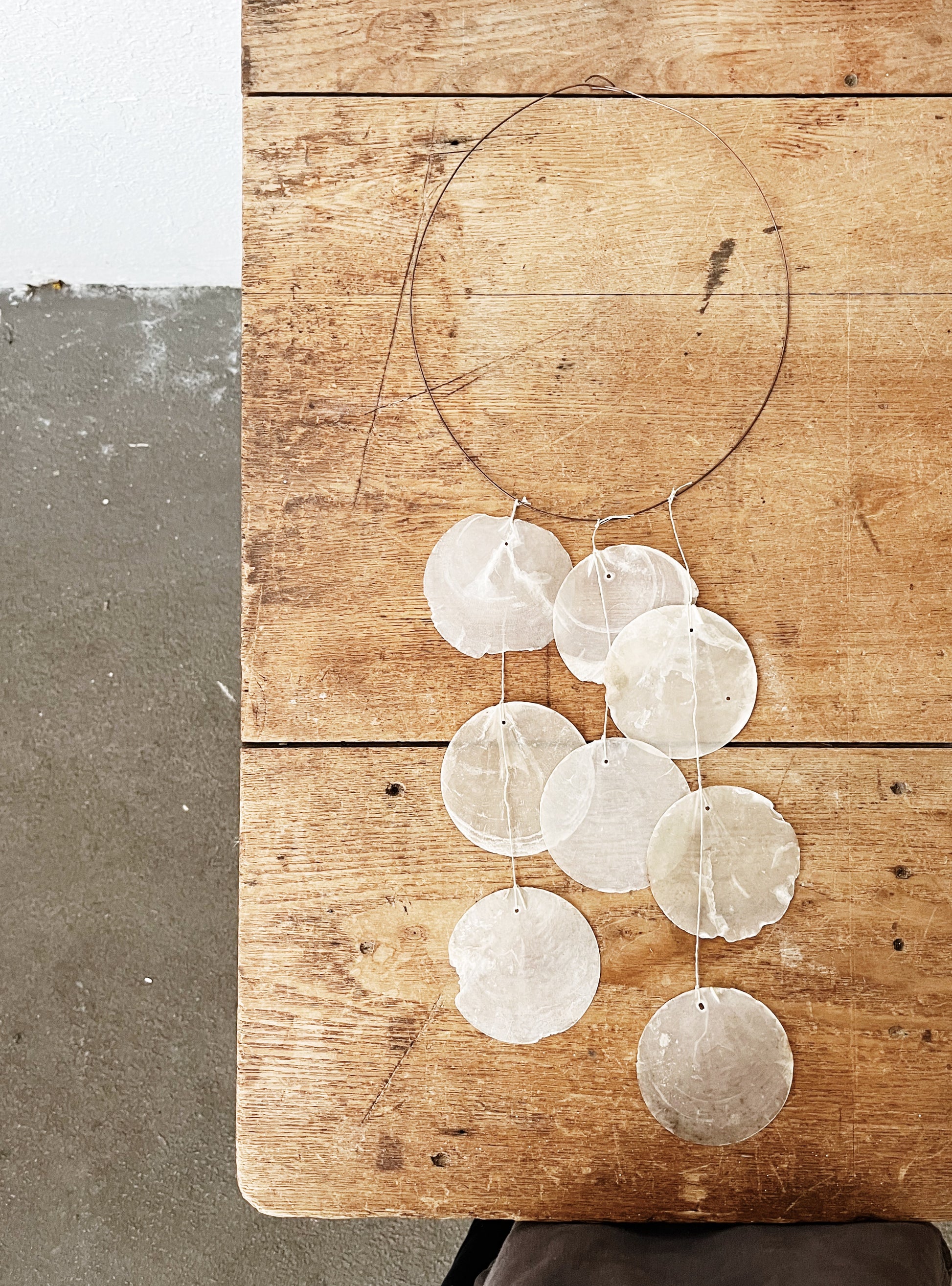 The delicate sounds of a Capiz shell chime wafting through the breeze. Yep, it’s really that romantic. Hangs from thinnest copper wire