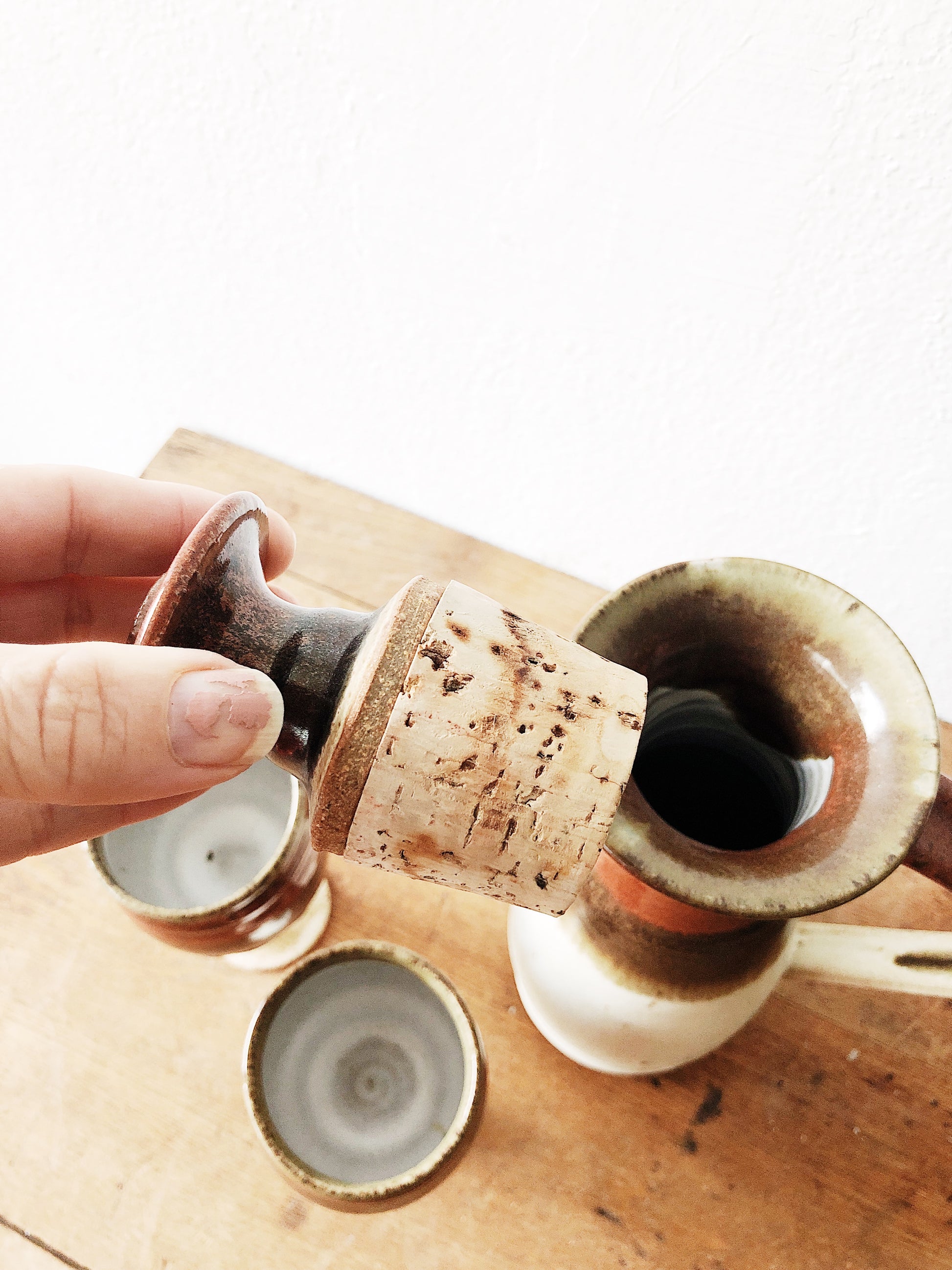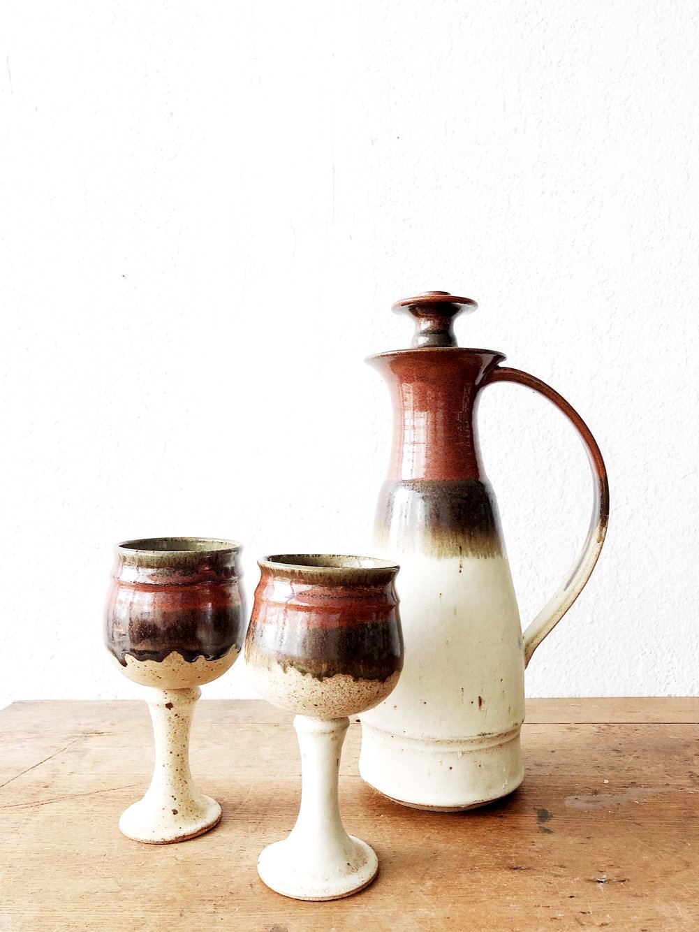 Hard to find these ceramic carafes with stopper intact. This one has nice earthy colors and a beautiful form. Two goblets included