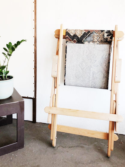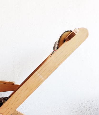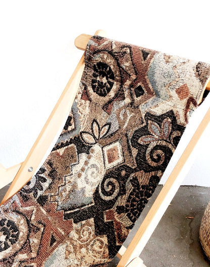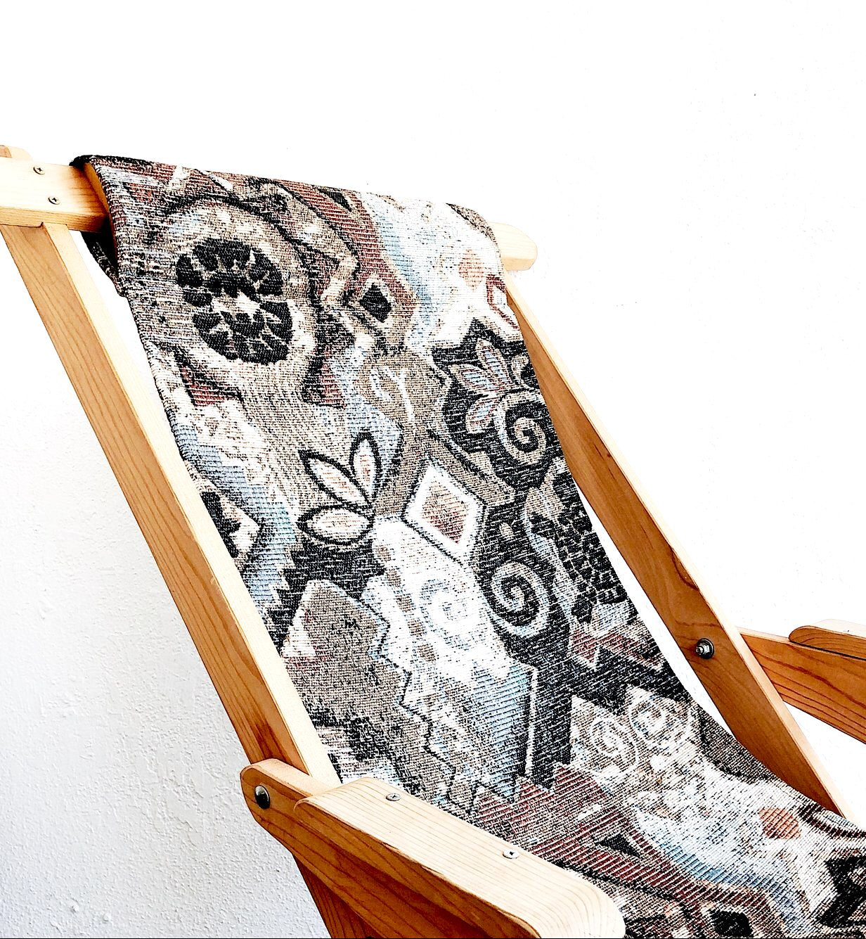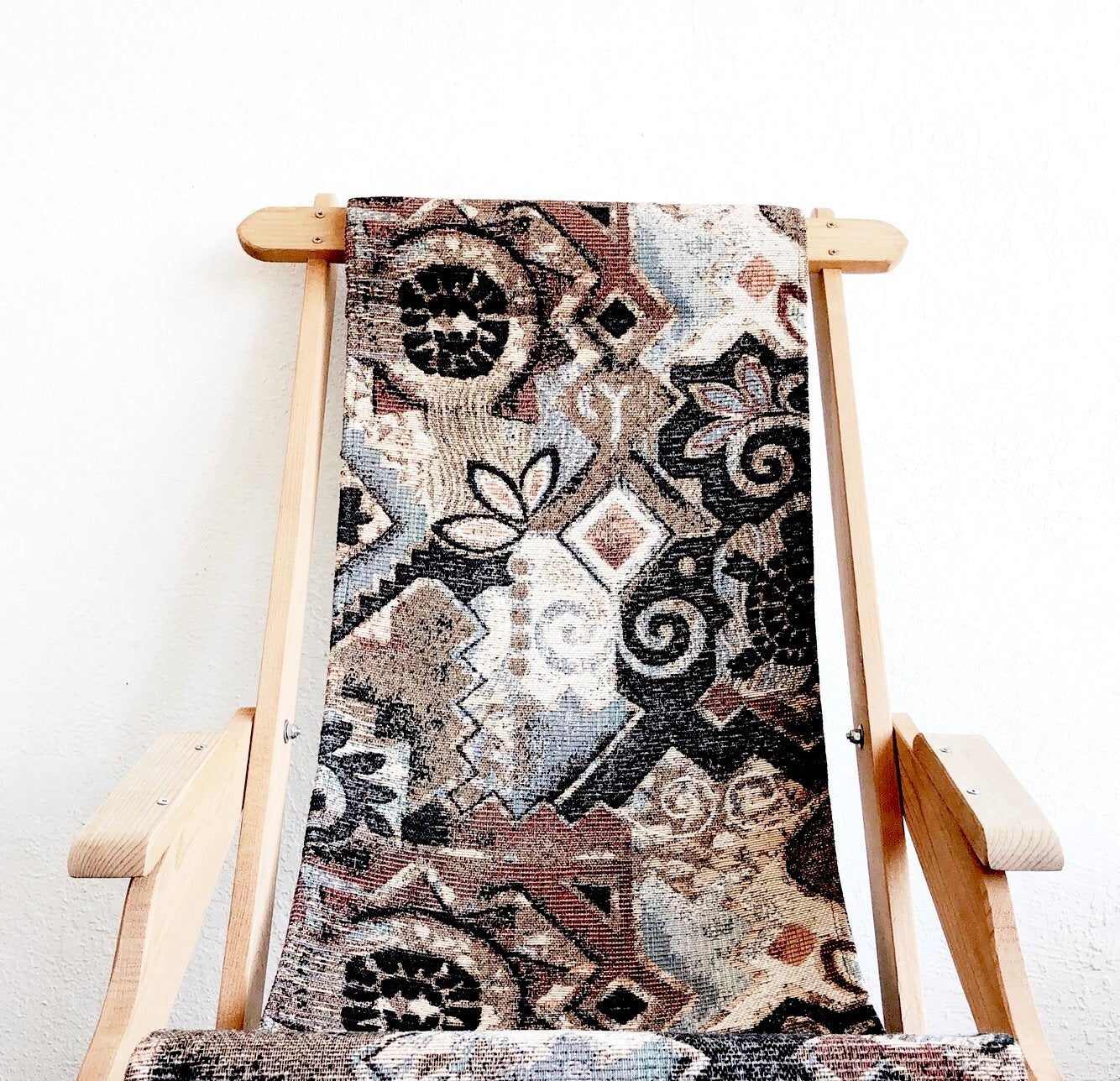Fantastic folding rocking chair upholstered with carpet bag fabric. Head and leg areas are padded. This chair is exceptionally comfortable and relaxing