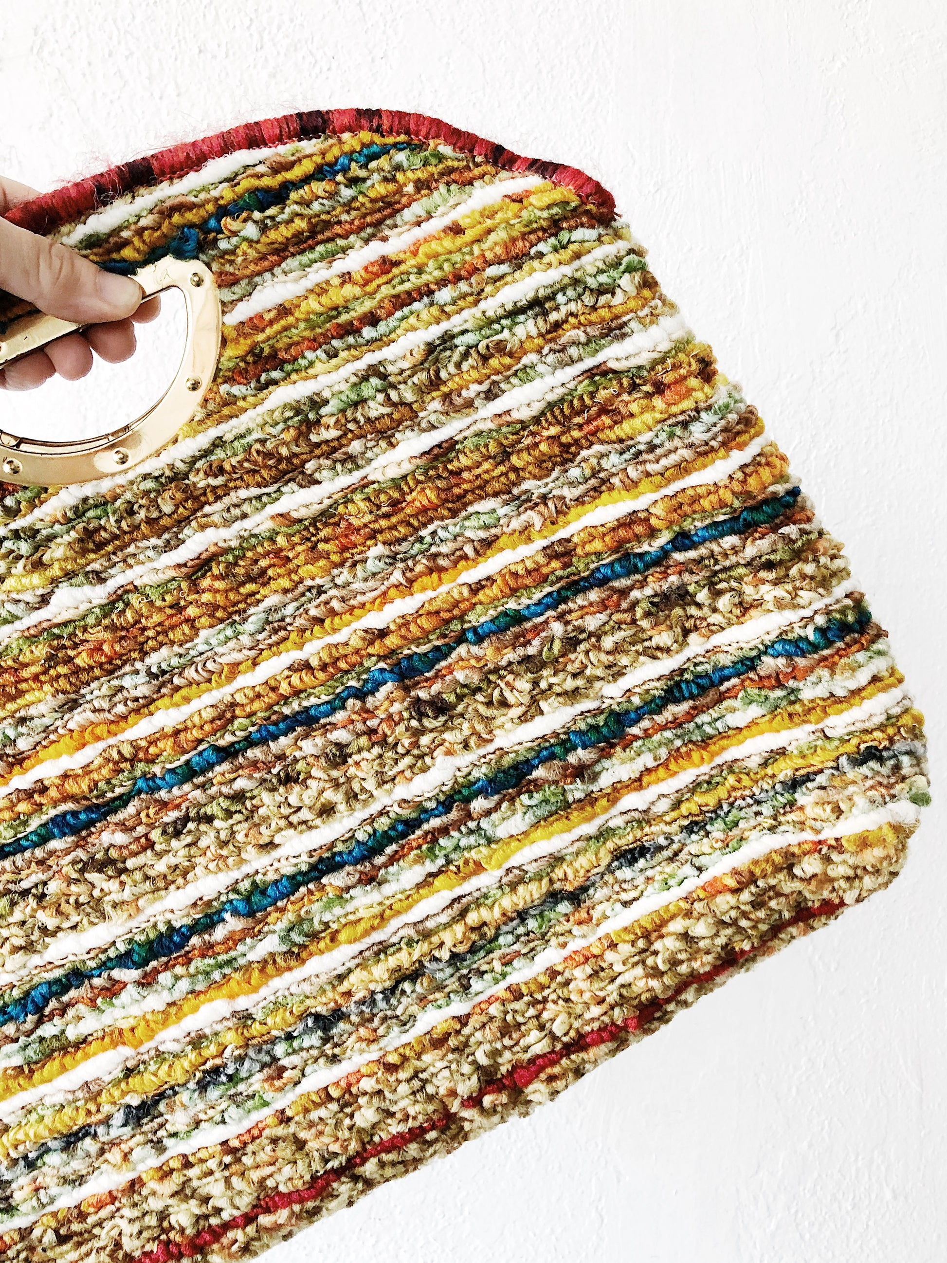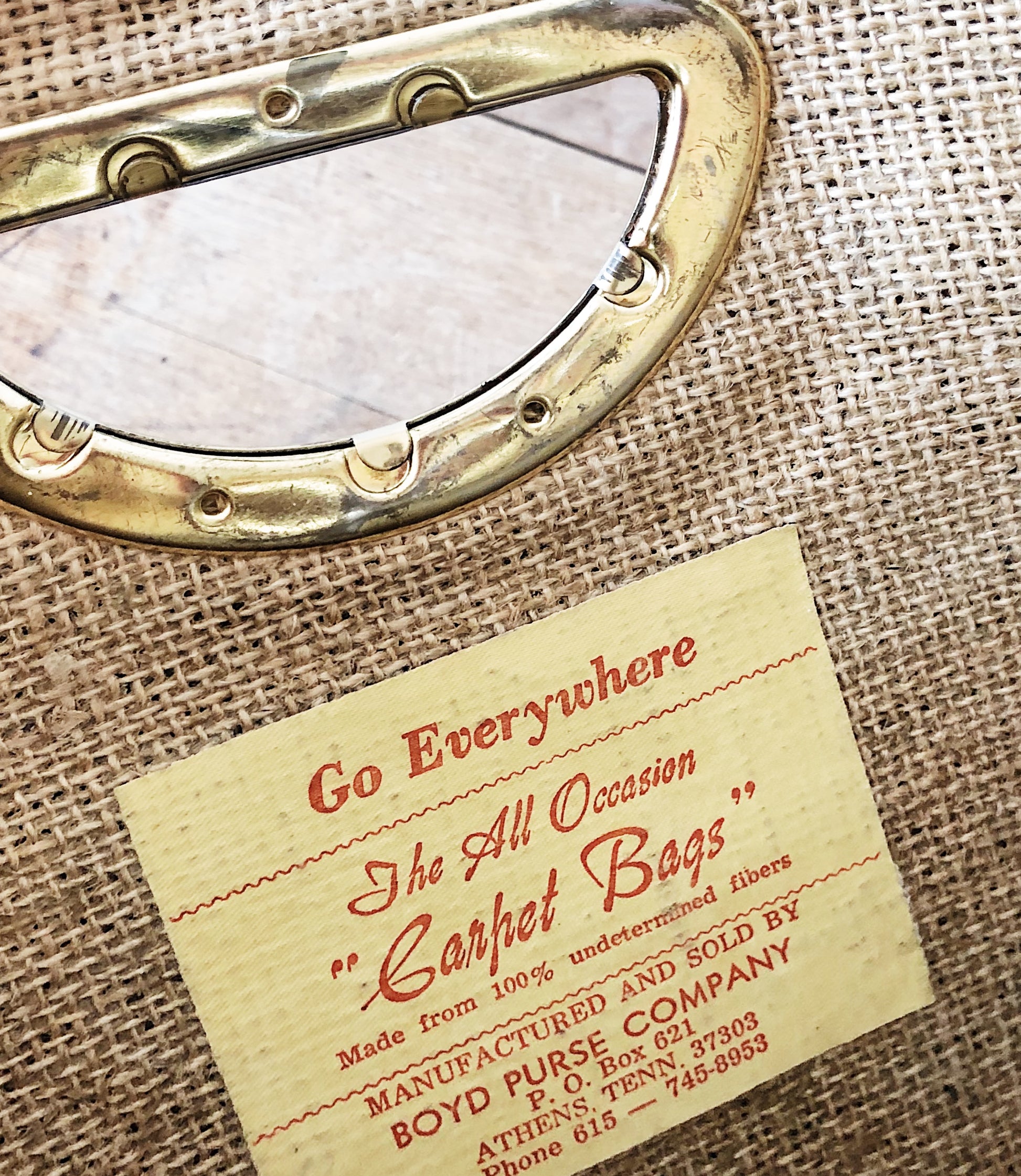 Fabulous woven fibers make up this vintage woven carpet bag tote. Nice brass handle