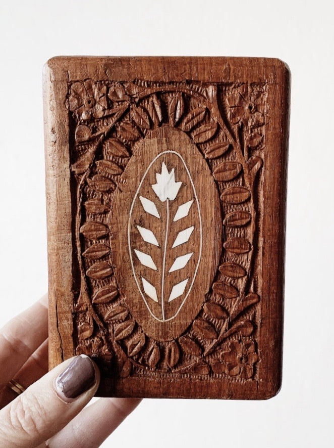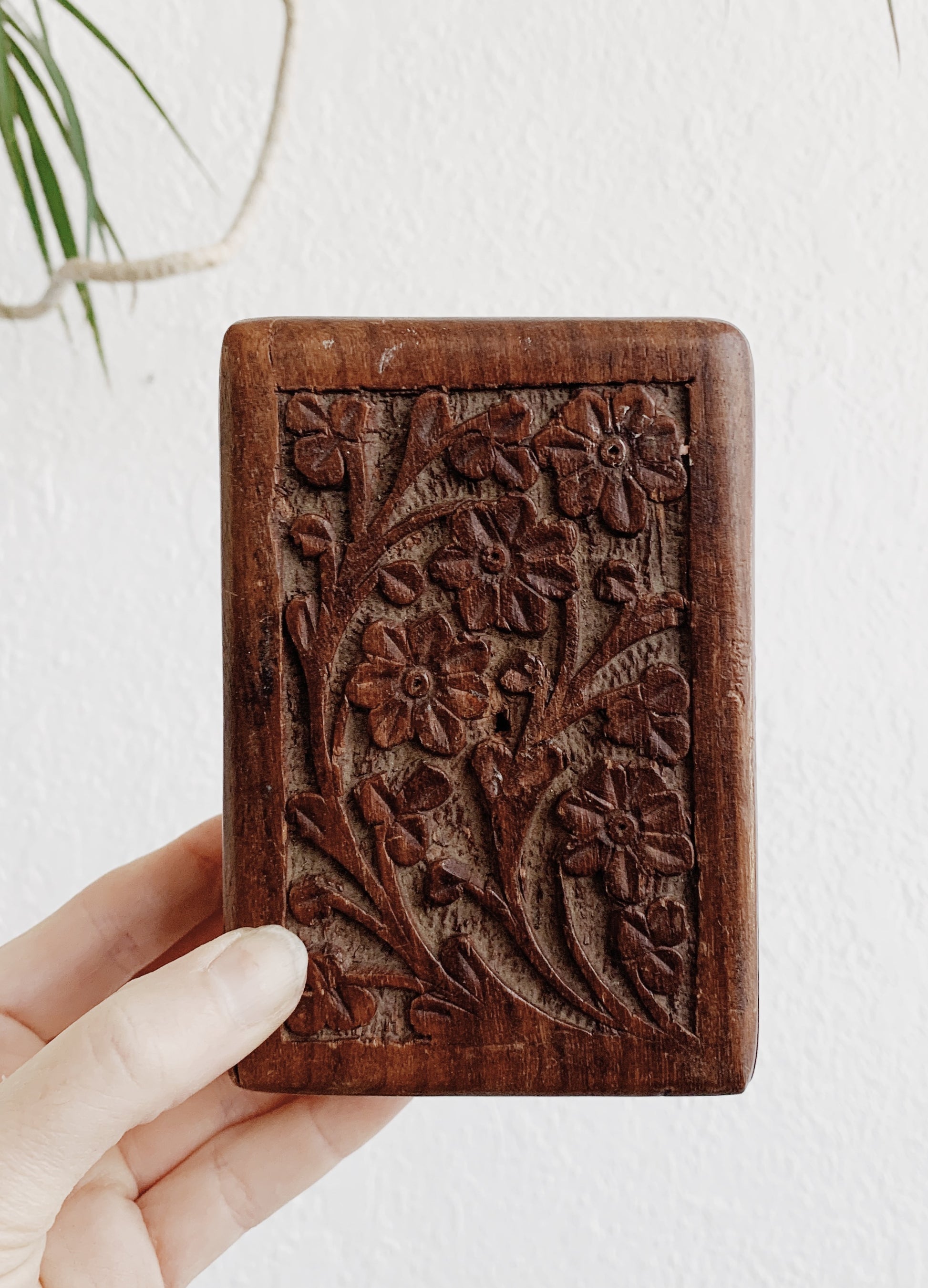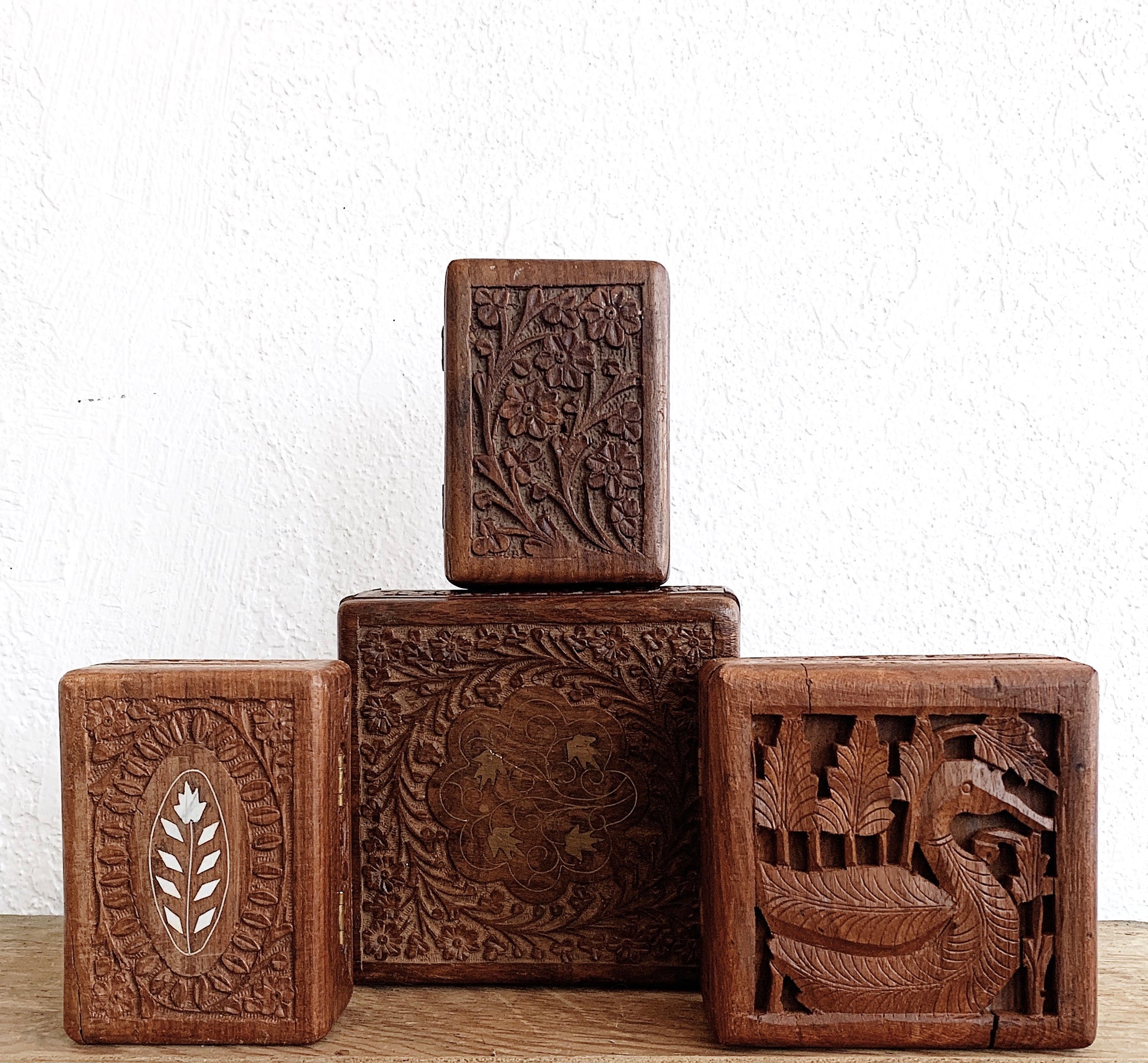 Lovely vintage carved wood box collection. Sold Individually. Please select your preference at checkout. All have brass hinges and are in nice shape.