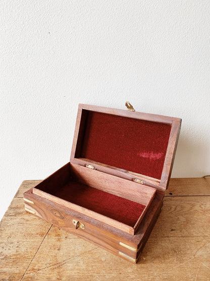 Beautiful vintage carved wood box with brass inlay and latch. Burgundy velvet interior. The perfect home for you’re favorite deck of tarot cards or other precious items.
