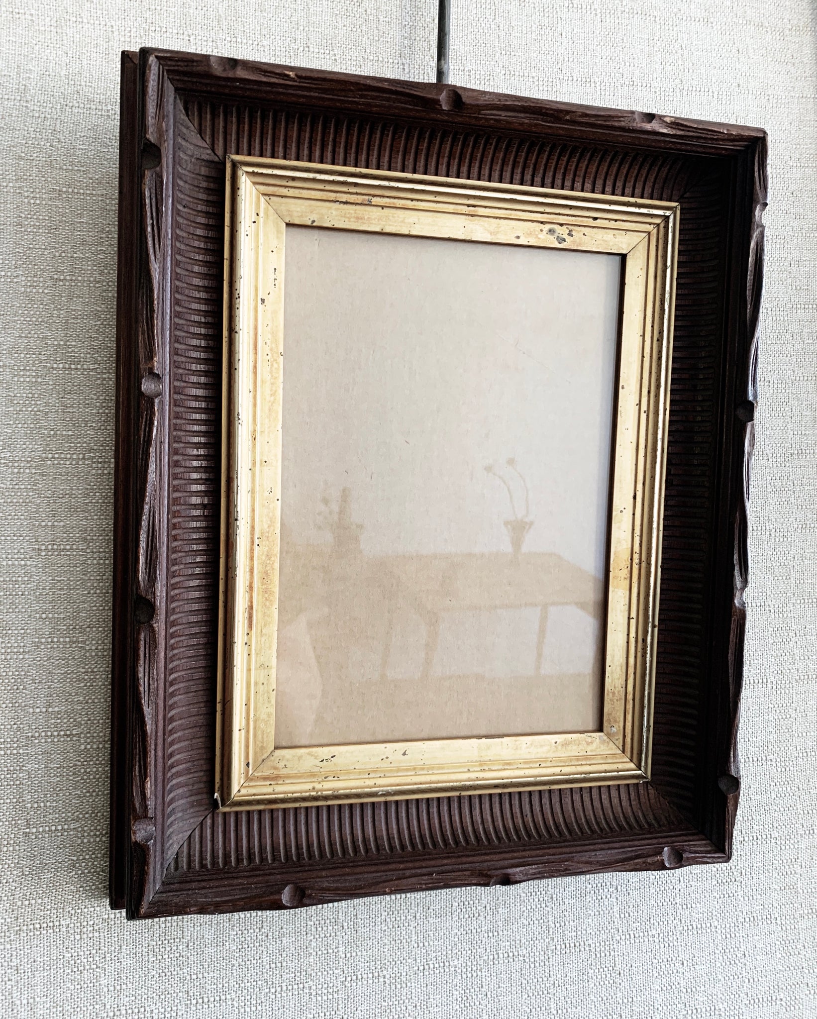Chunky vintage wood frame with gold accent. Comes with glass and wire hanger