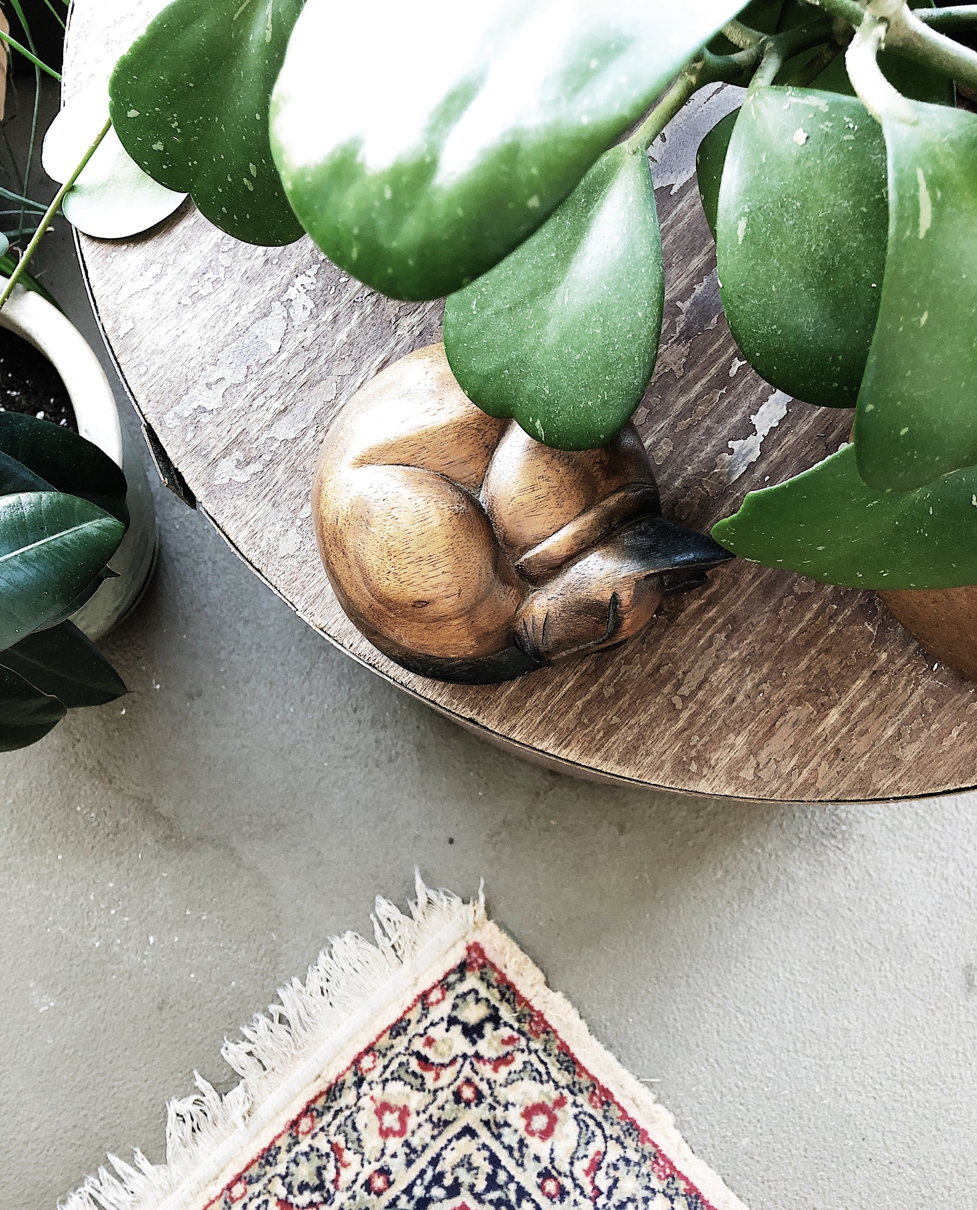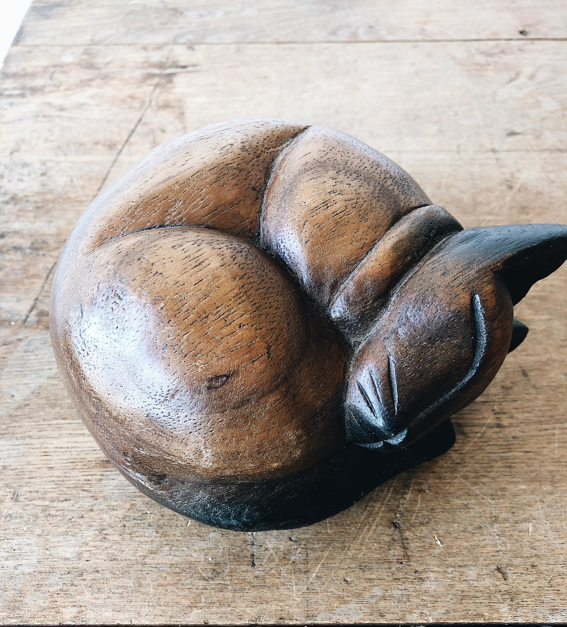 Carved from one block of wood, this vintage sleeping kitty is weighty enough to be a doorstop, paperweight or bookend