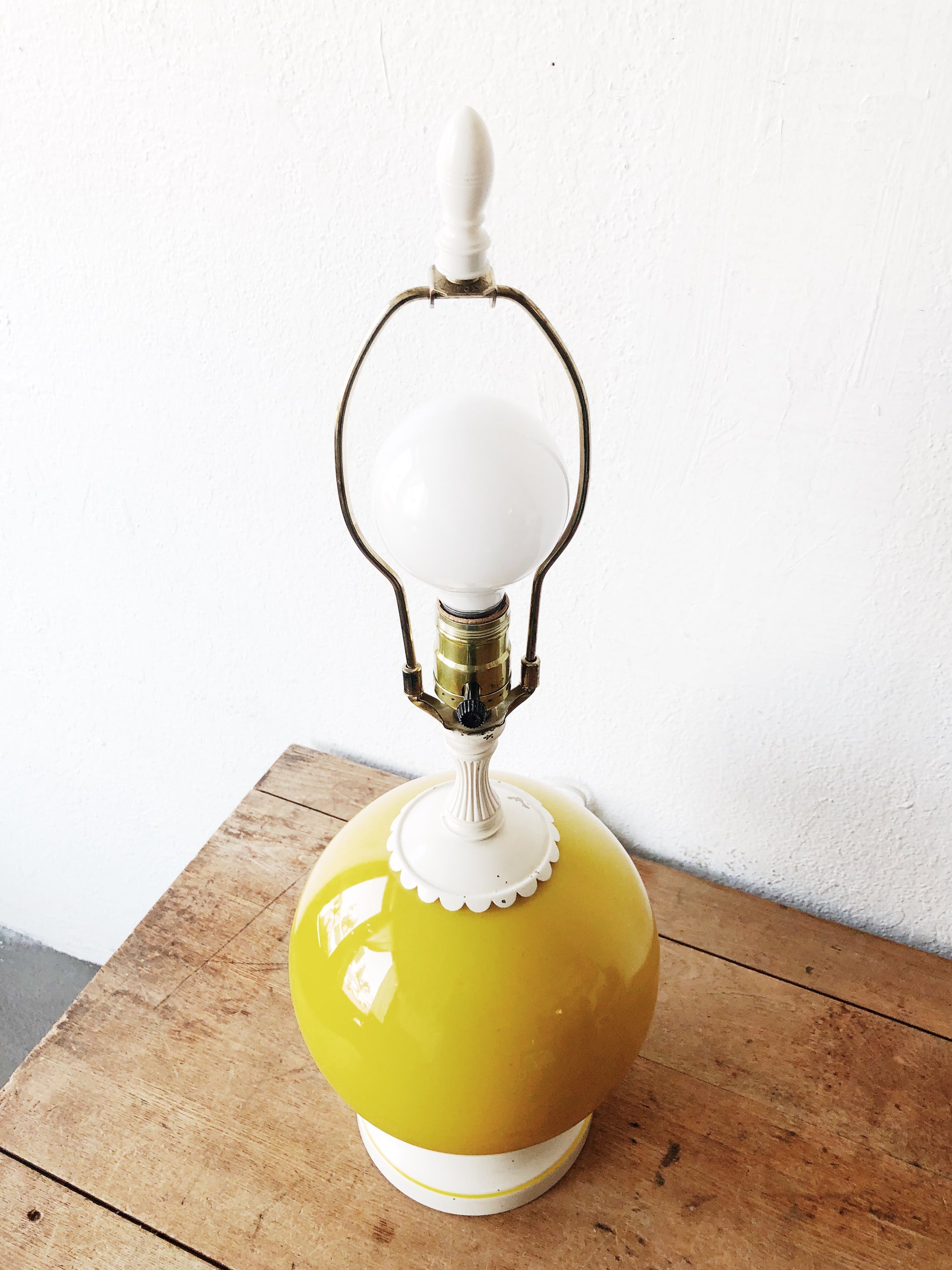 Sunny egg yolk yellow cased glass with enameled base and collar. Painted finial