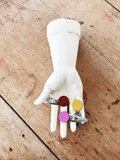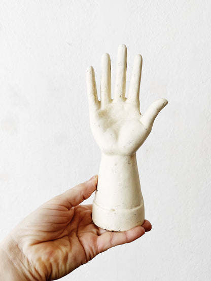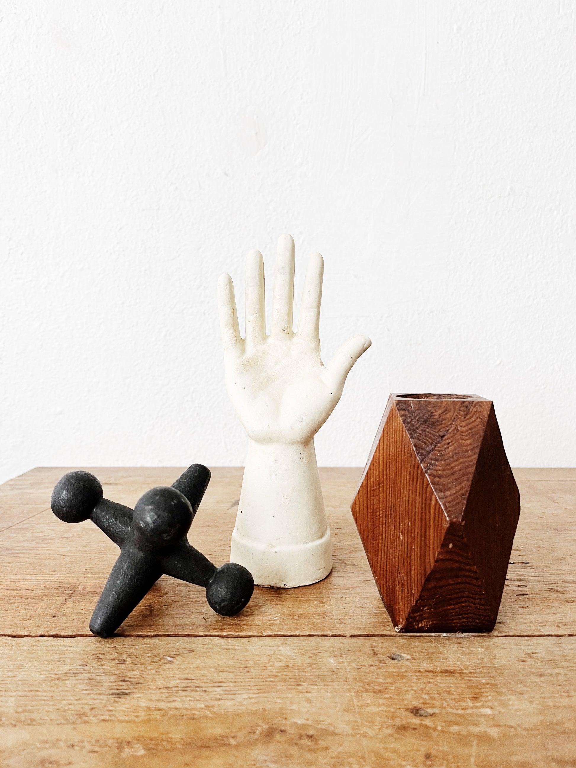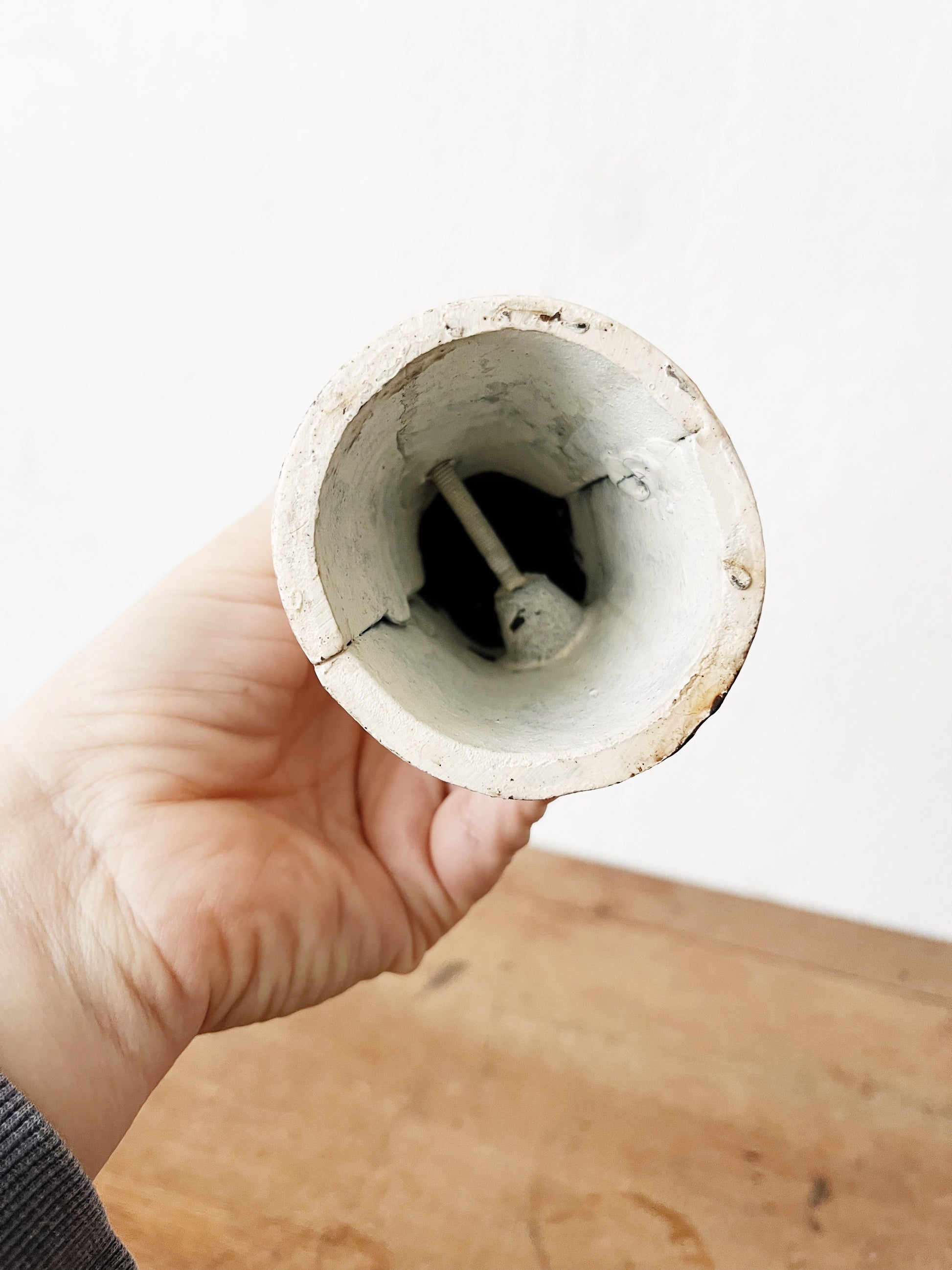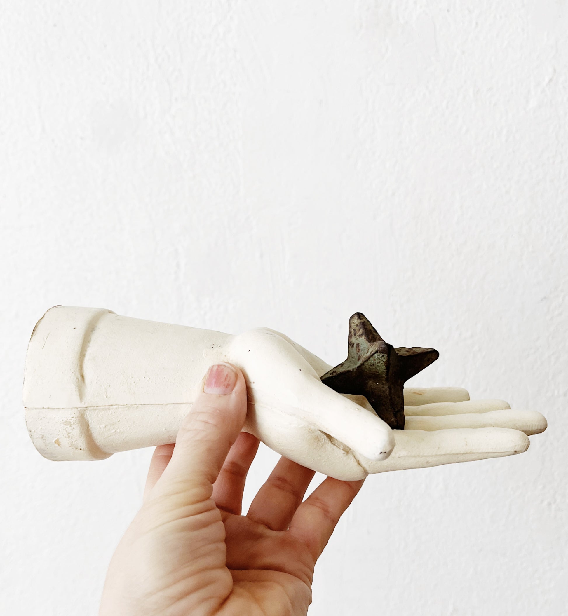Heavy cast iron painted a warm muddy white. Weighty enough to be a doorstop or bookend on a shelf