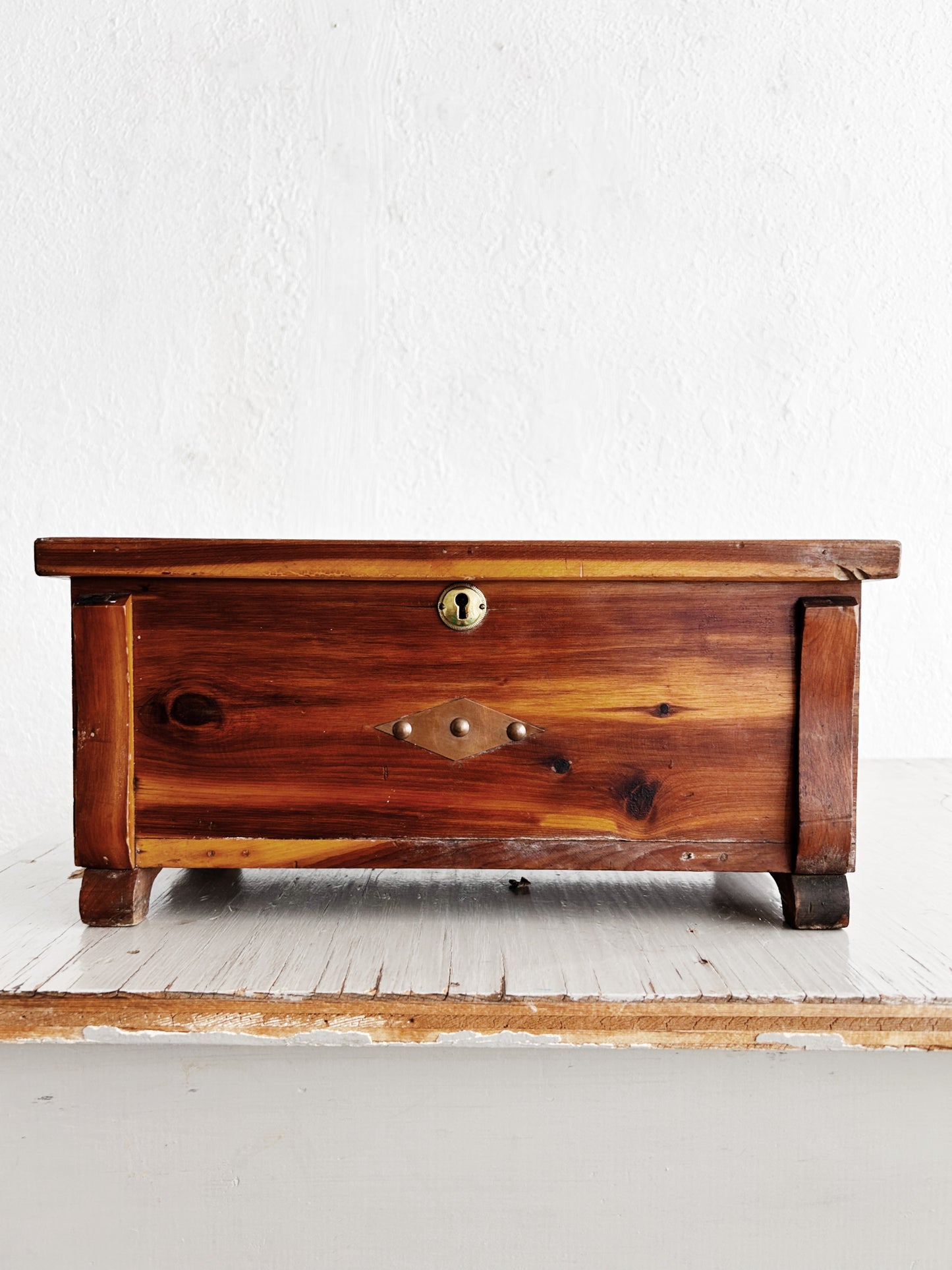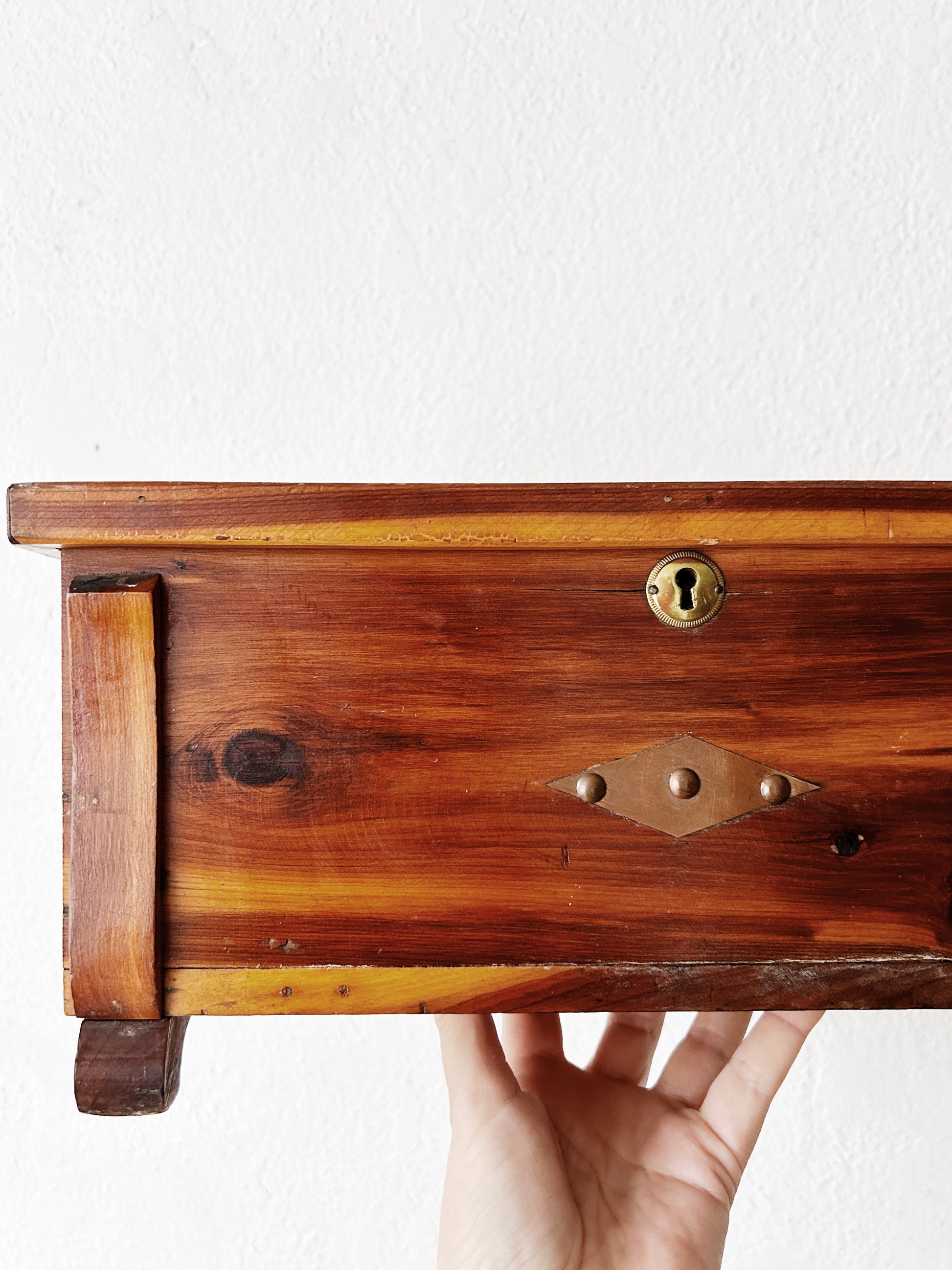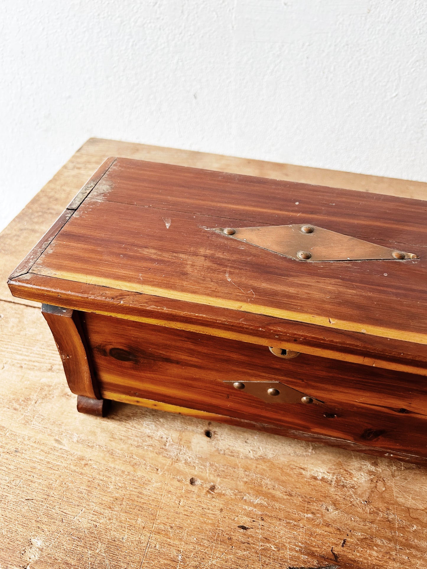 Wonderful oldie cedar chest with copper detail. Perfect atop a dresser, for tea storage in the kitchen or in the bathroom! Lovely and nicely sized.