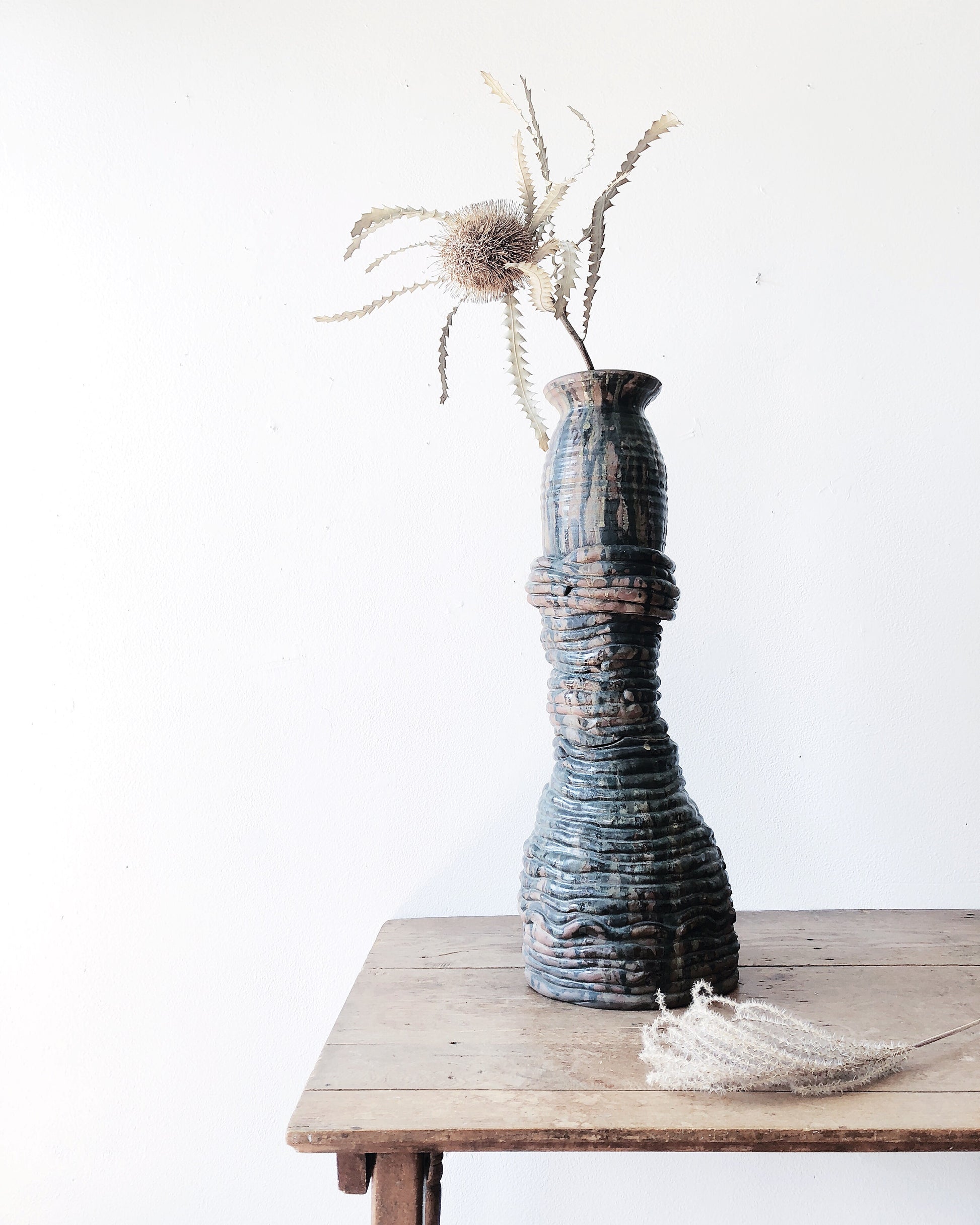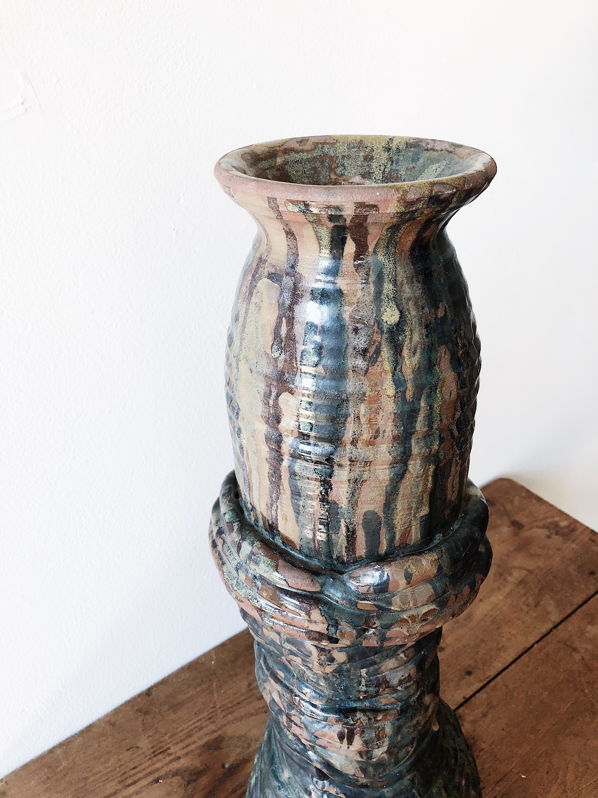 At two feet tall This fantastic biomorphic sculpture is outstanding! It’s hand coiled and glazed and makes a big impact due to its size. Does not hold water but rather is open at both ends