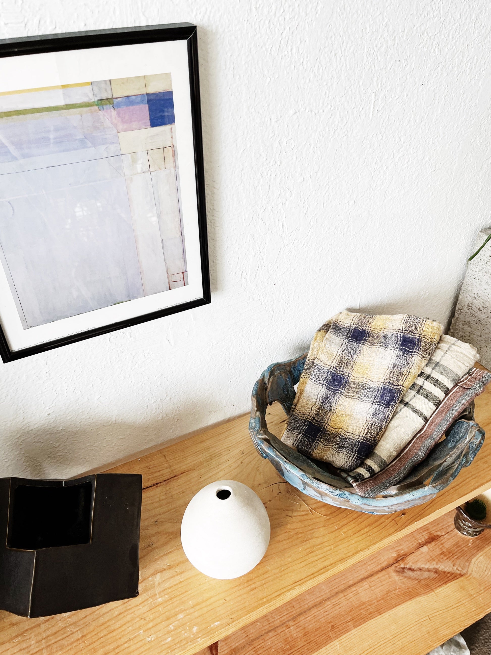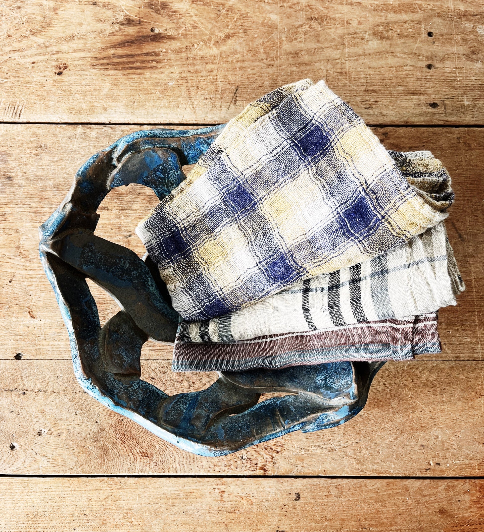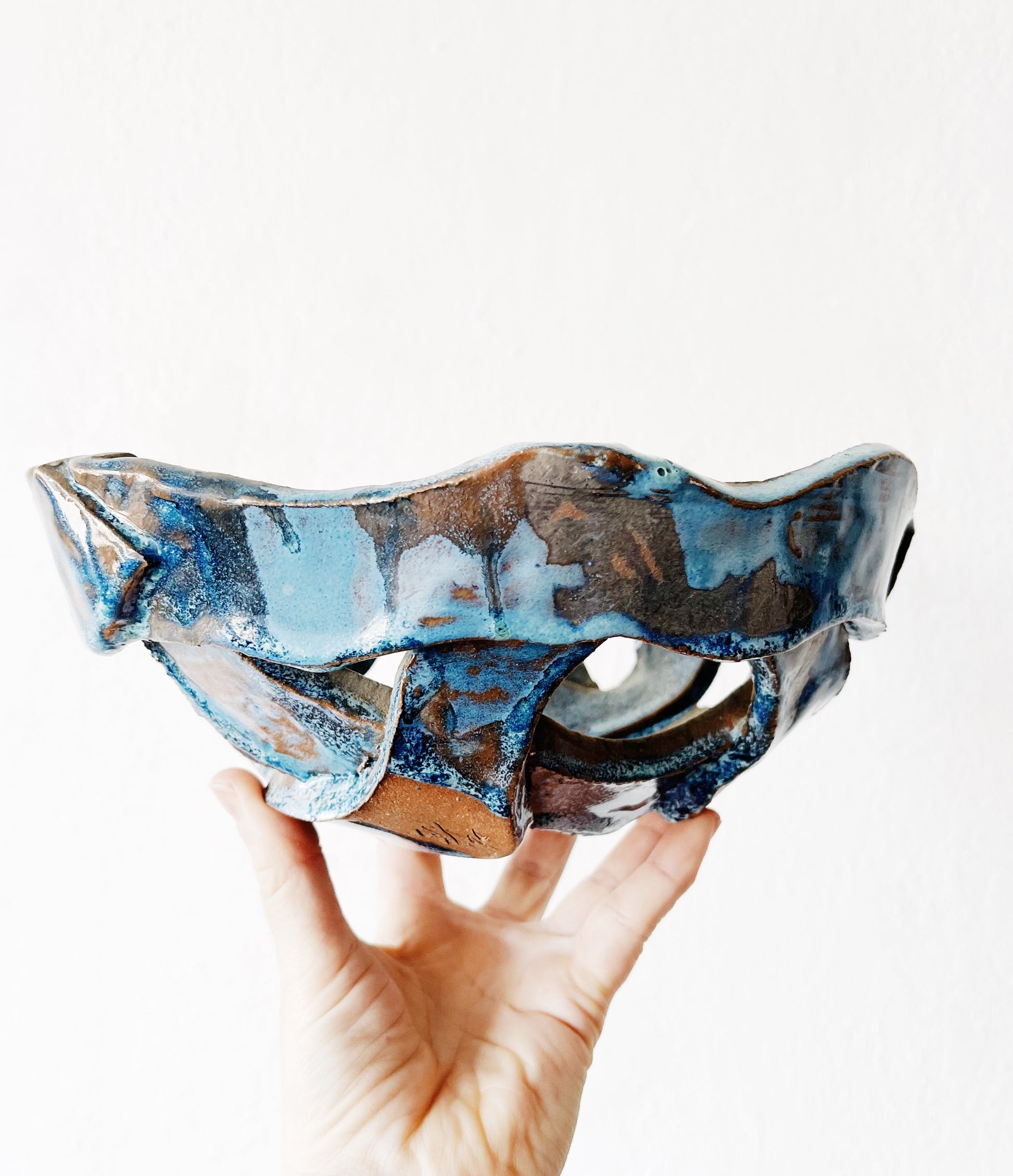 Handmade ceramic bowl with an open weave. Prettiest mottled blue. Perfect for fruit. Signed and dated 1984