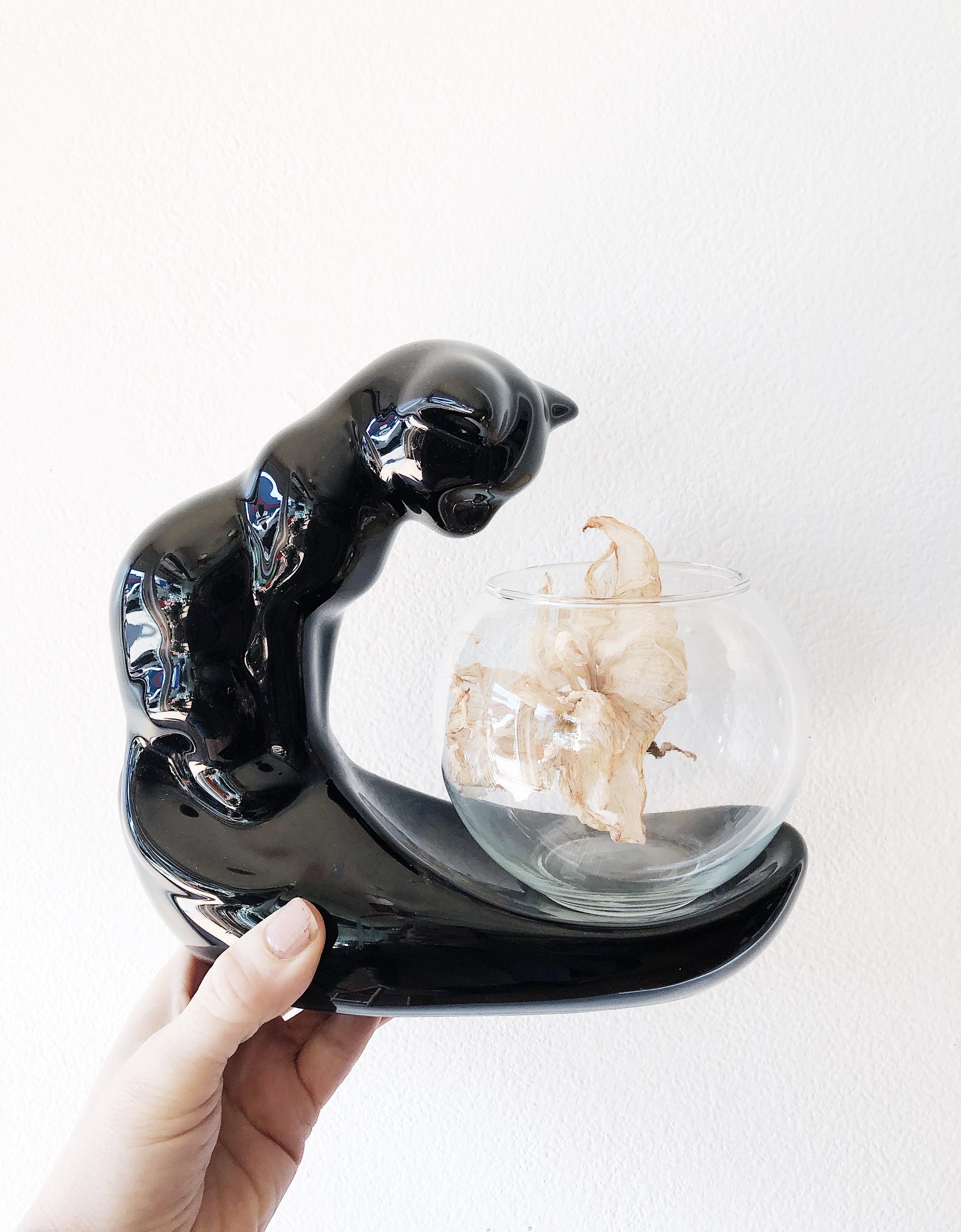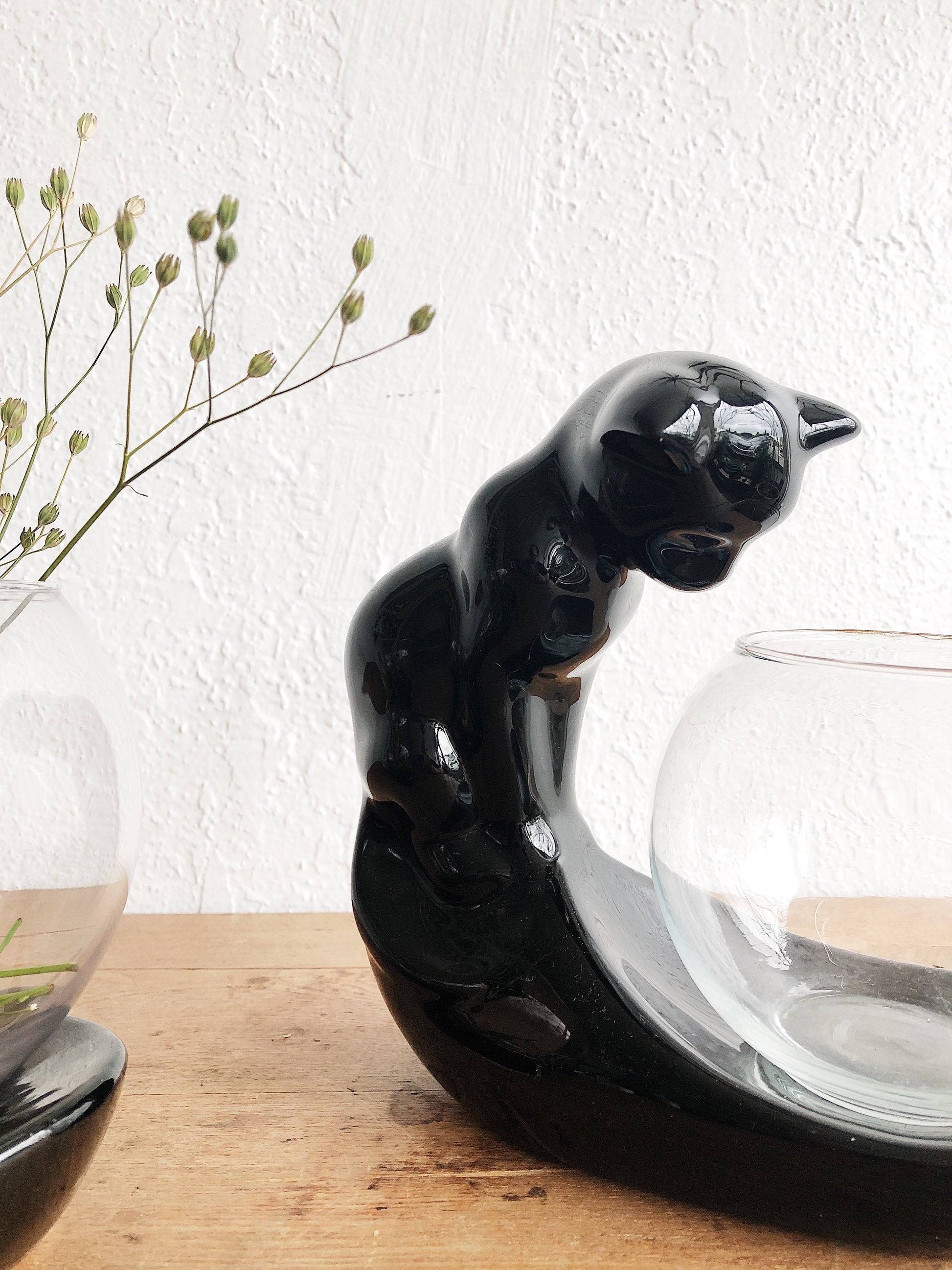 Vintage ceramic cat with glass bowl. We’ve got a watcher and a pouncer. Which kitty do you have?