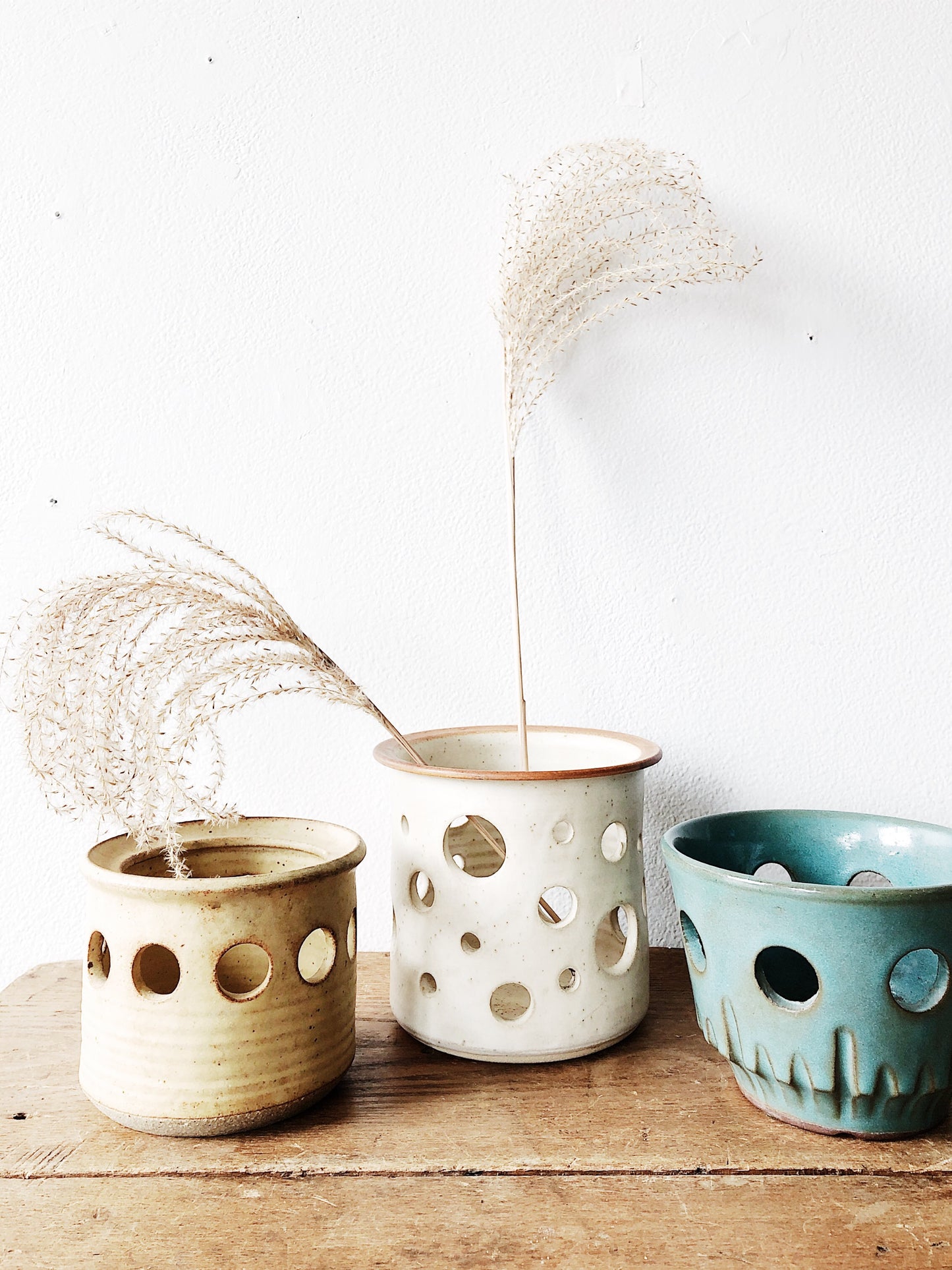 A trio of peek a boo pots, originally made for putting up orchids however we like them as candle luminaries as well