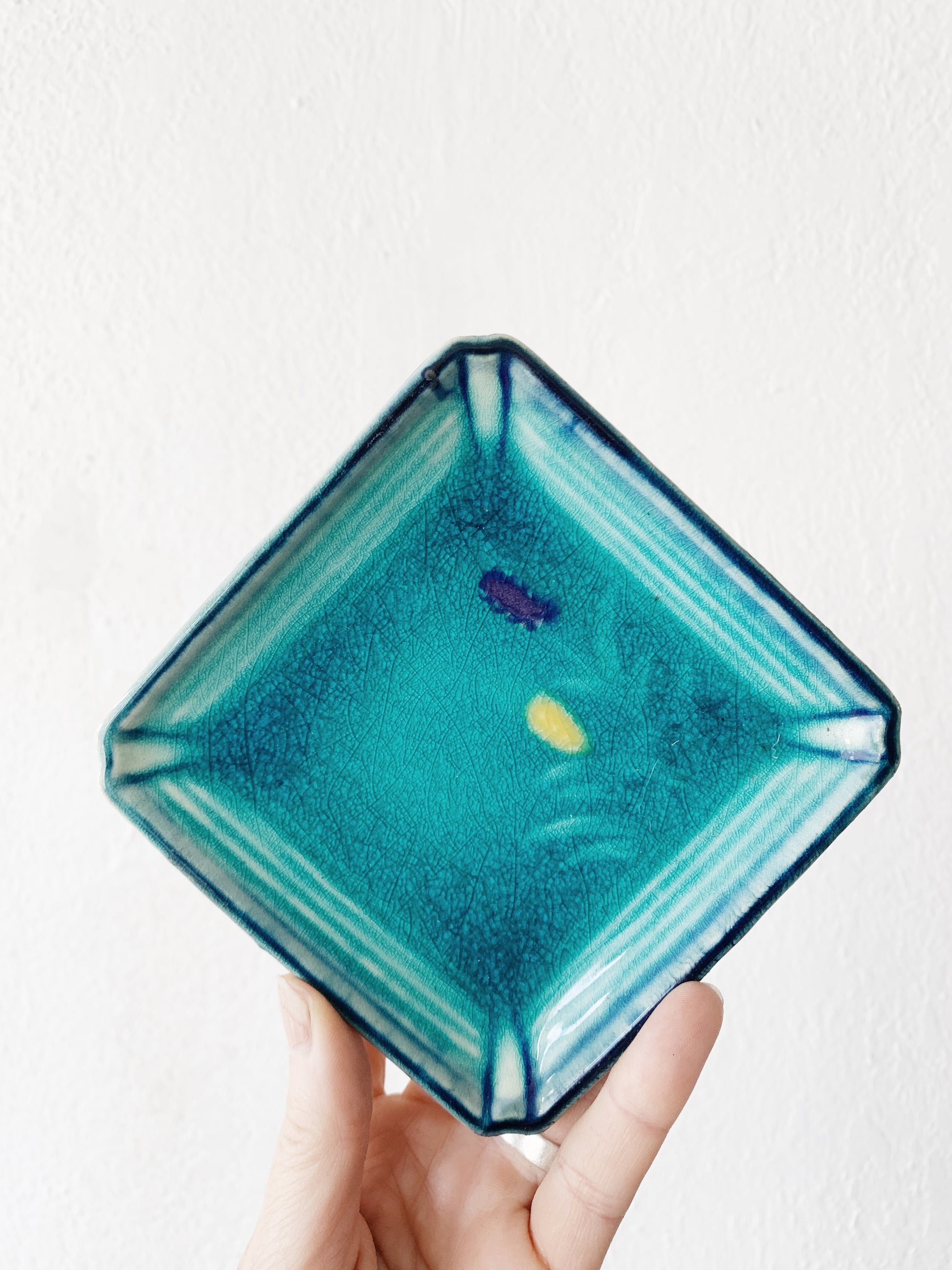 Really pretty vintage small square plates made in Japan. Crackled turquoise glaze with flowers.