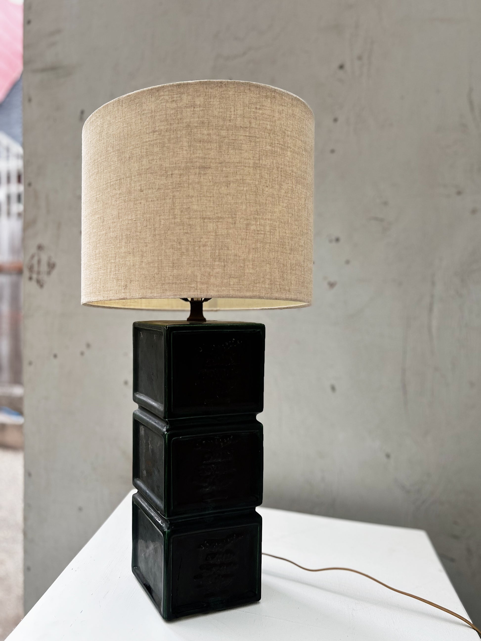 Stacked ceramic squares in deep green black. An almost powdery surface, two of the four sides show raised areas of design. Topped with a linen drum shade. Three way switch and original ivory cord. The lamp and the shade are both in good condition. Normal surface wear to the lamp with a small hairline repair, and the inside of shade shows a little wear