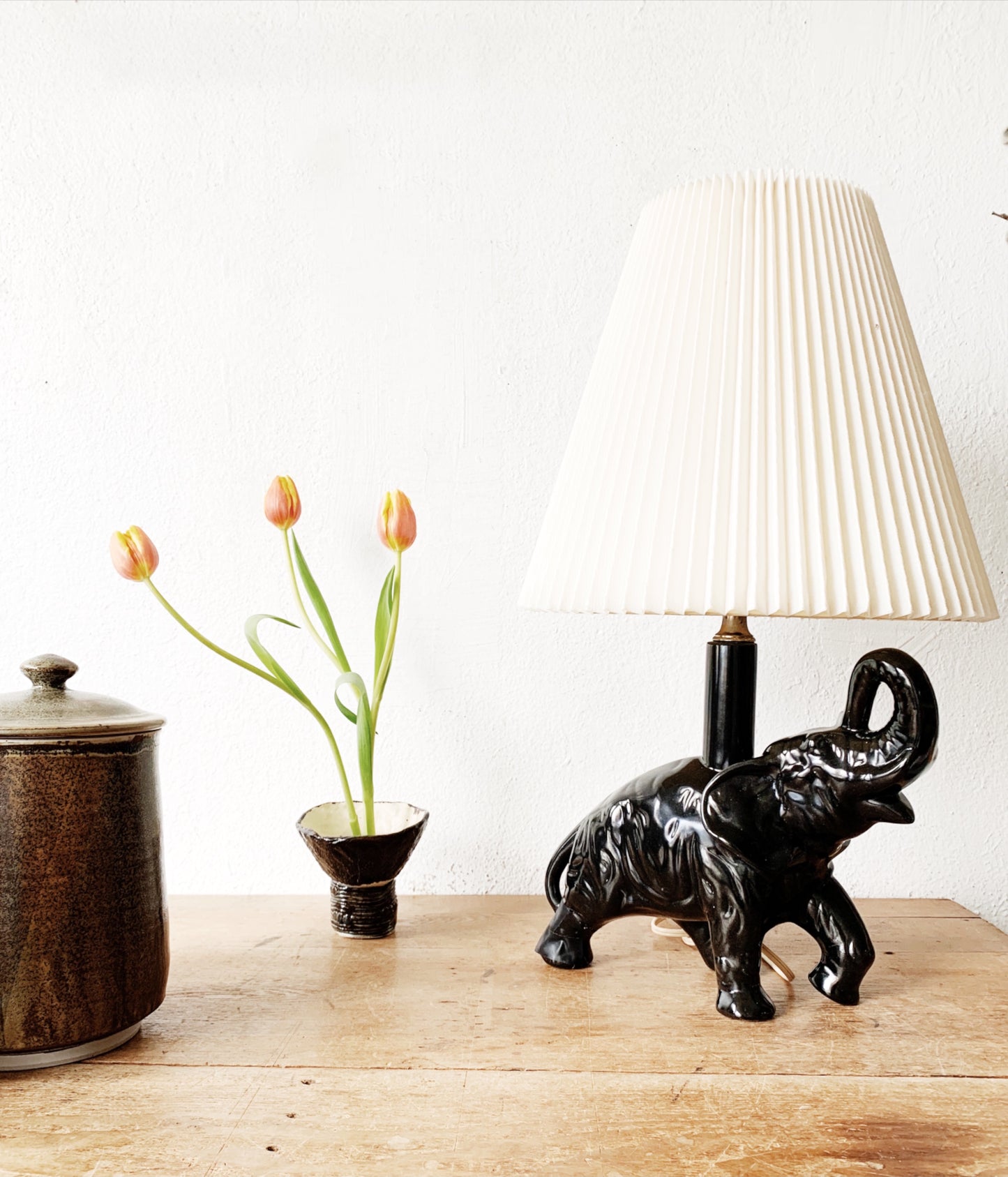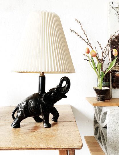 Fabulous vintage ceramic elephant lamp with cream pleated linen shade. Excellent condition, a beauty!