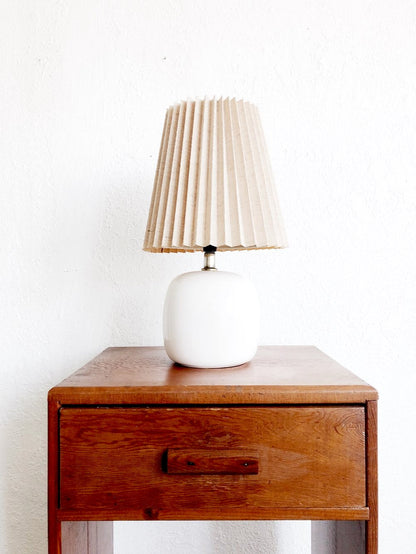 Sweet ceramic lamp with rounded square vase. Done in white with a natural linen pleated shade. Perfect size bedside or a small nook.