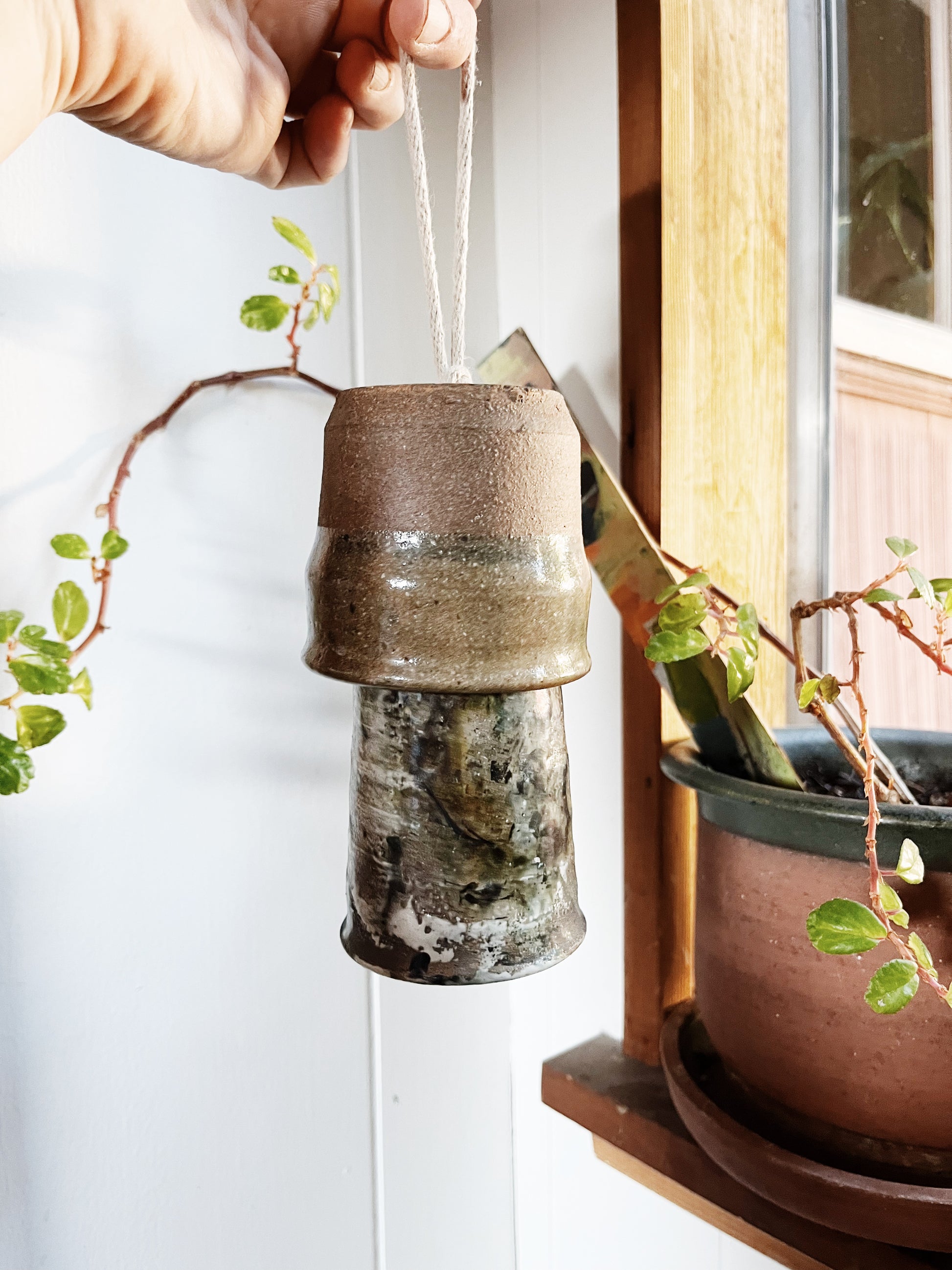 Beautiful made ceramic bells which to us resemble mushrooms. Cotton cord strings the wonderfully glazed bells together