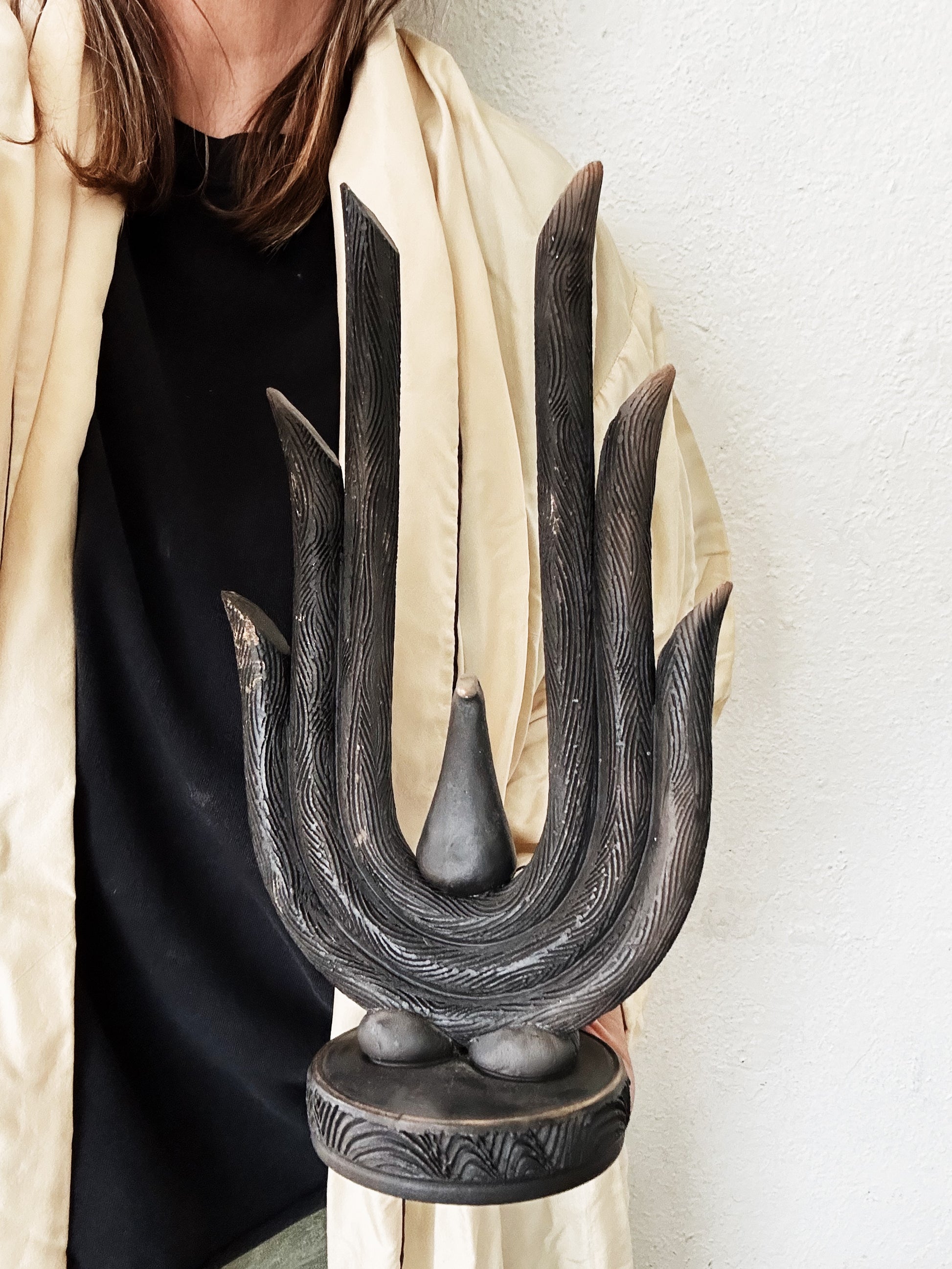 in beautiful condition with no chips or cracks, it is quite striking! Terra cotta clay with black matte from the firing process (?), the black is inconsistent.