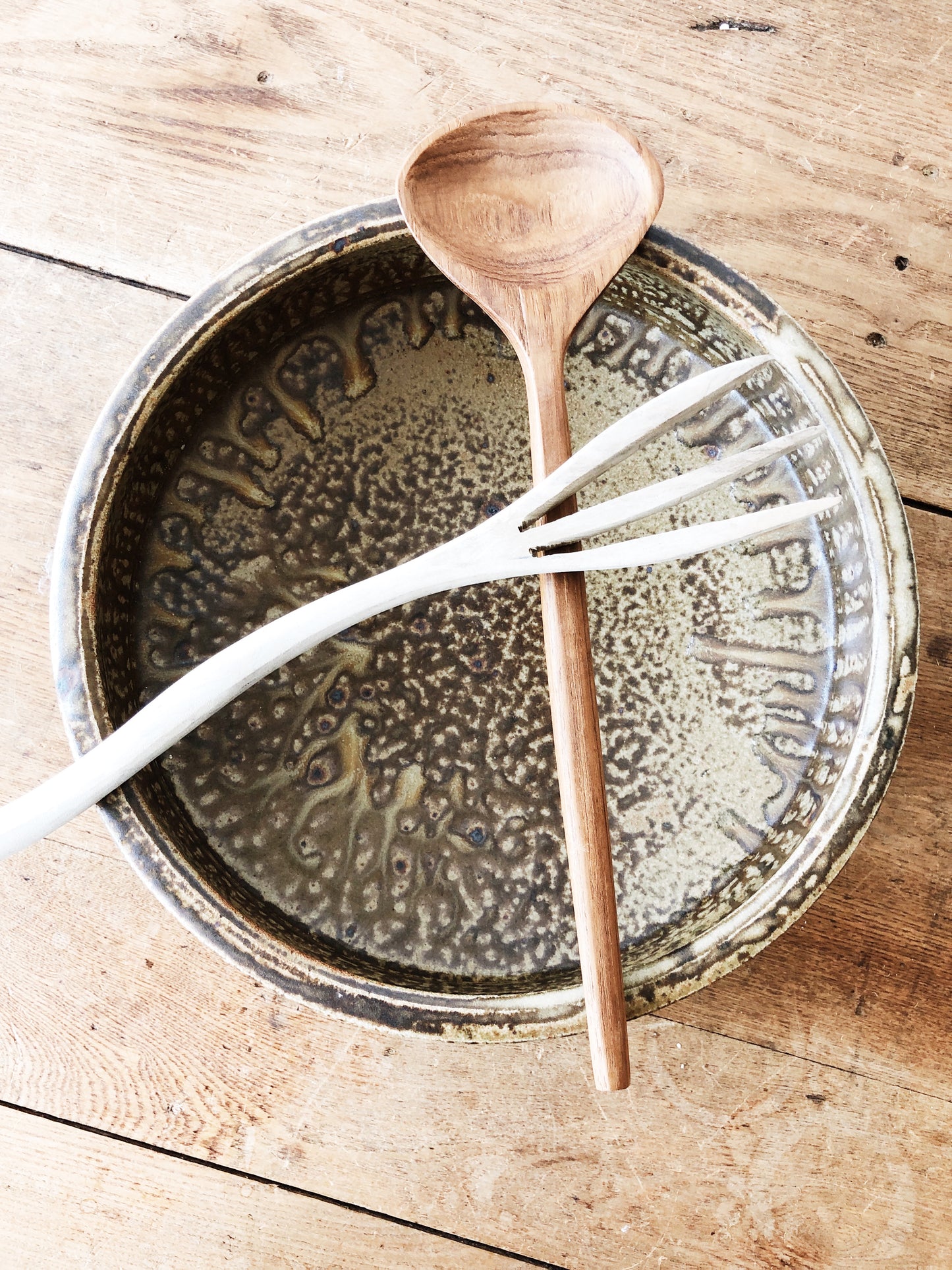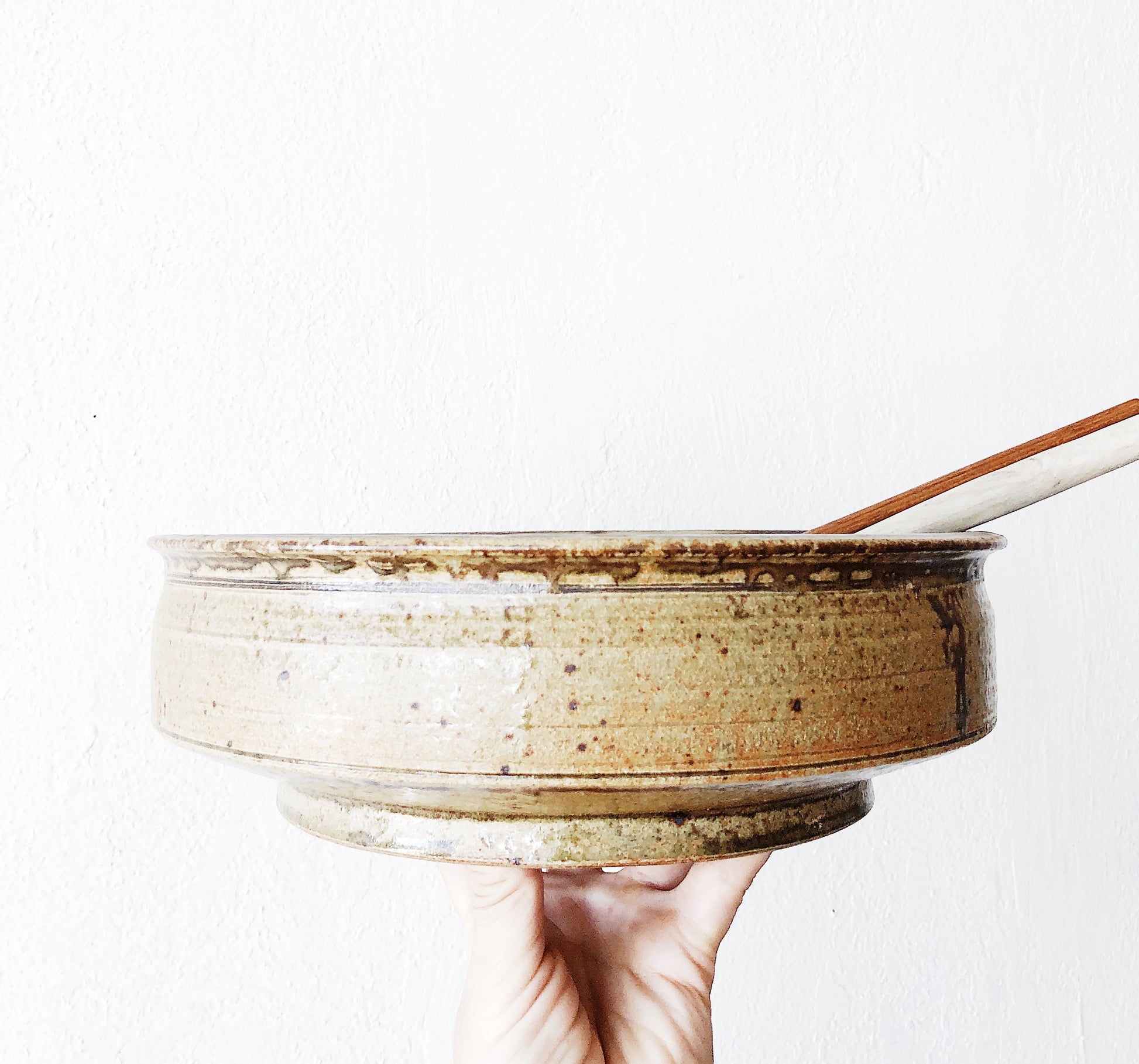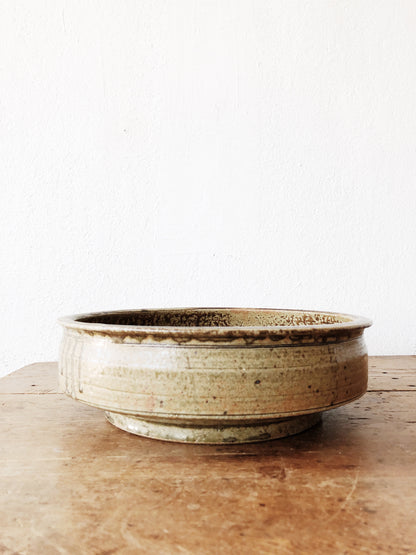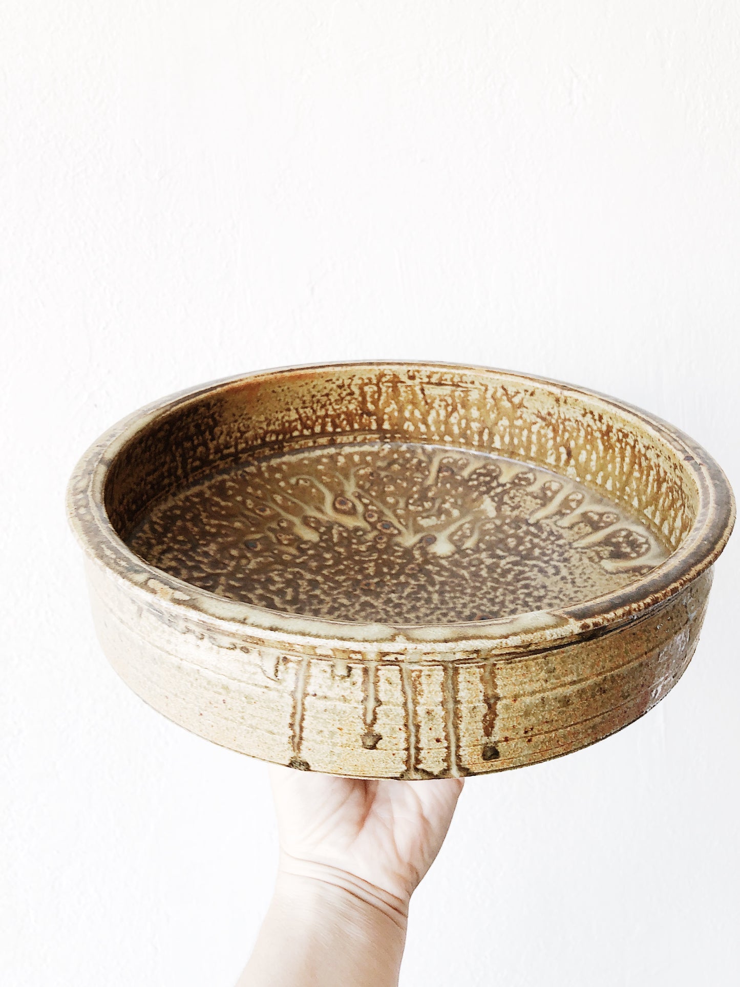 Beautifully handmade and glazed shallow ceramic bowl. Ochre in color. Nice geometric shape to the base. Perfect for serving big salads