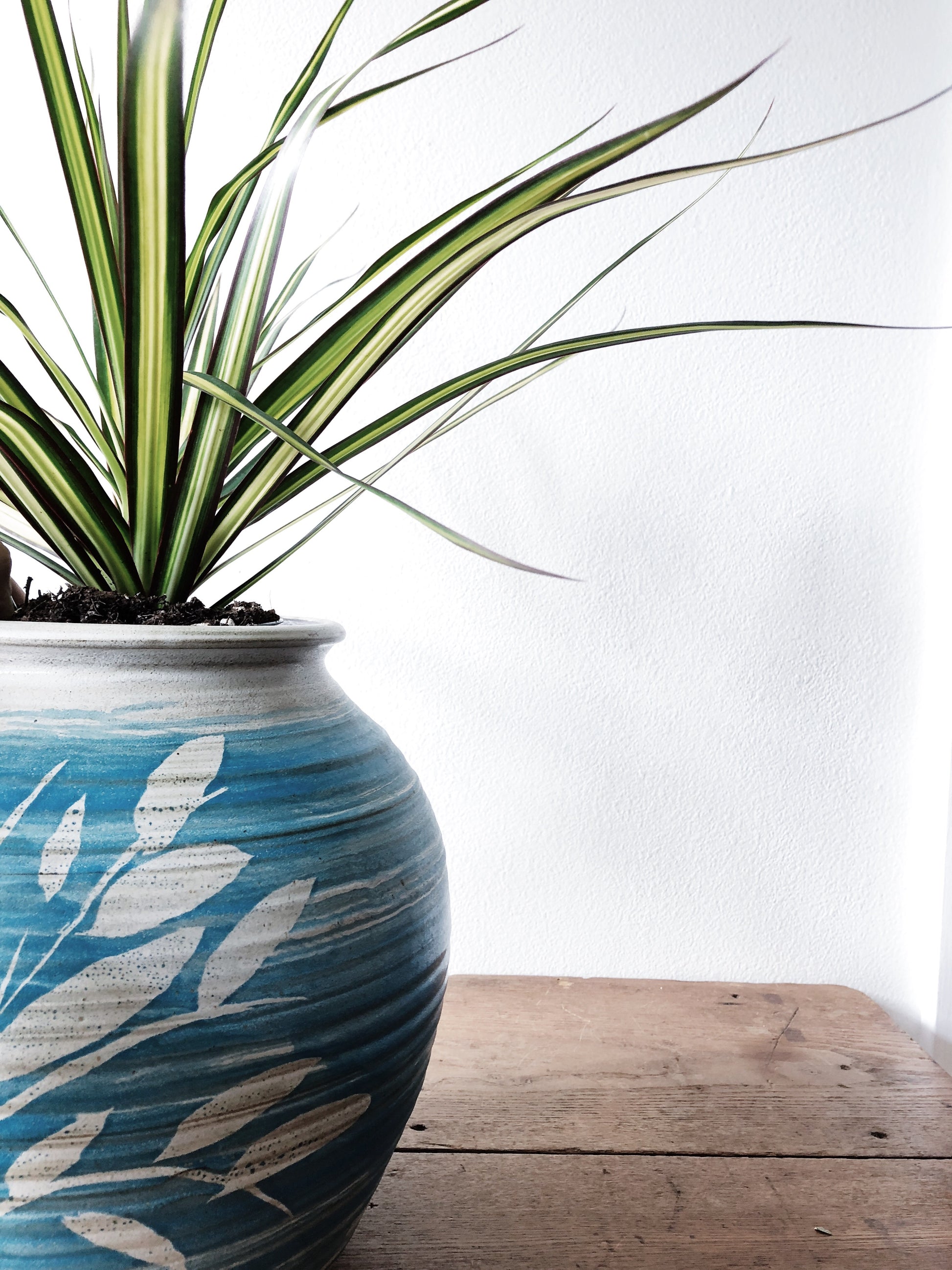 Stunning glaze on this vintage canister. Resembling a sun print, it’s a turquoise/sky blue. There is a chip on the edge of the lid but as the photo shows, it really doesn’t distract. This guy is big!
