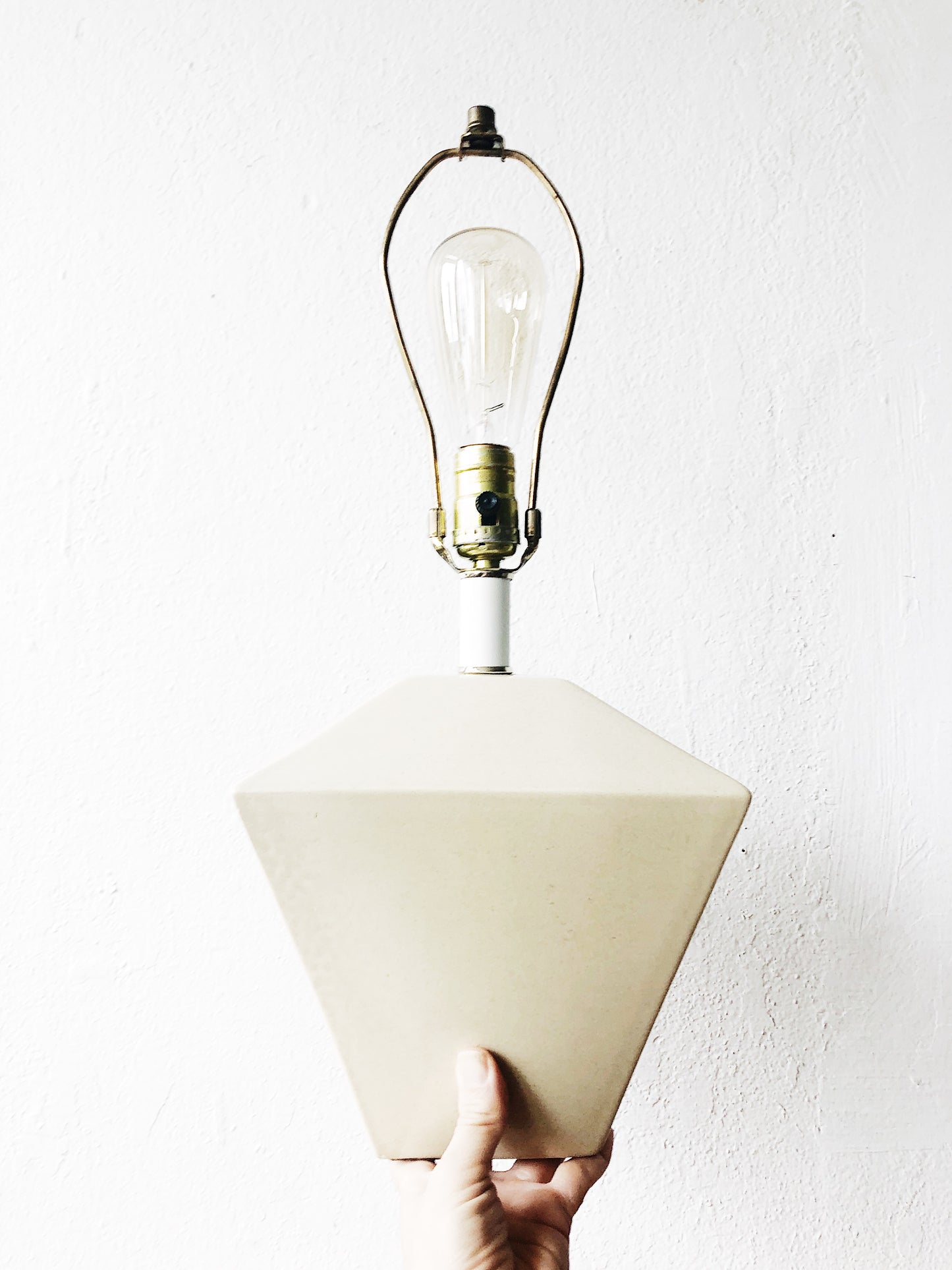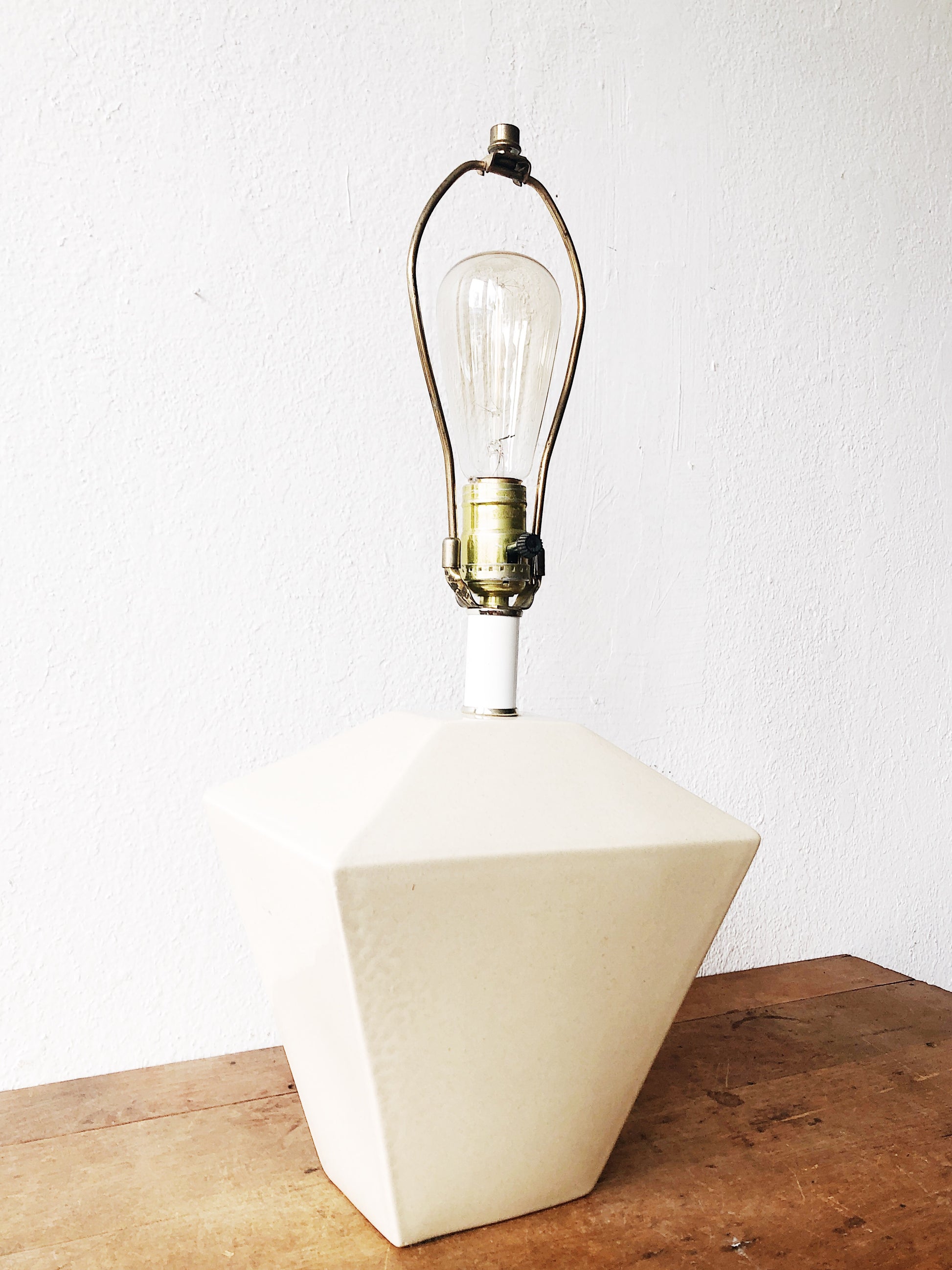 Such a great geometric shape to this vintage ceramic lamp. Color is a nice pale ecru. Comes sans shade