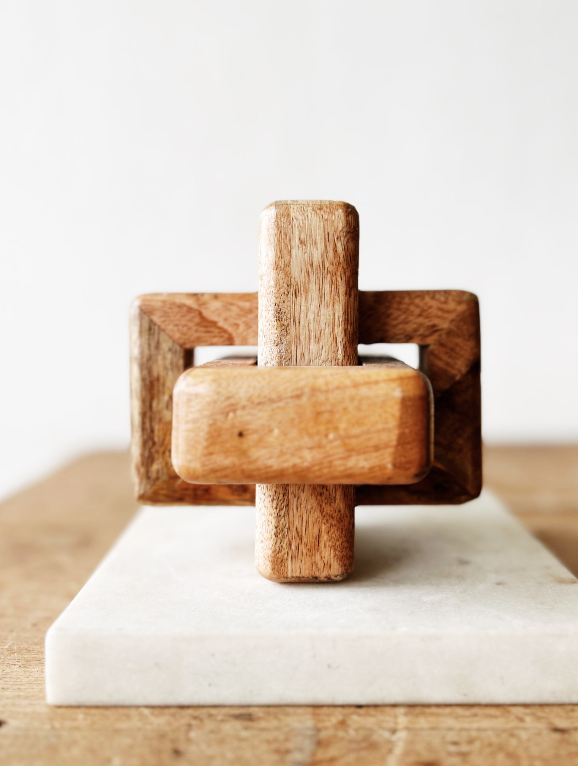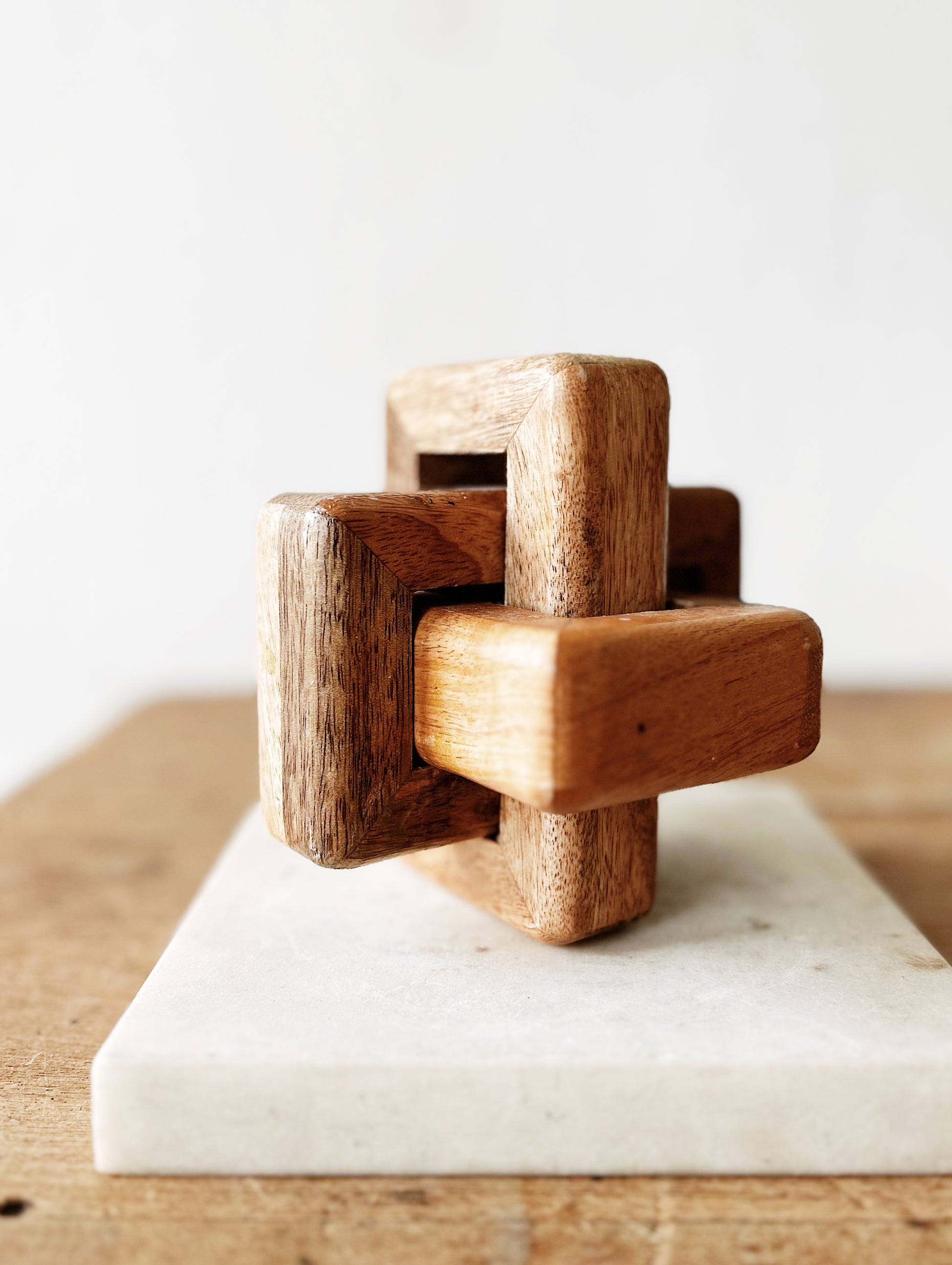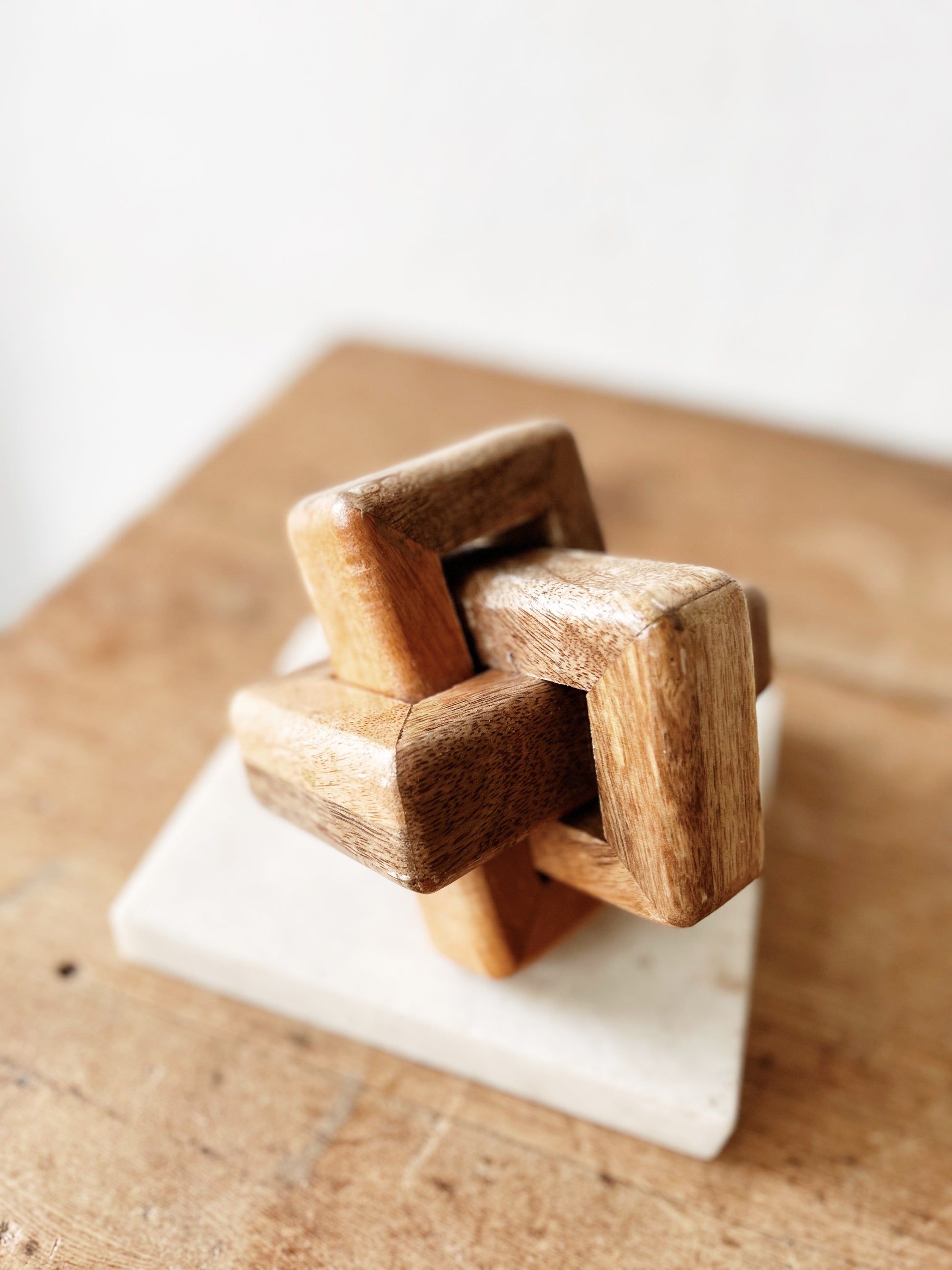 Warm oak chain link sculpture. Chunky and abstract. Great as a shelf sitter or paper weight. Marble slab not included