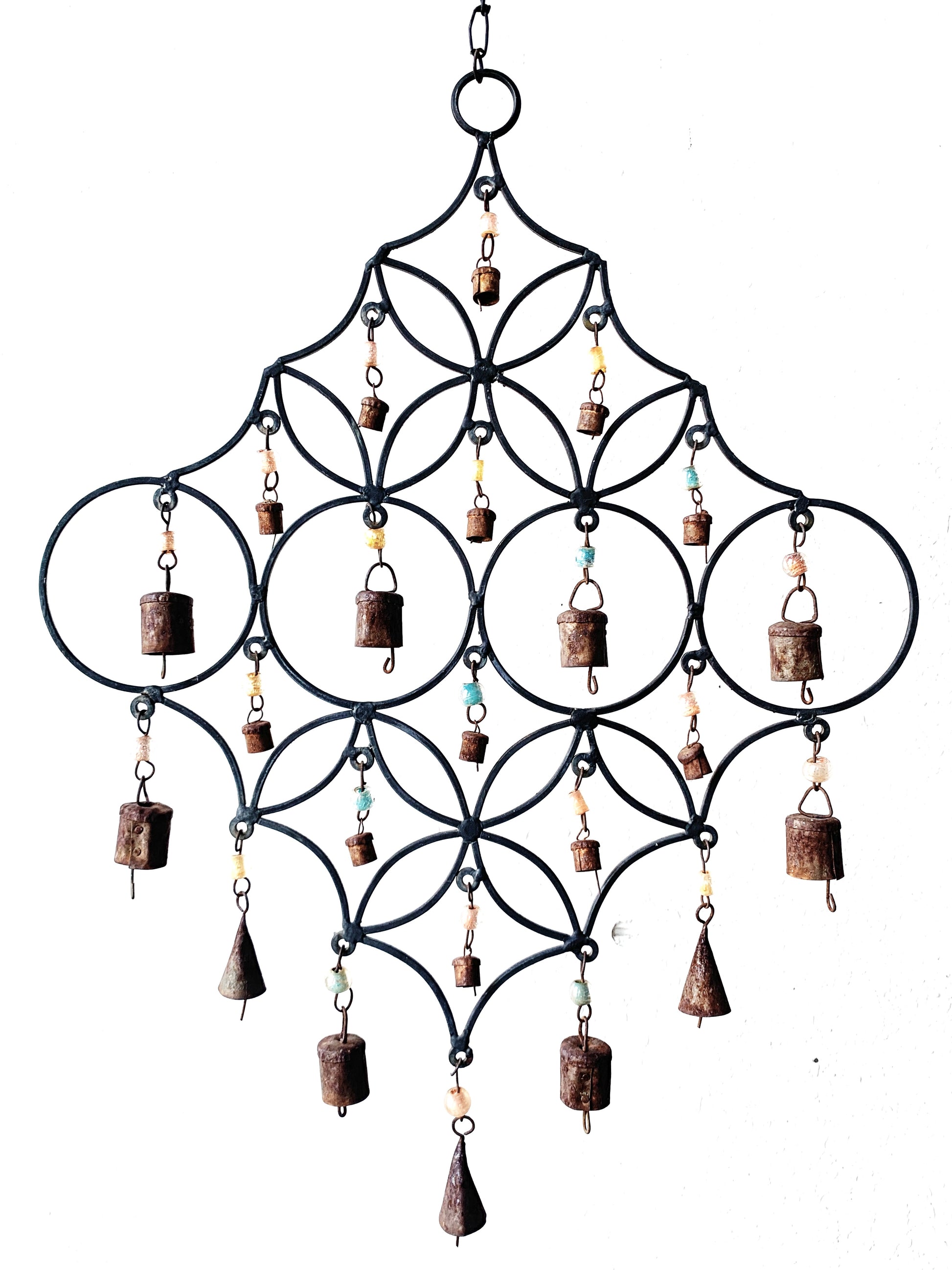 Charming iron hanging chimes with little brass bells and glass beads. Hangs on a black iron chain