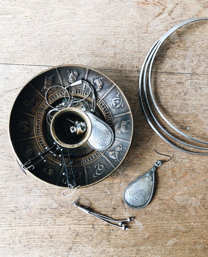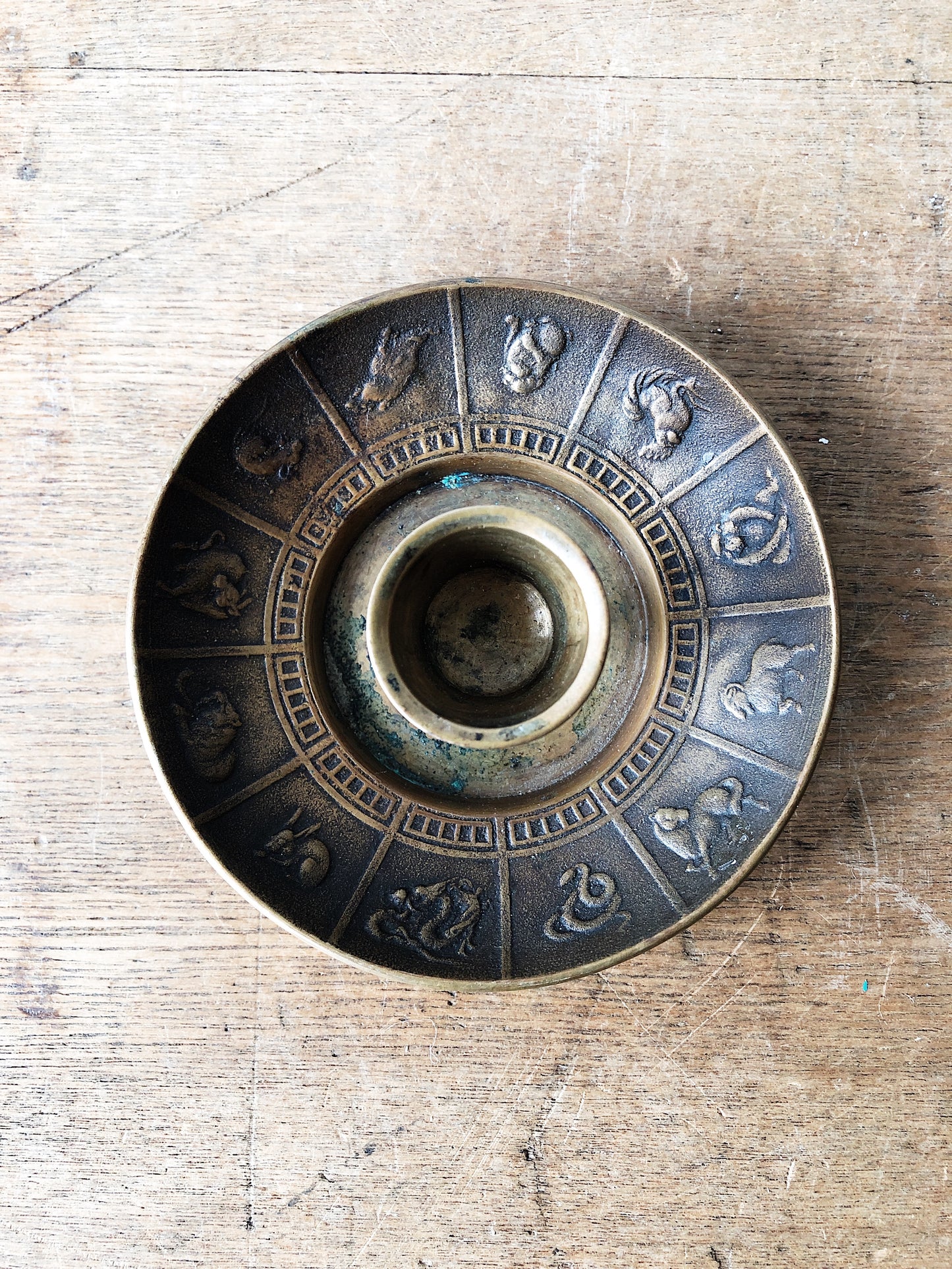 Vintage embossed brass depicting the Chinese zodiac. Actually a candlestick...but we love it as a jewelry dish.