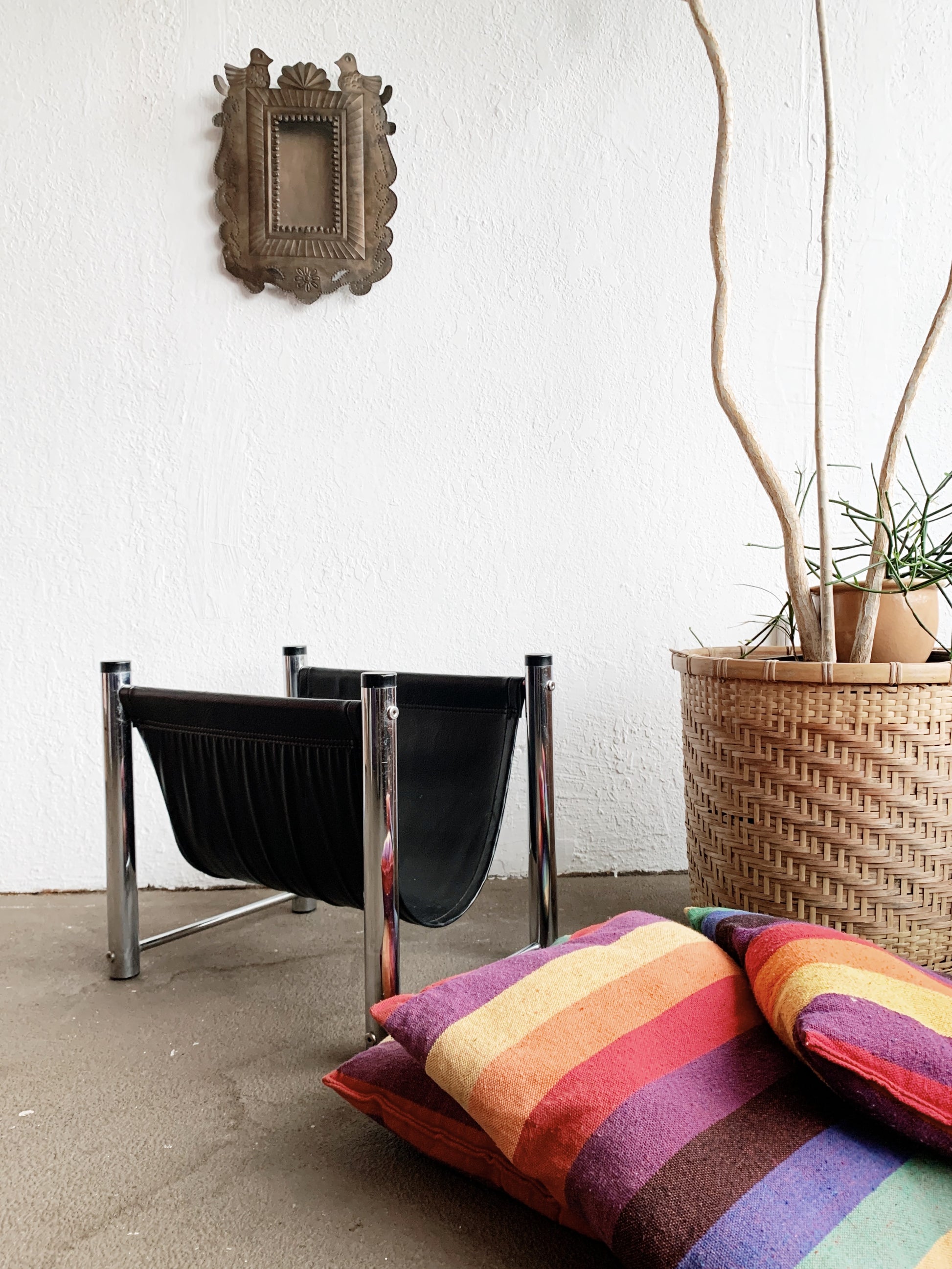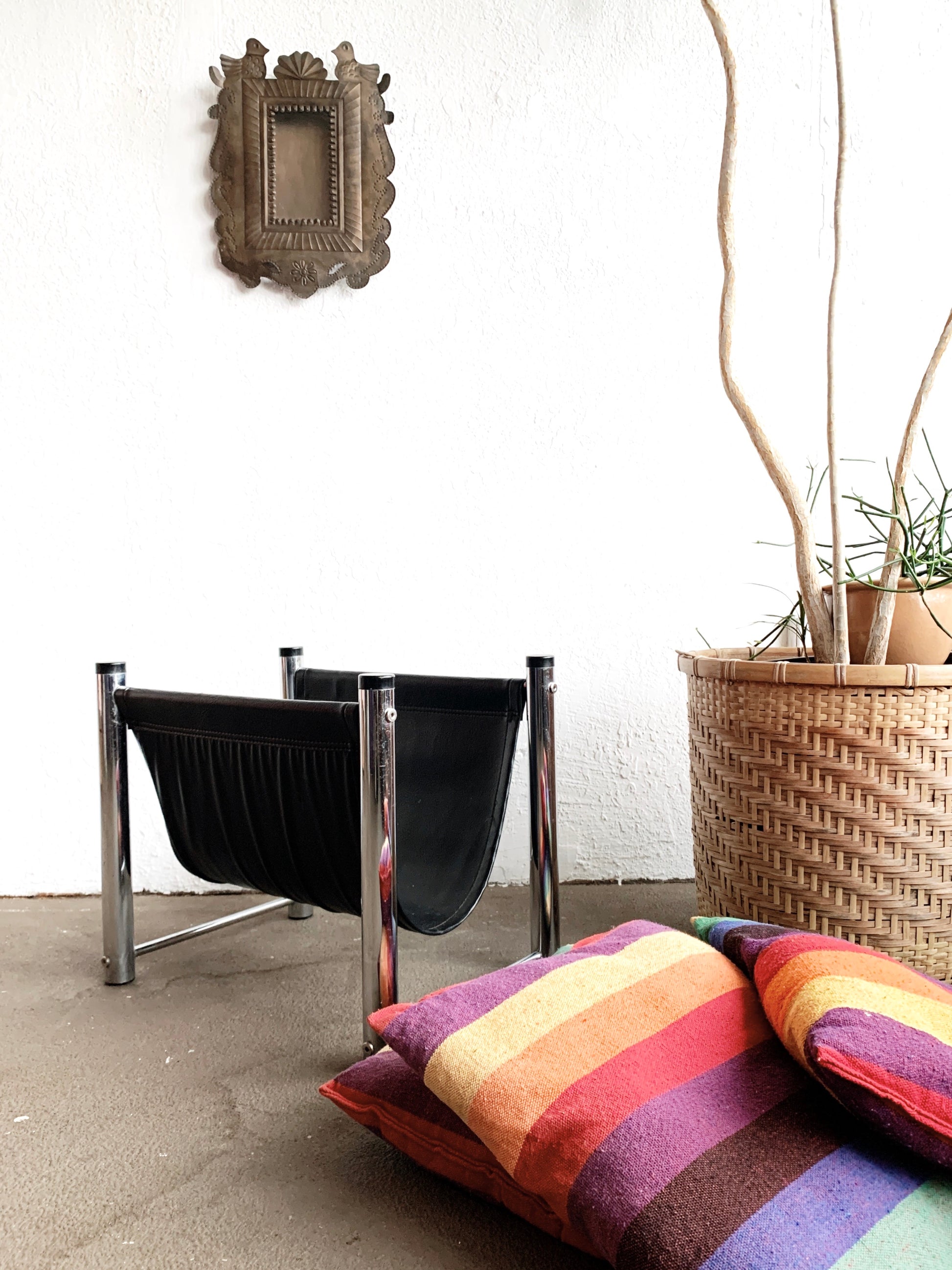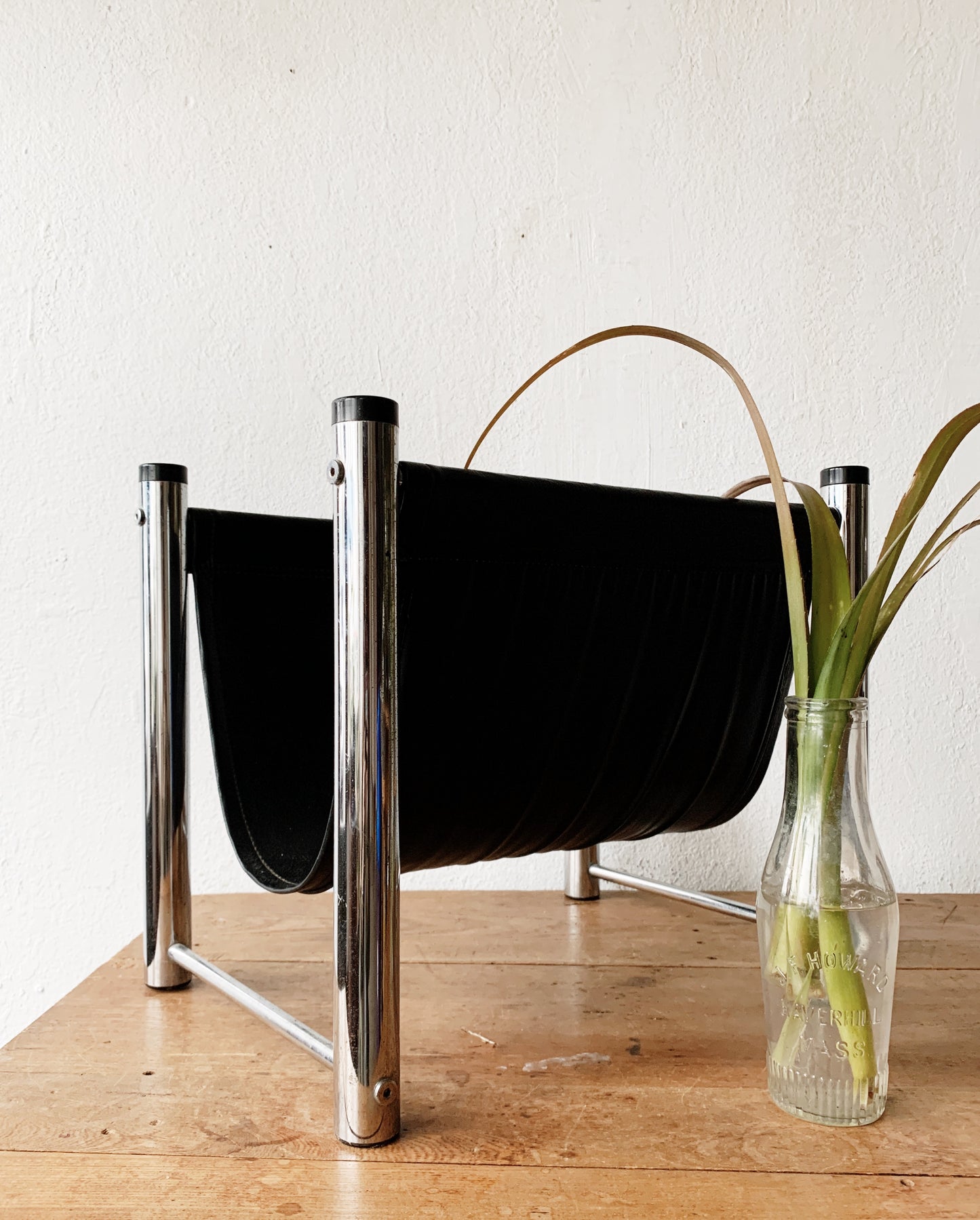 Classic vintage chrome and vinyl sling magazine holder that works great for logs/ kindling too
