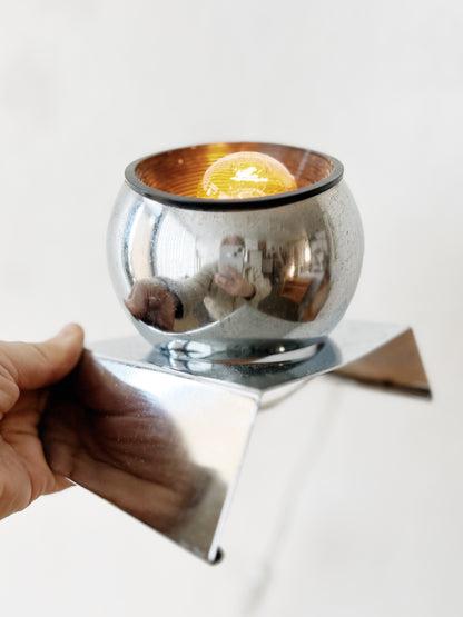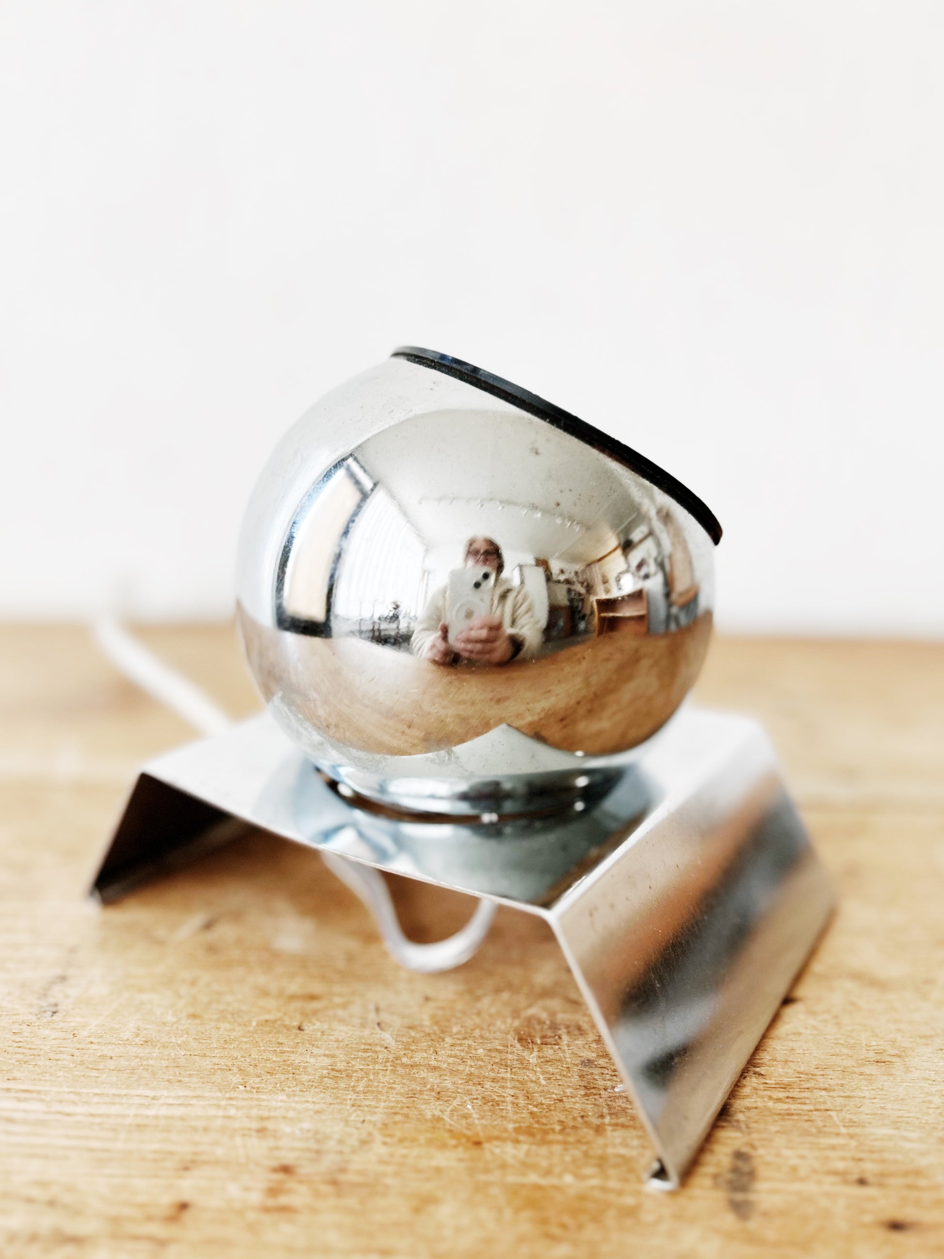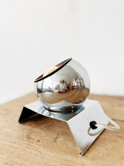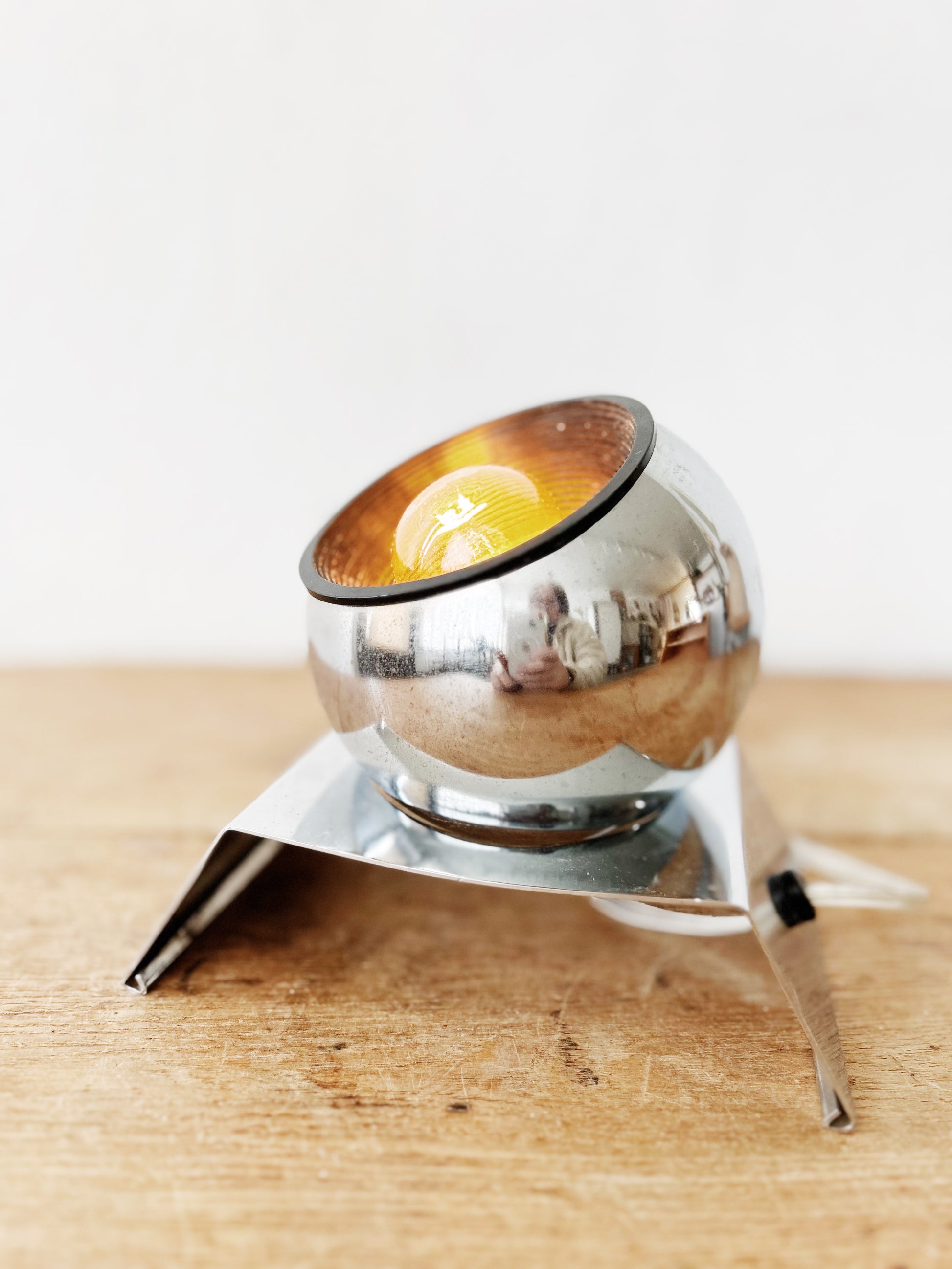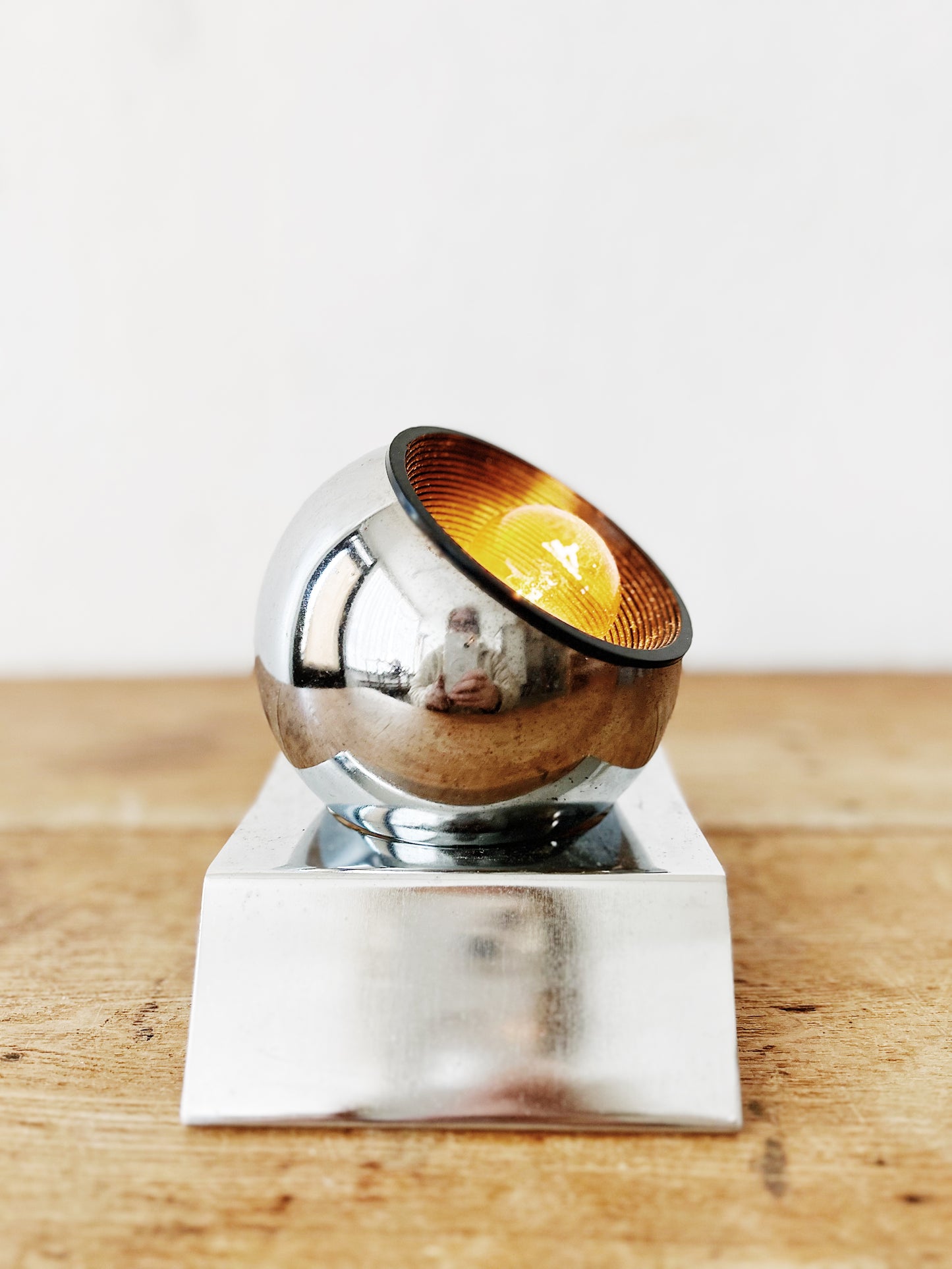 Nice little post mod vintage spot light. The eyeball is directional on the base. Great for up lighting art or a special plant. We use a 40w appliance bulb. On switch rocker.