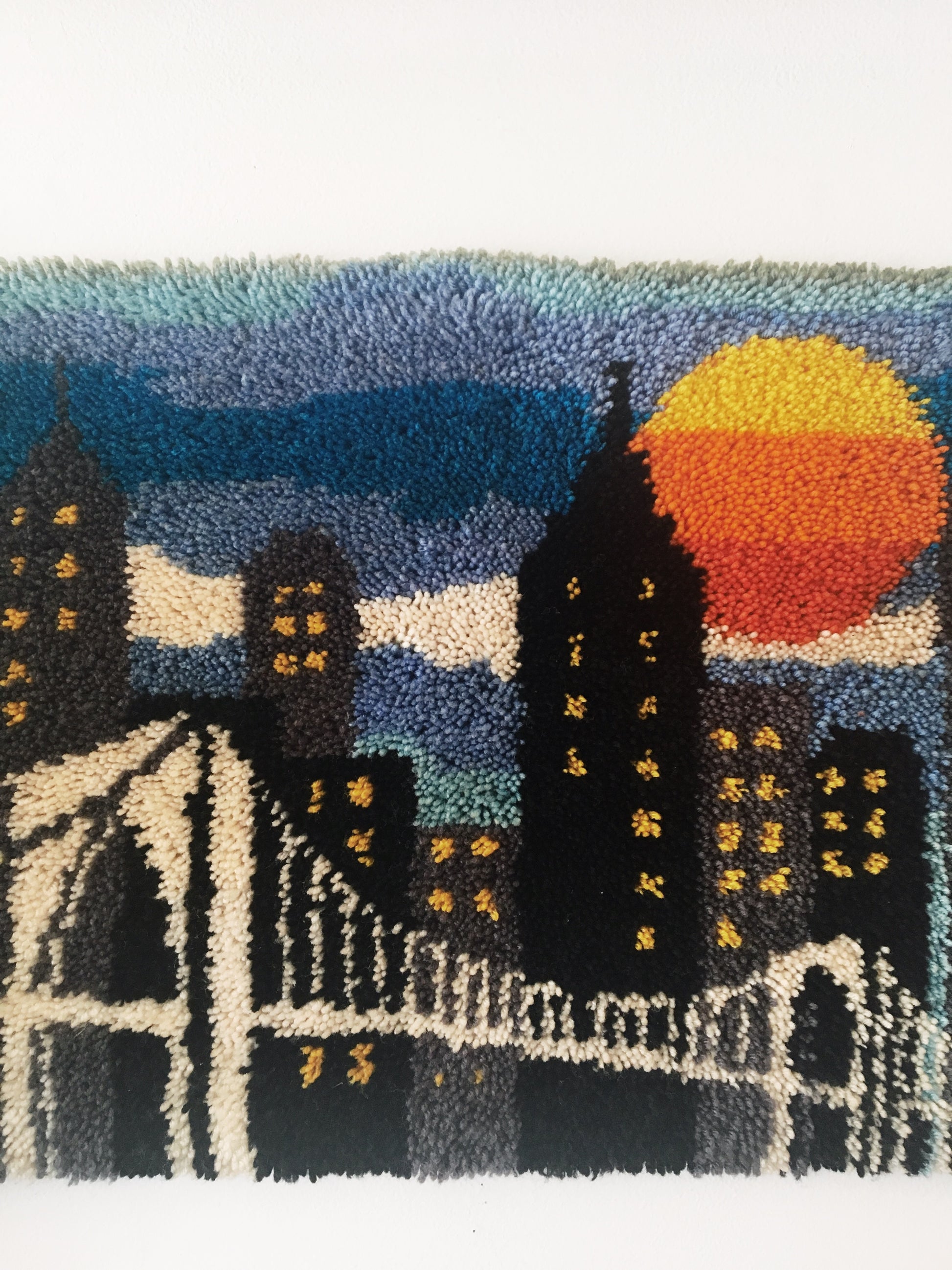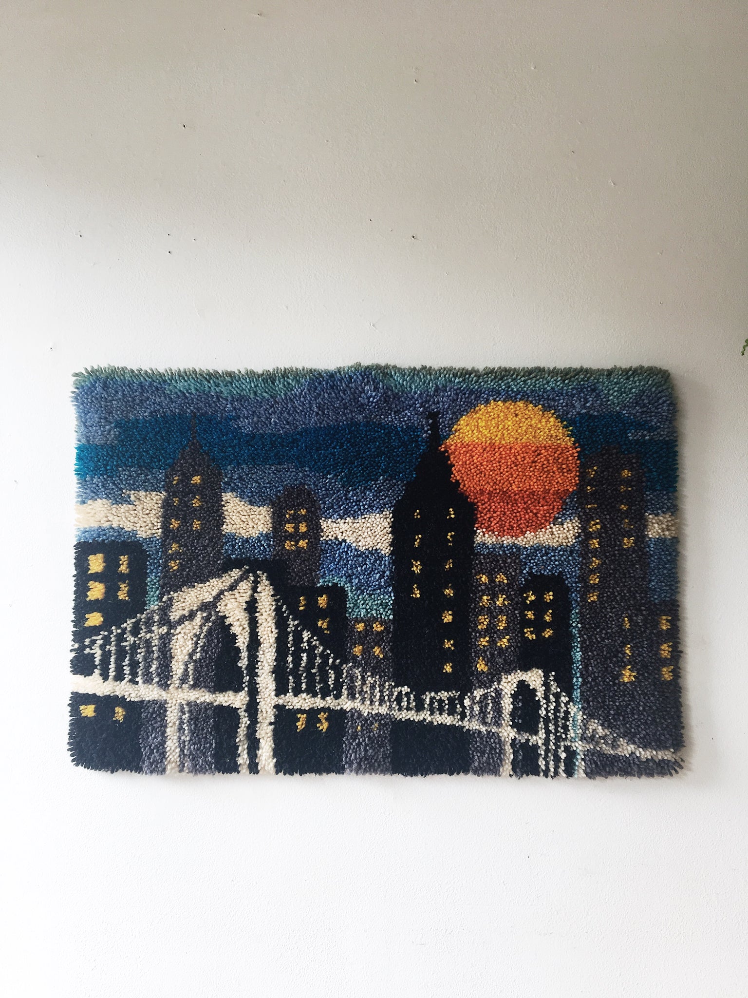 Colorful vintage latch with wood dowel for ease of hanging. Love this! In nice condition.