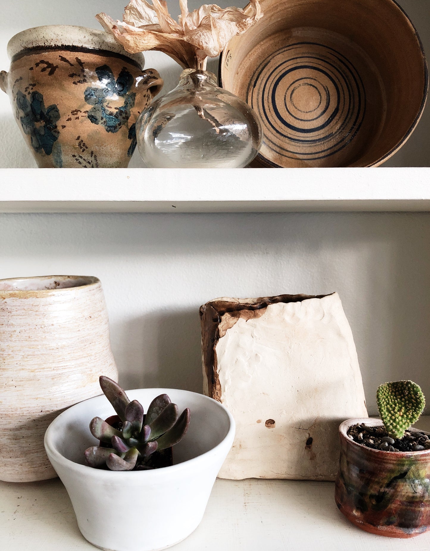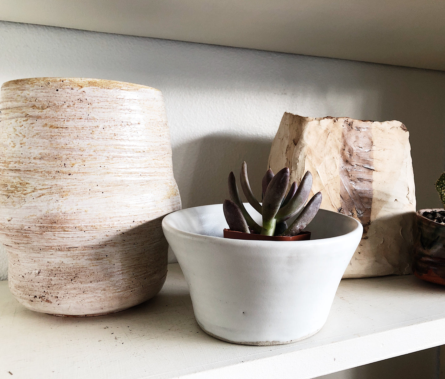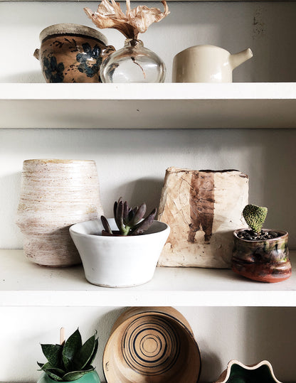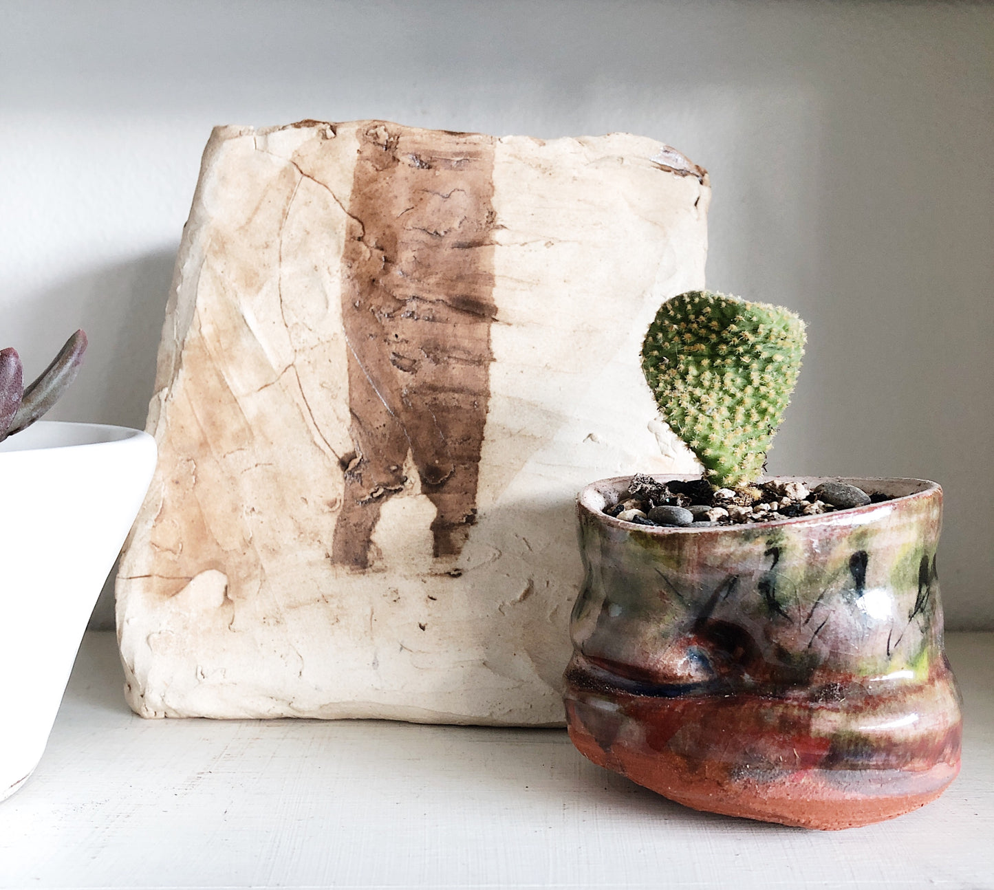 Love the warm soft tones on this modernist vase. Irregular trapezoid shape. Different designs on front and back. Tactile soft feel