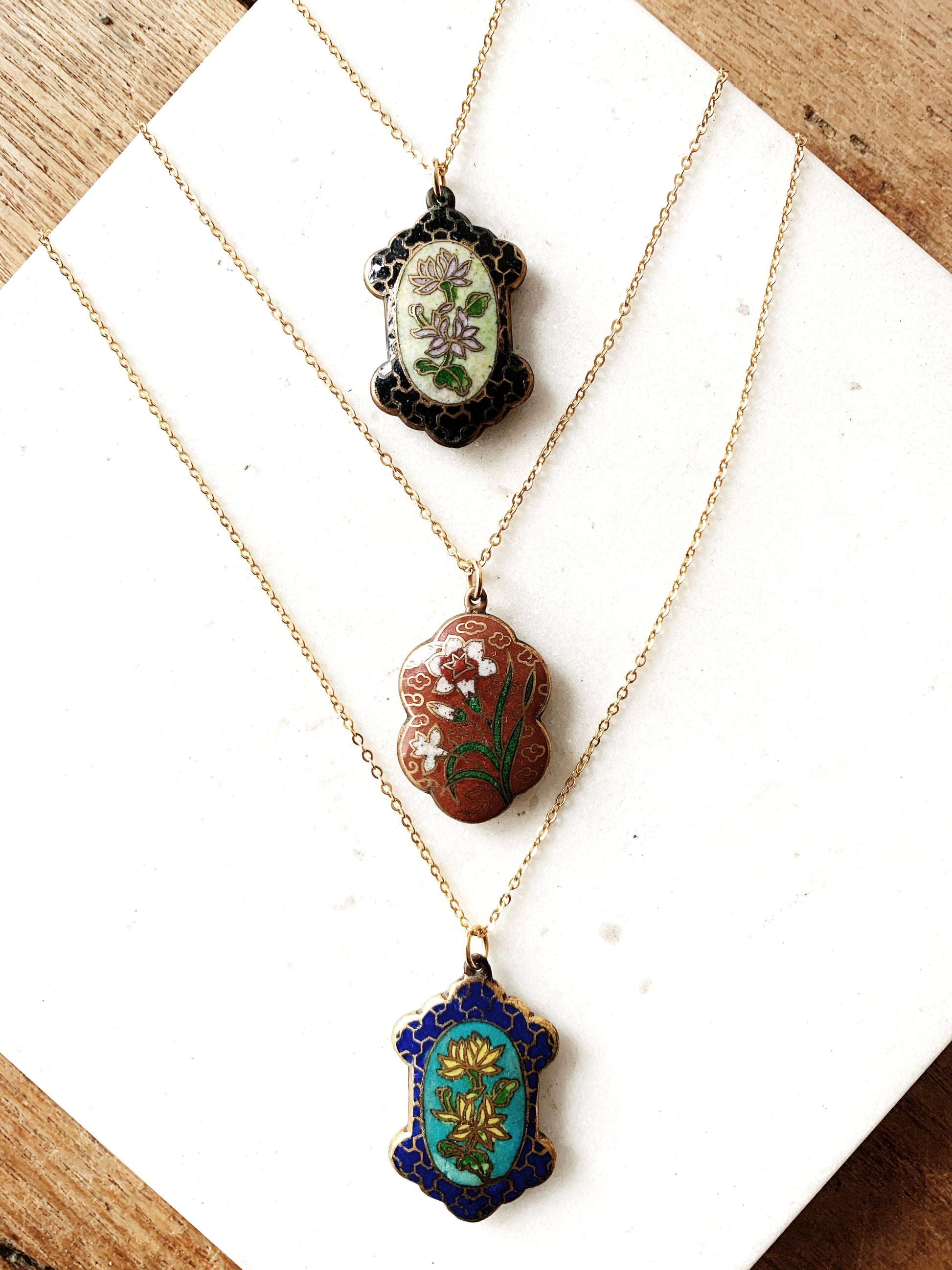 Really pretty vintage Cloisonné pendant on newer gold fill chain. Please select your color choice at checkout
