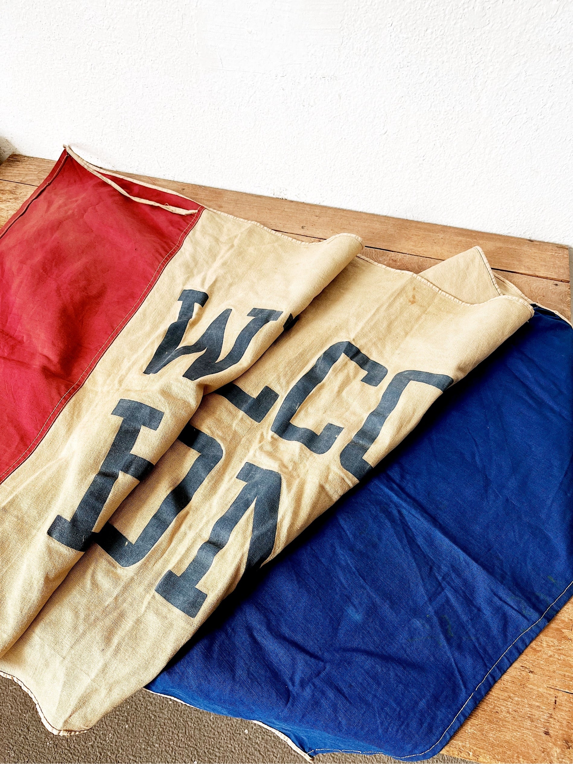 Old thin canvas banner with printed Welcome Home. Most likely as a loving message for troops returning from the war. We think this would be pretty cool hanging over a front door