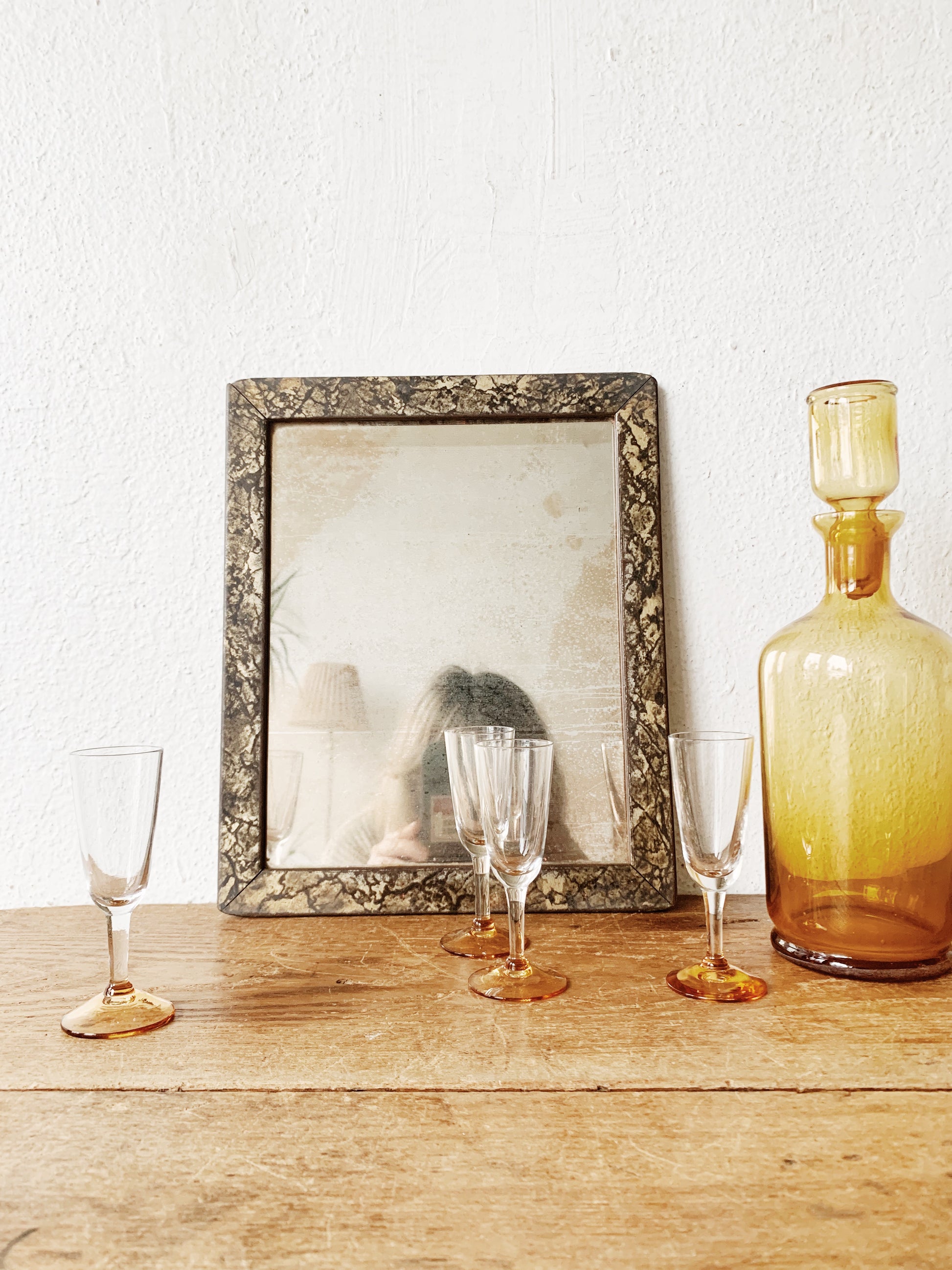 What a pretty set here. Four aperitif glasses with amber bottoms, amber glass decanter and antique mirror tray.