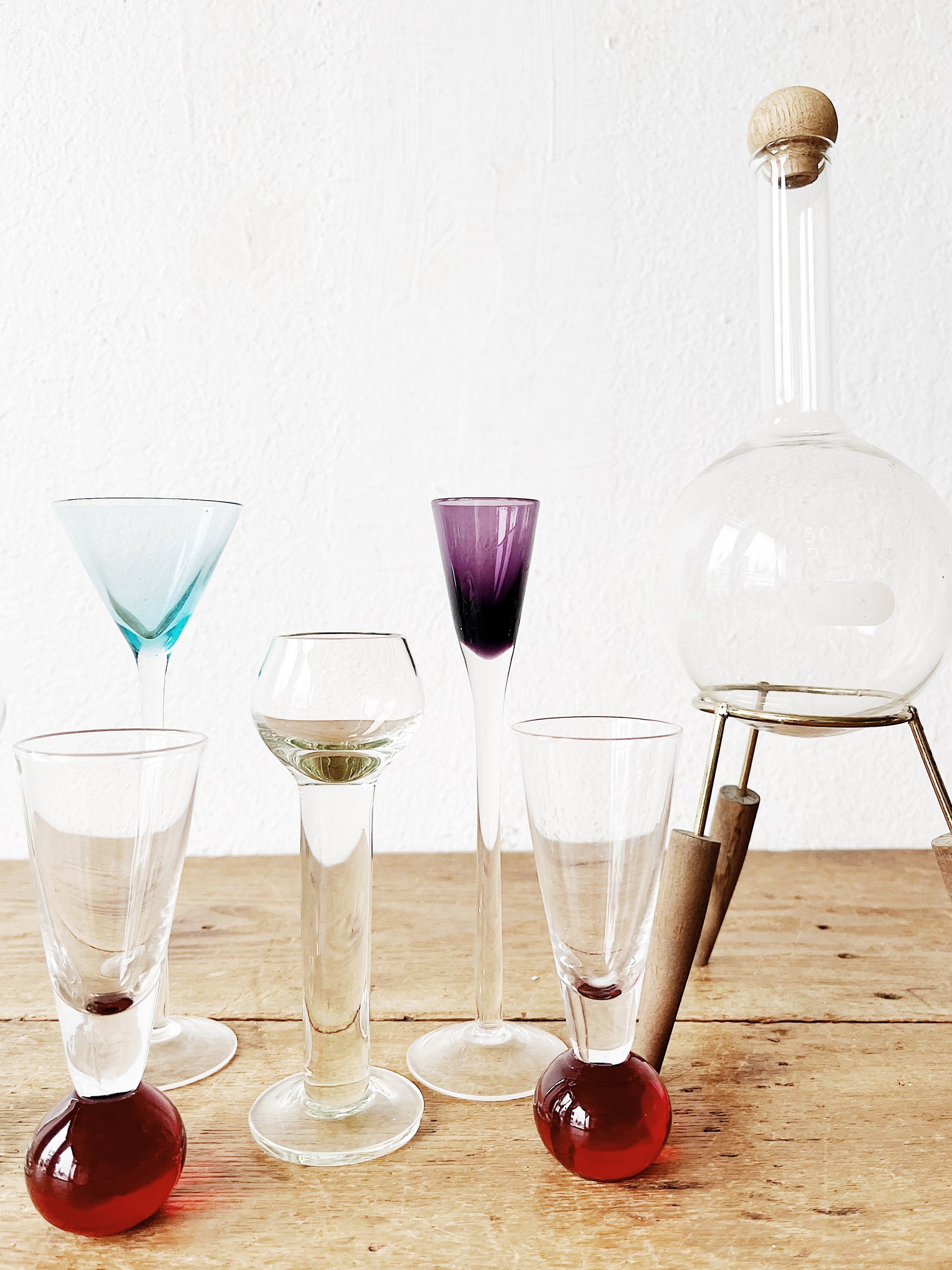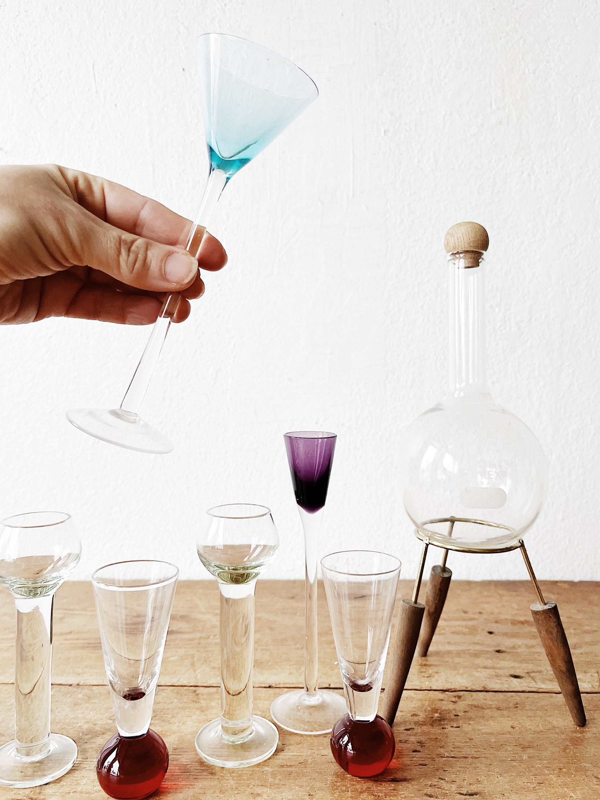 A unique combination makes this set super fun. Vintage and modern colored and blown glasses are perfect for aperitifs, mezcal and yes, tequila shots. Vintage Pyrex boiling flask with wooden stopper and stand for pouring your favorite ( you could even warm the liquid with a tea light below
