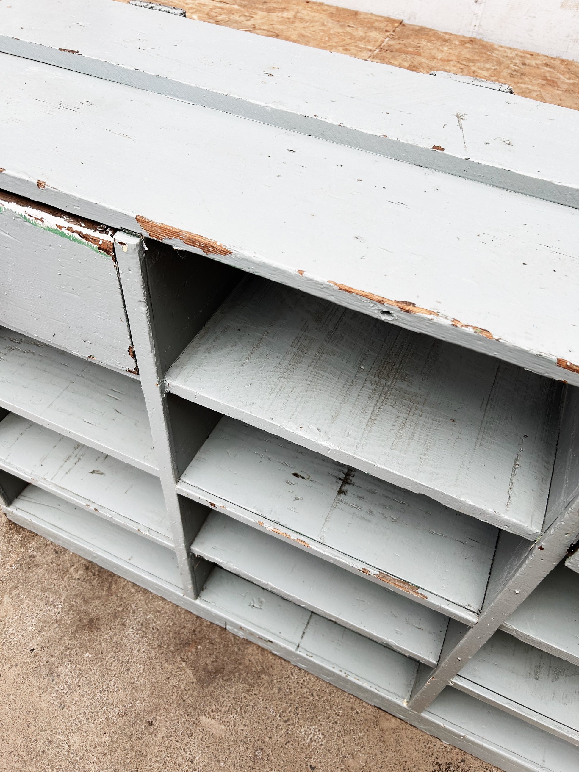 Nice pale blue paint covers solid wood. Two drawers which can be moved into any of the cubbies. Wonderful for Storage and display. A very unique look. Hand made