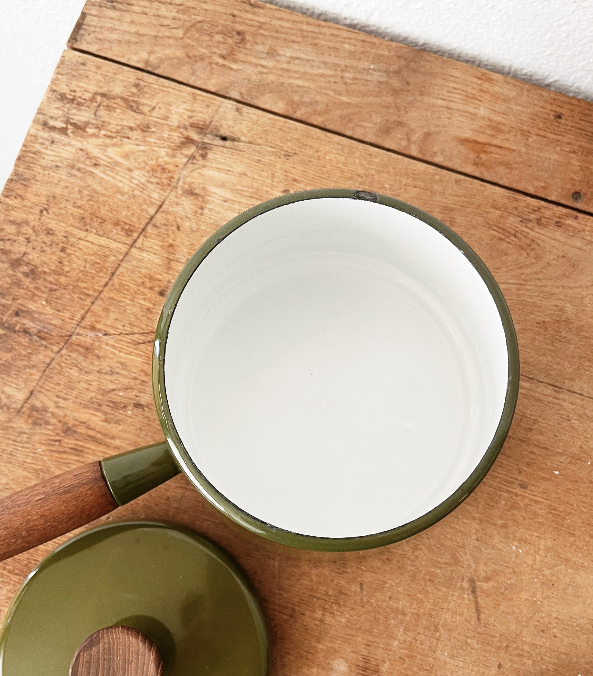 Enameled olive green pan with wood handle sits atop a cast iron stand. Includes the sterno heat. In wonderful condition!