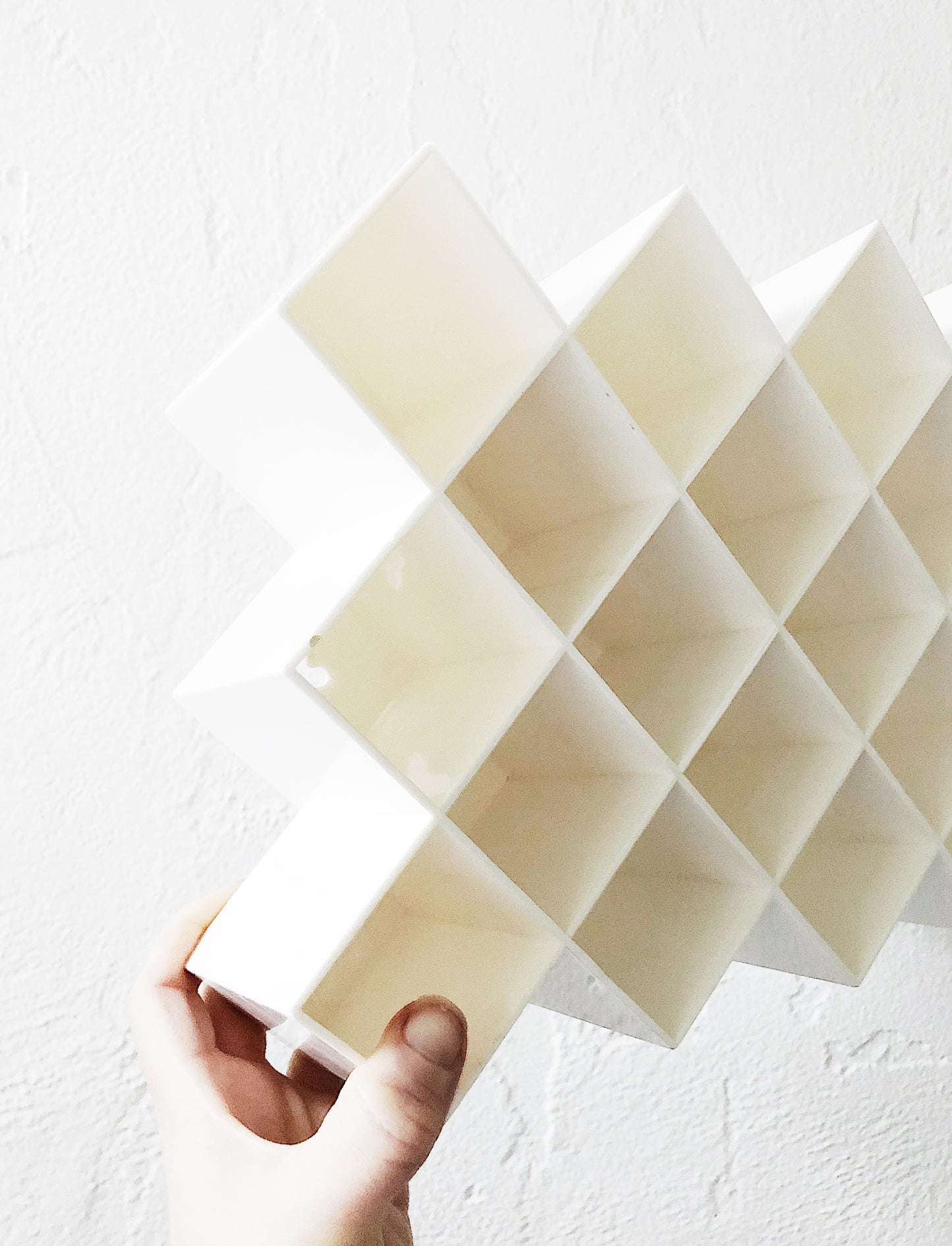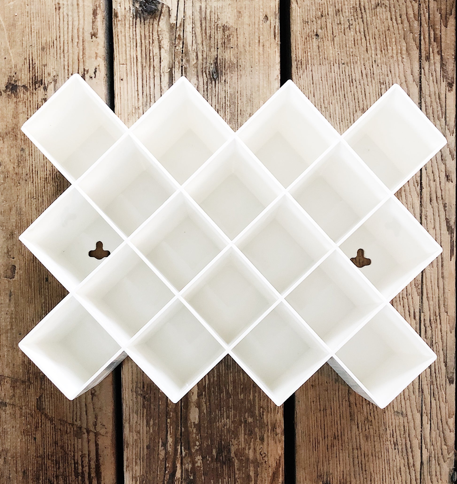 Vintage copco organizer for the wall. This was originally a spice rack but can hold a multitude of other small bits too. Heavy USA MADE plastic with dimensional beehive design. Also could sit on a surface