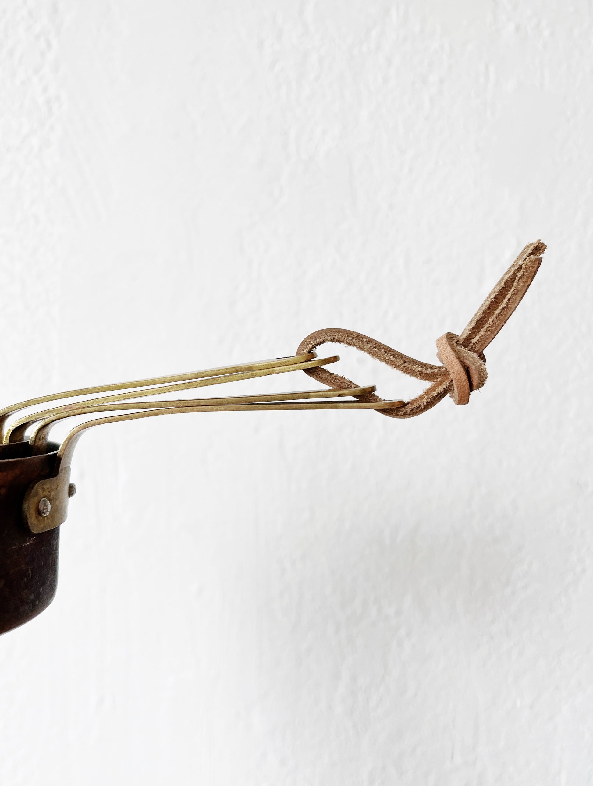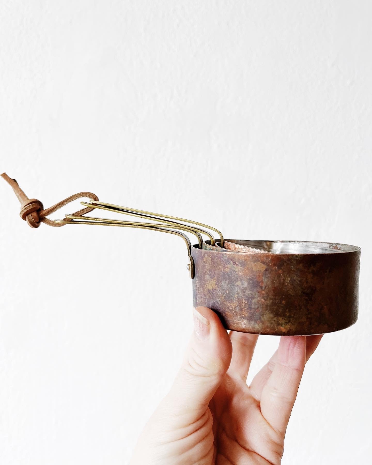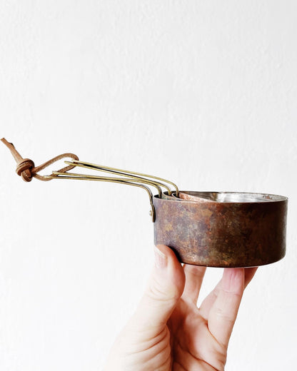A set of four copper plated measures 1c 3/4c 1/2 and 1/4c with great handles and patina. The copper plating has rubbed off on the interior revealing the aluminum casing. Tied with leather
