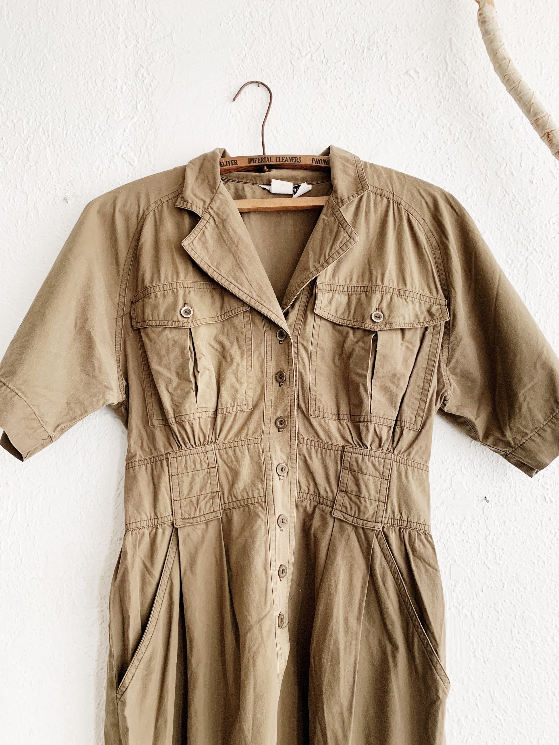 Vintage 80’s cotton dress with pockets. Size 6, in great condition. union label, USA made. Knee length, khaki olive color