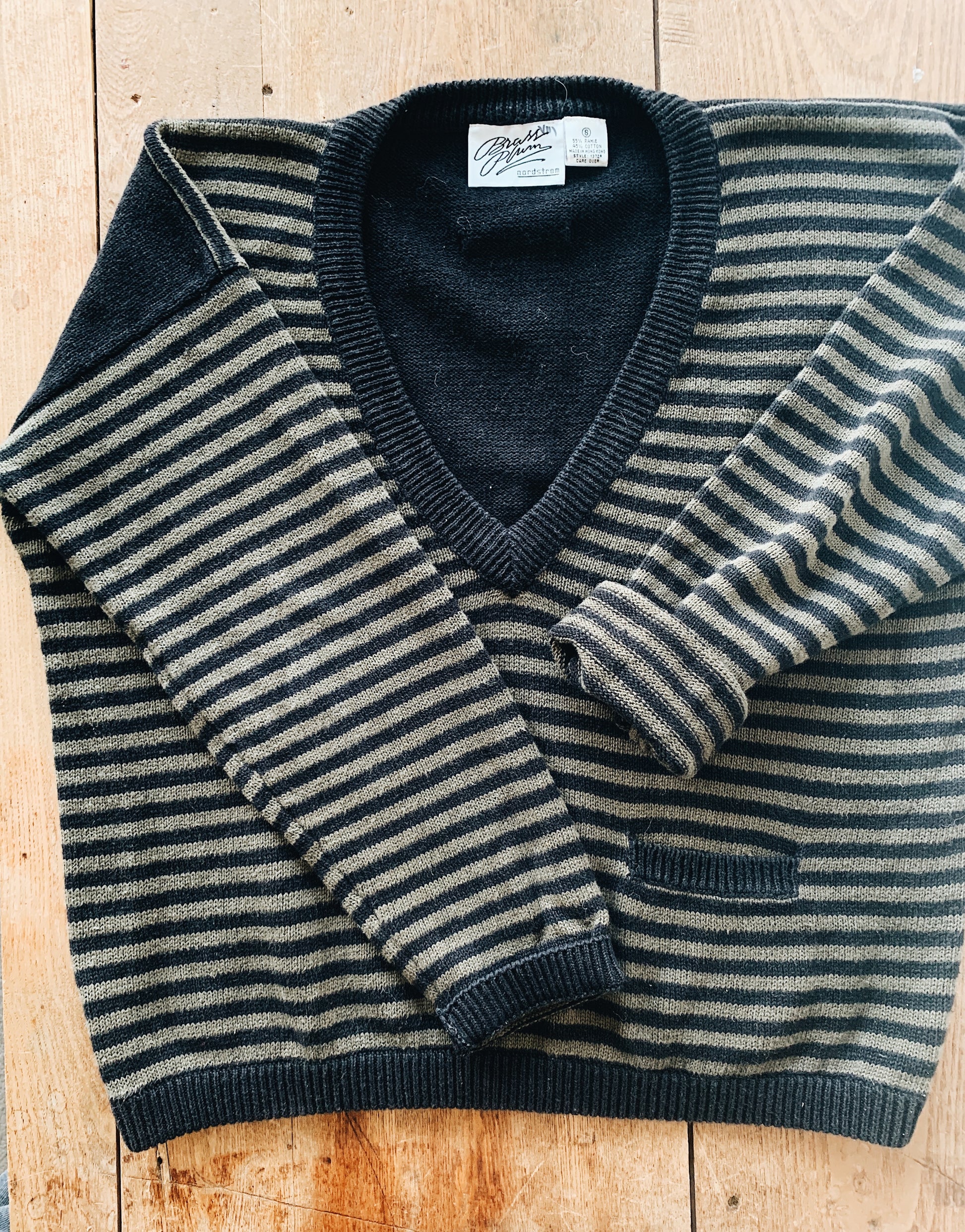 Vintage cotton deep v neck sweater in black with olive green stripes. Little pocket. Super soft and slouchy. Excellent condition. Size medium, slightly cropped.