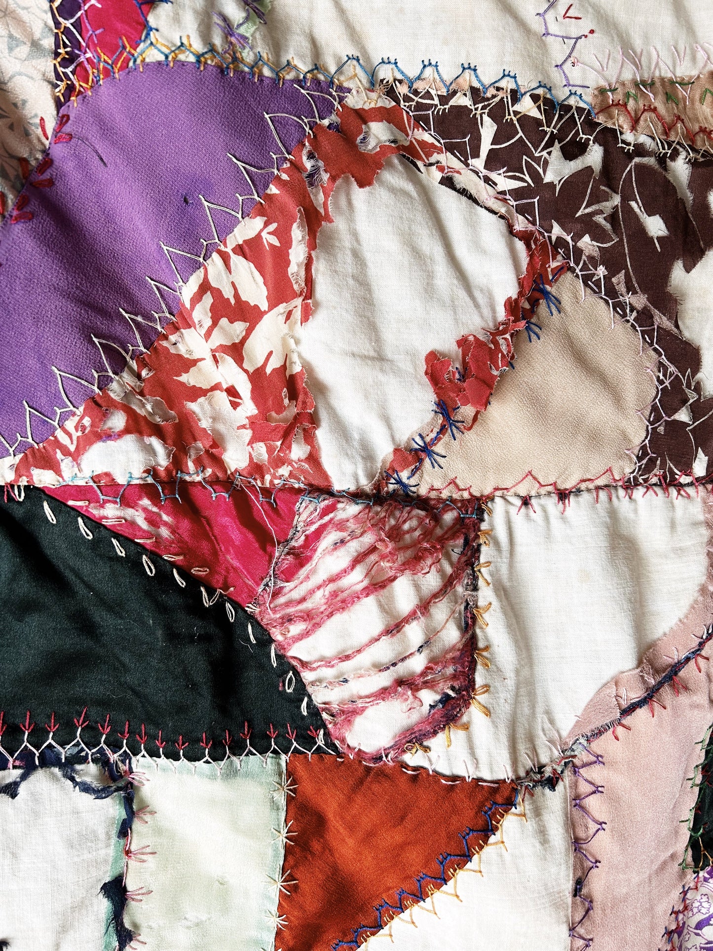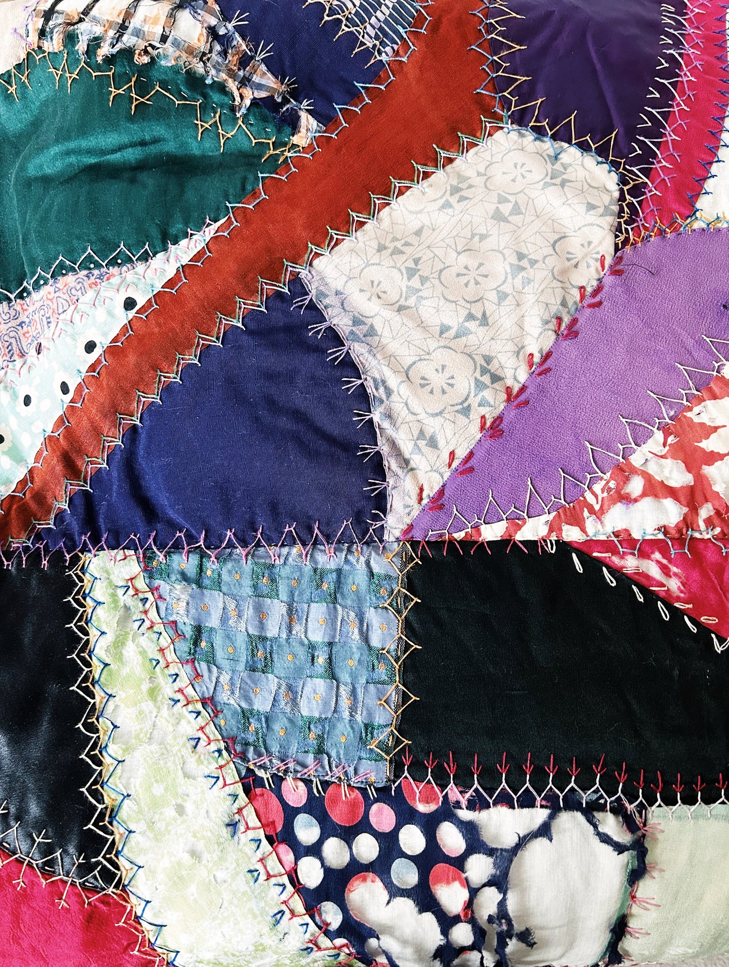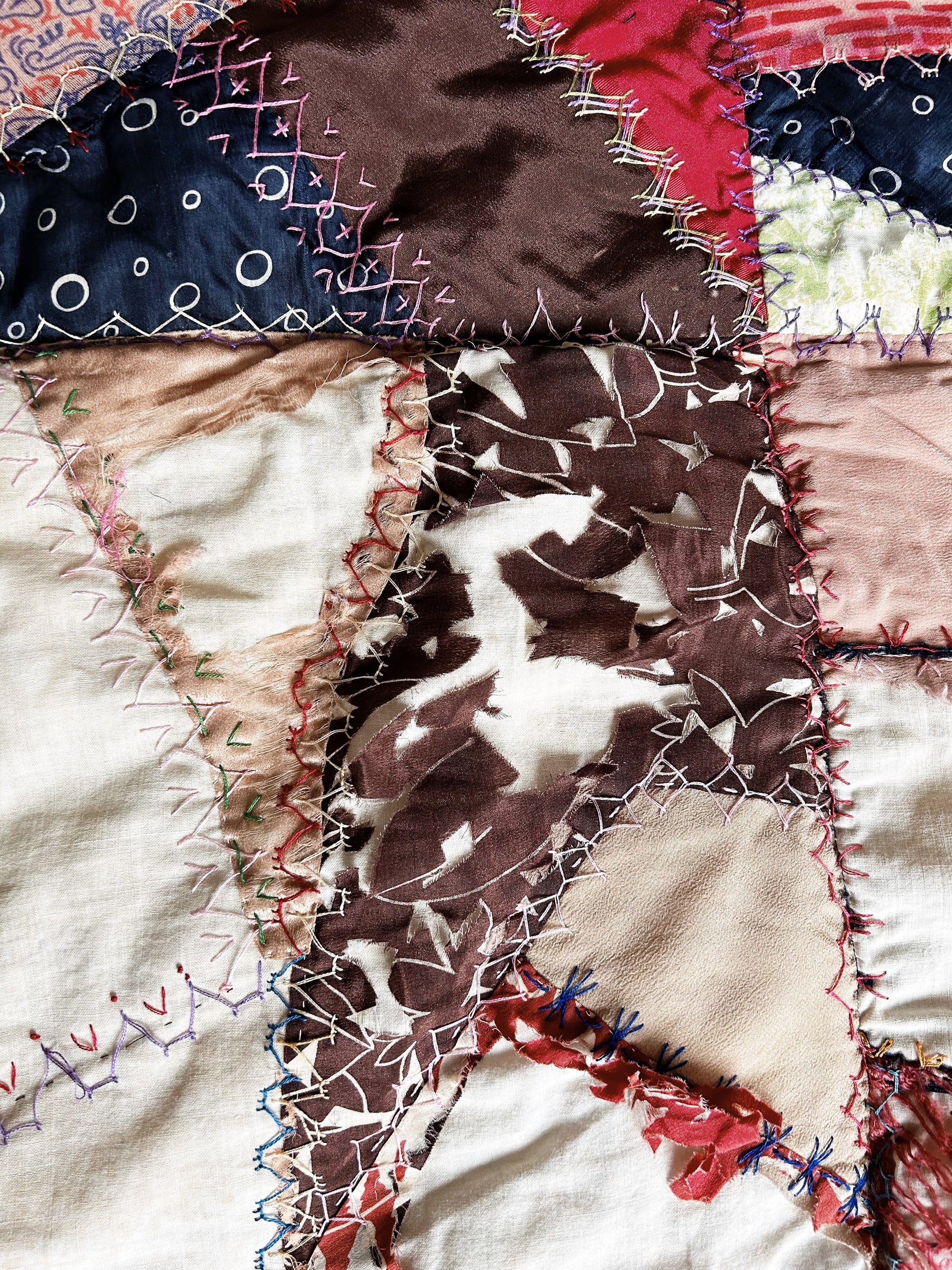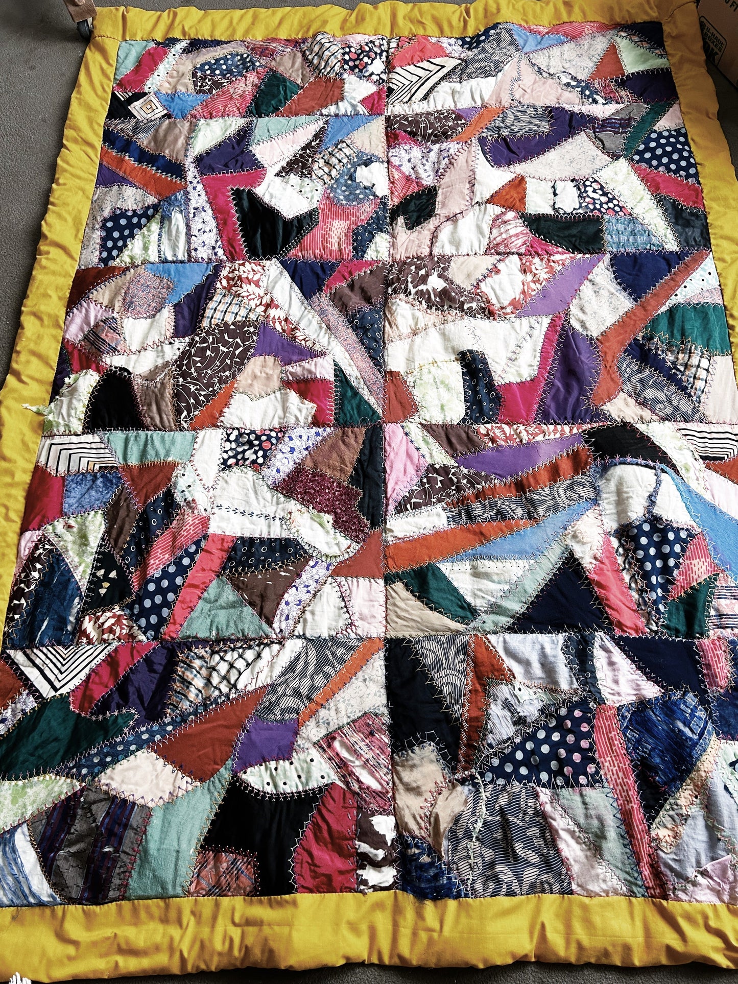 Mid weight hand sewn vintage cotton and silk patchwork quilt. Such a fun one. Some of the patches are frayed - see photos. Reverses to solid goldenrod. No stains or funky smells.