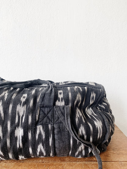 Vintage cotton ikat duffle bag with four handles, short and long. Great overnighter bag! Clean and in great condition. Black and white ikat.