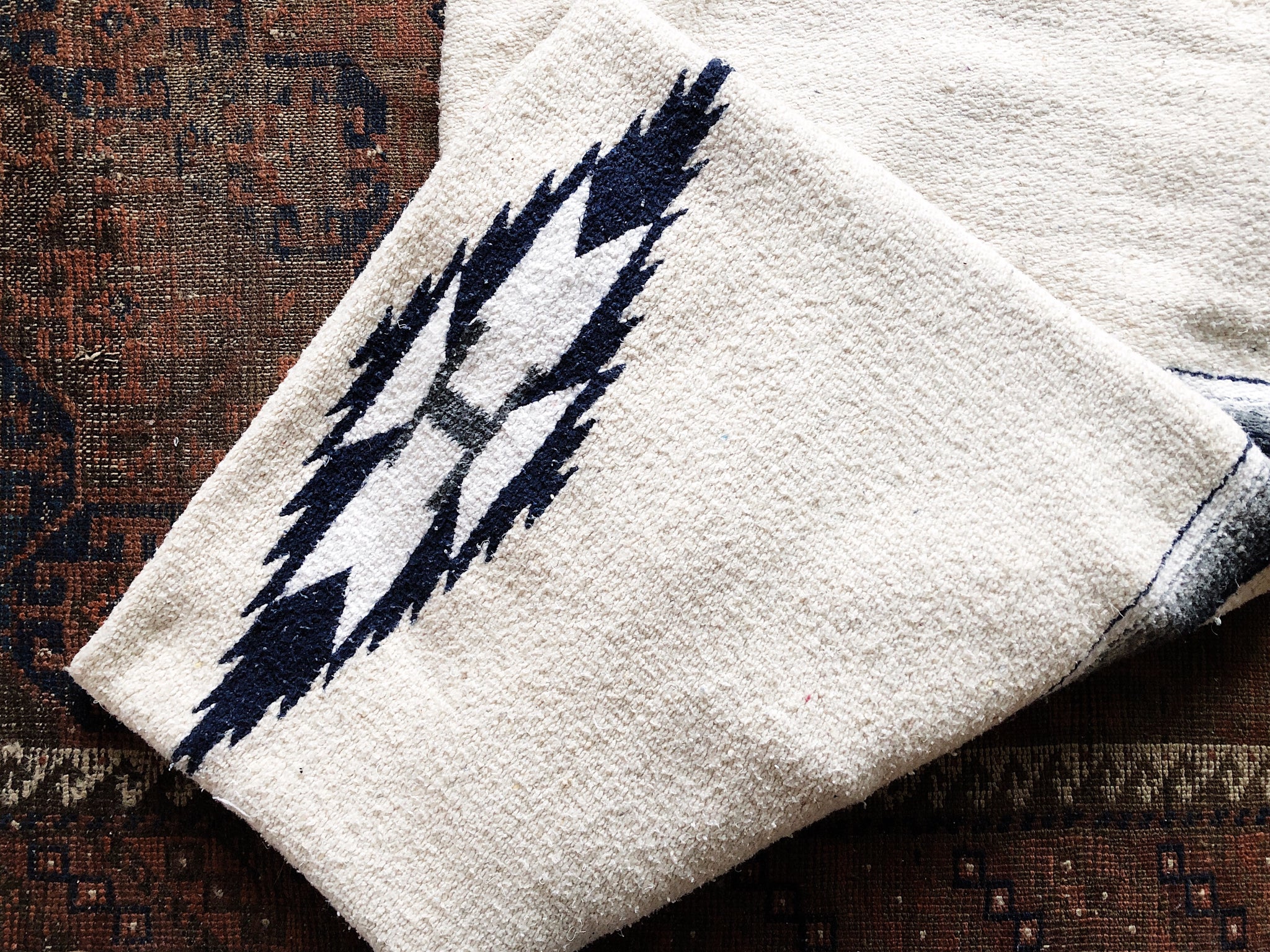 A nicely sized Mexican blanket made of nubby cotton. Deepest navy blue and ombré on warm white