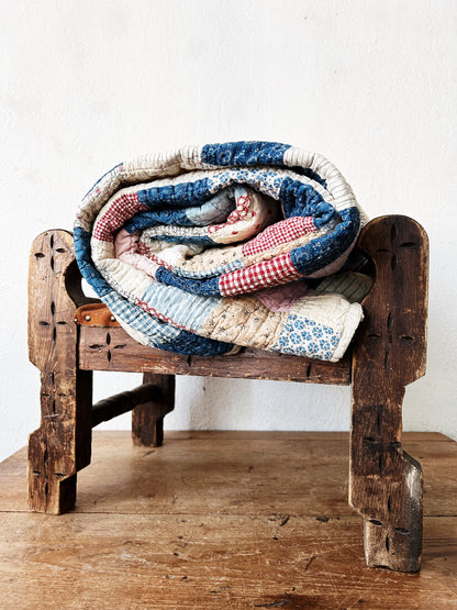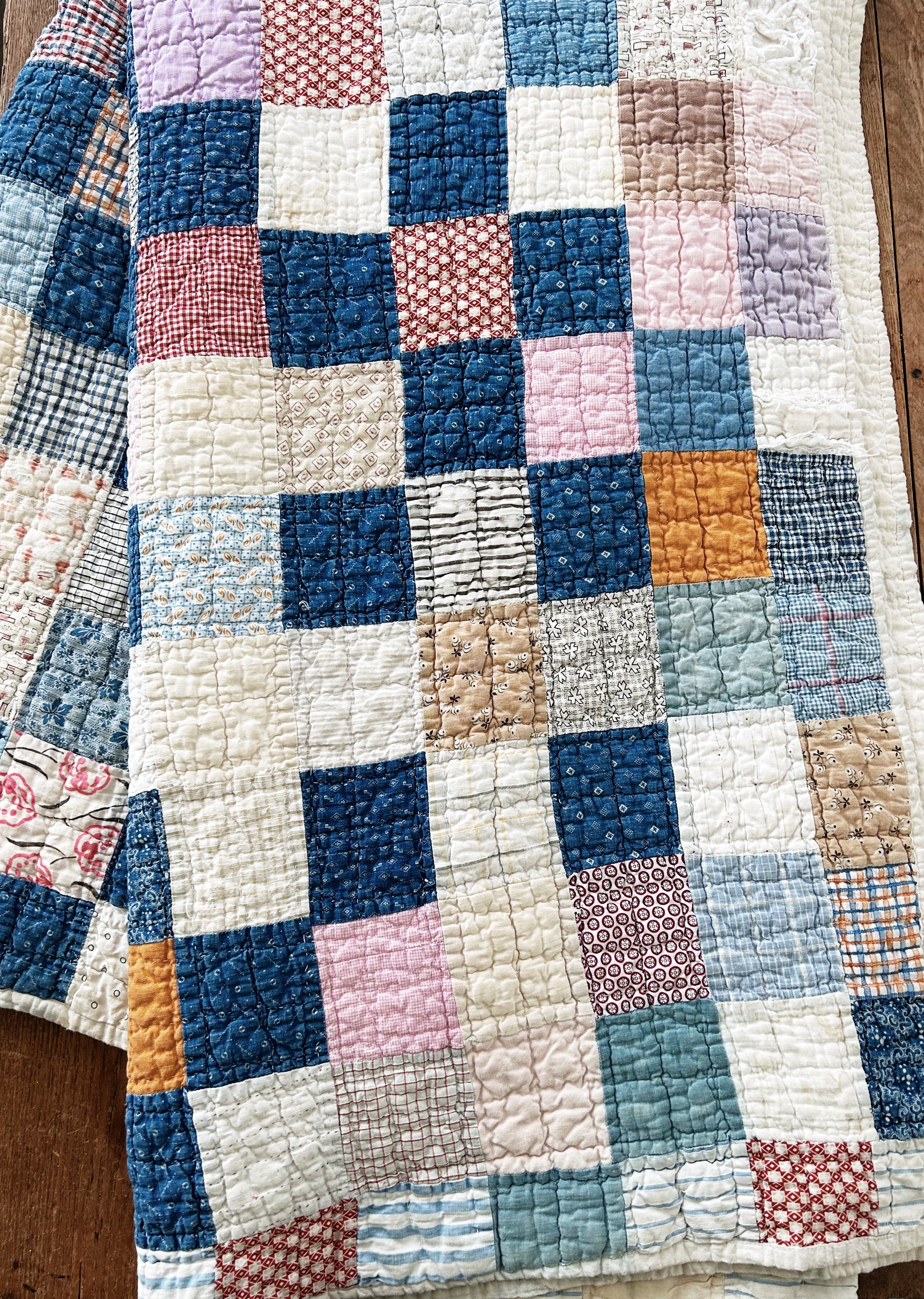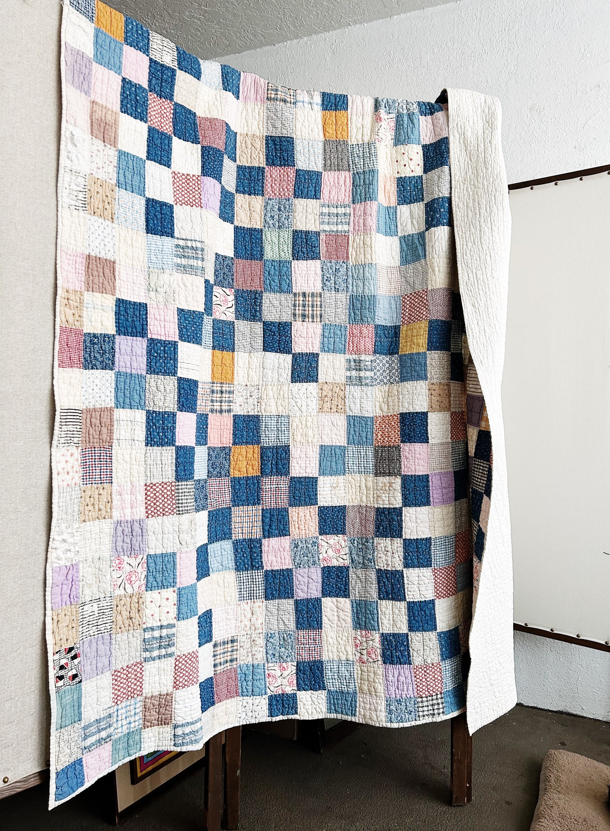 Lovely vintage cotton patchwork quilt. Mid weight, in really nice condition with minor noticeable age in a few spots. Reverses to solid white. Photographed on a full size bed. Machine made and washable on cold delicate.