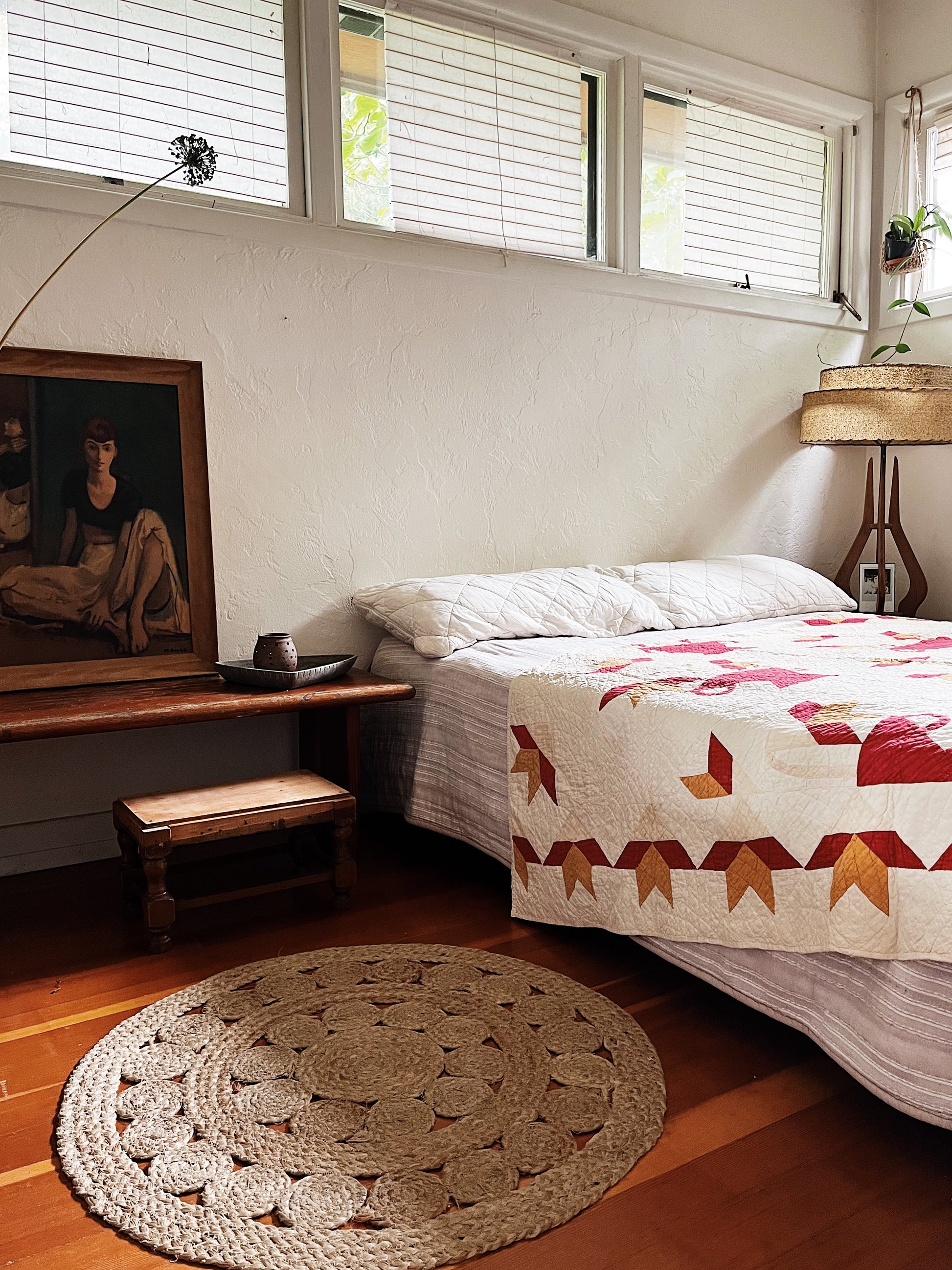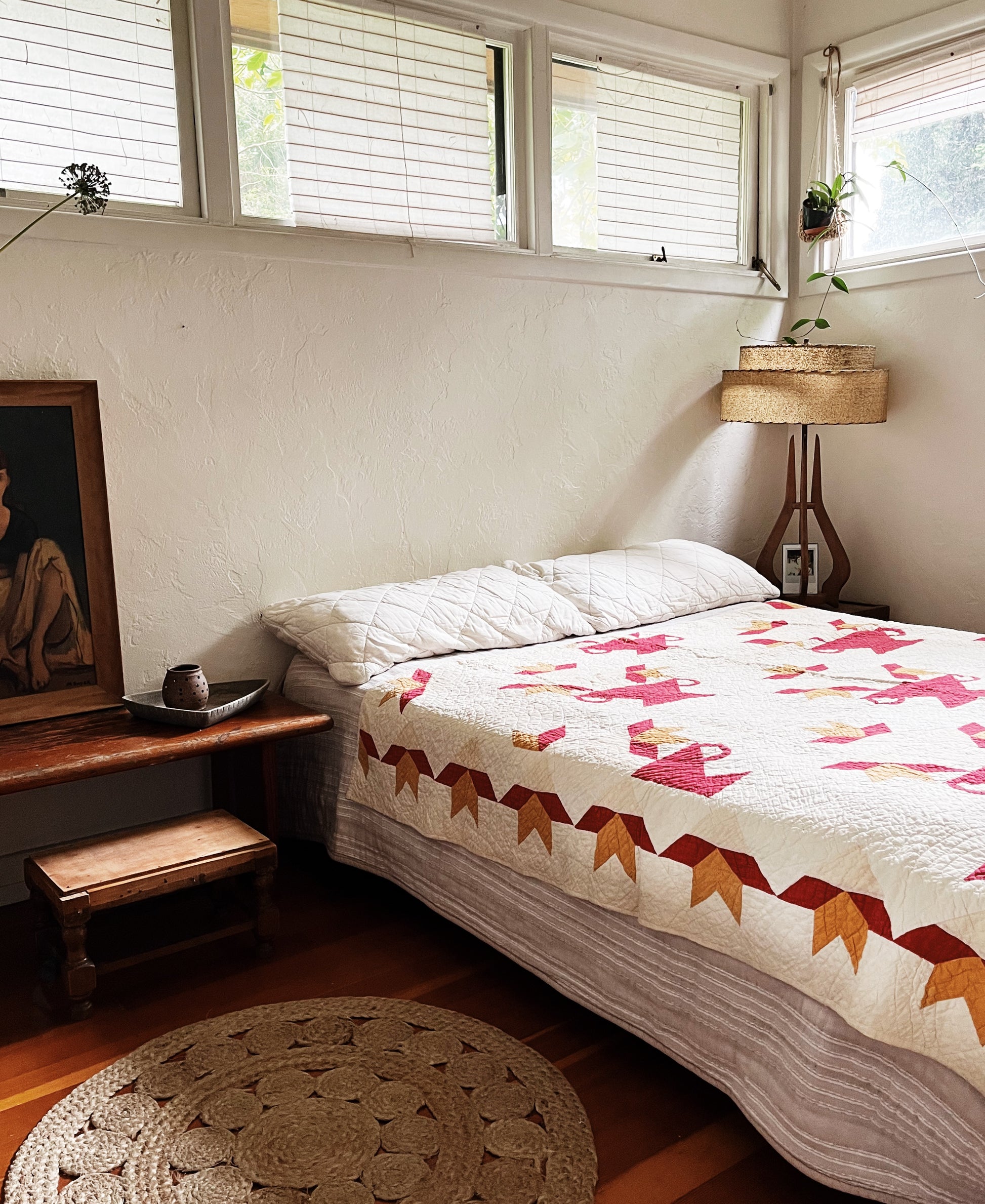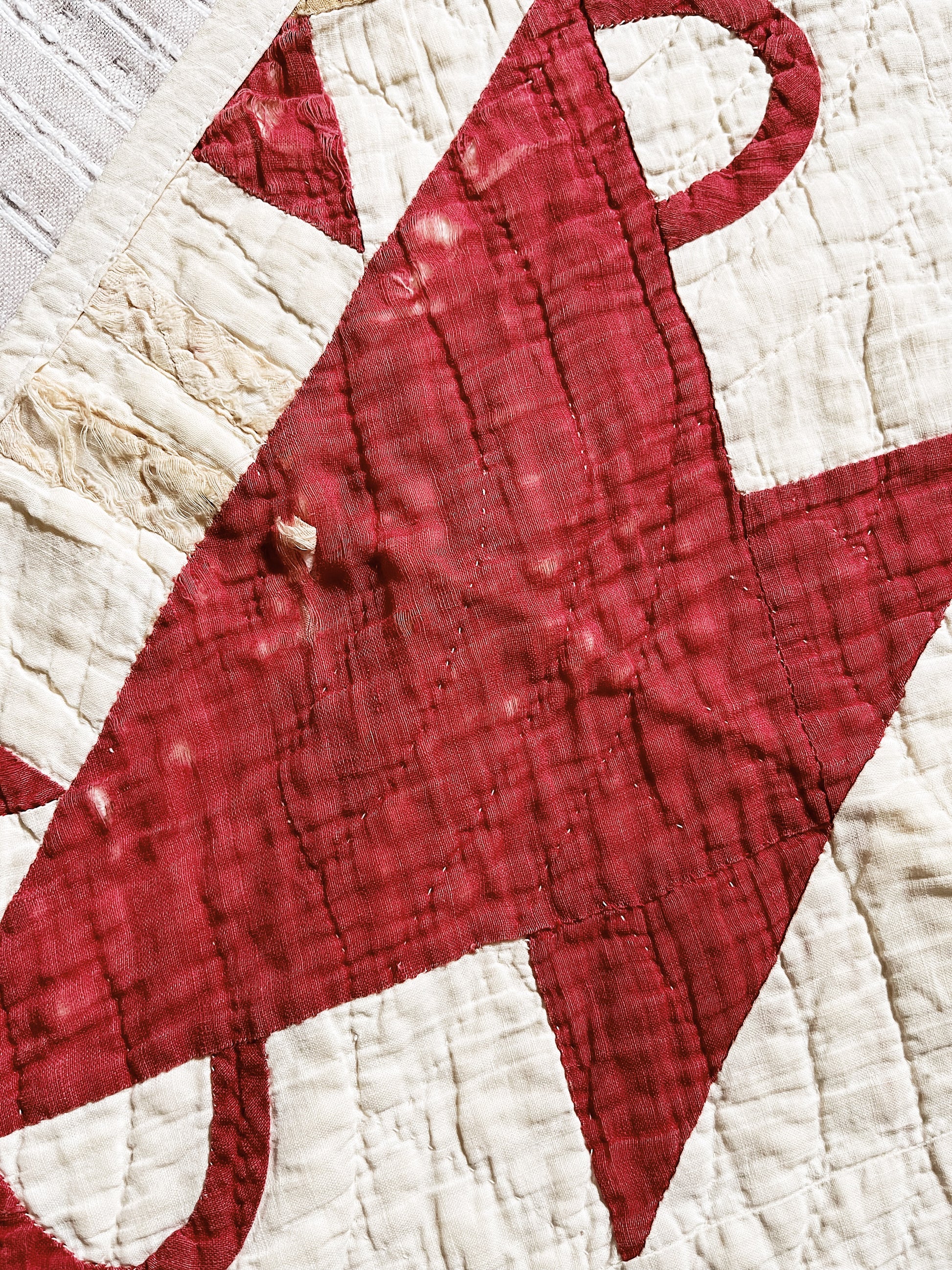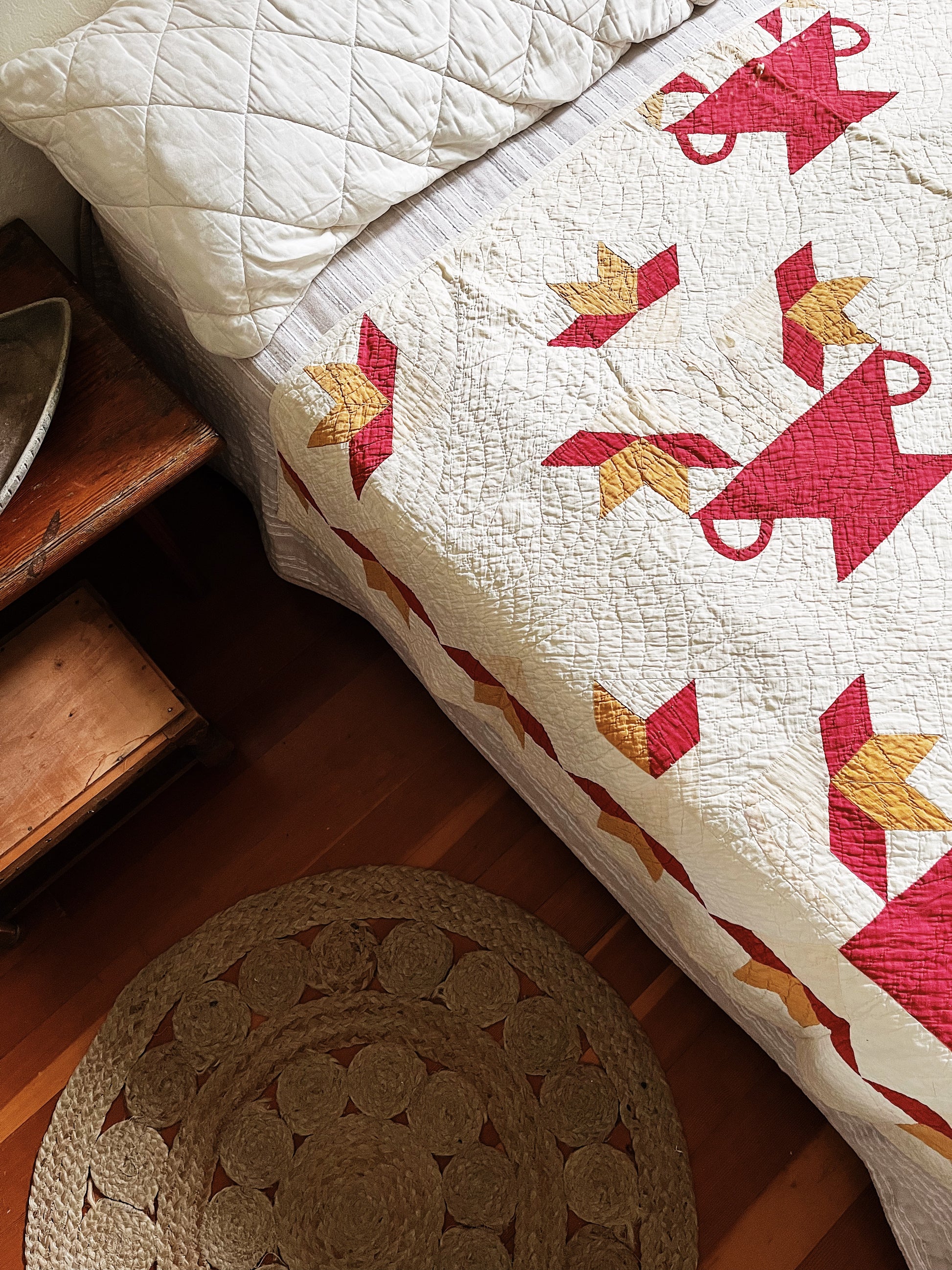 A really sweetly made folk cotton quilt in the flower vase pattern. Hand stitched. Soft and broken in. Lightweight. Almost square. Shown on a full bed