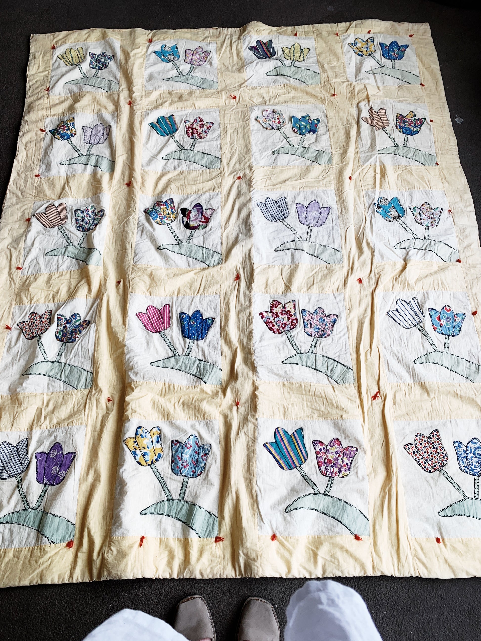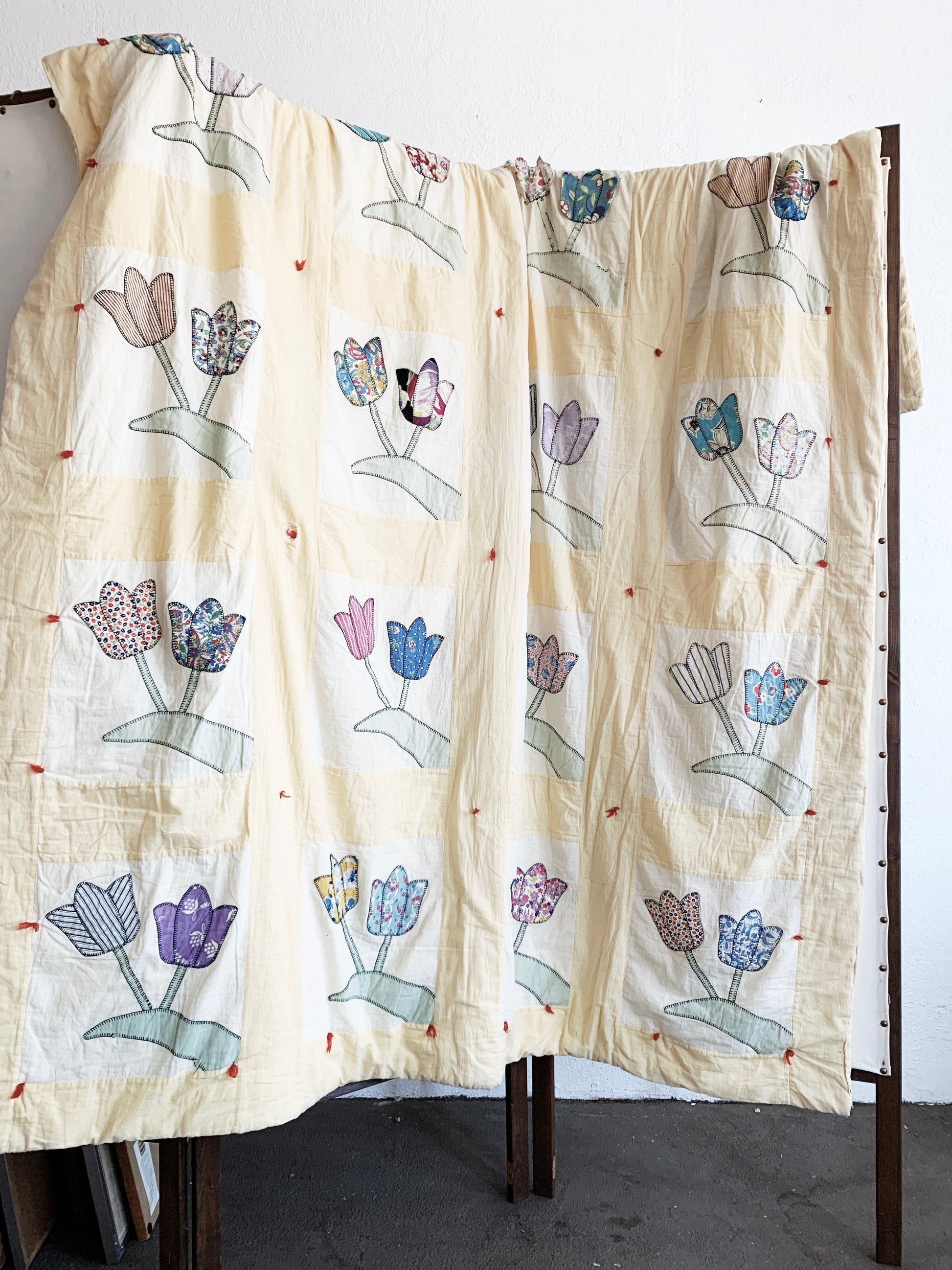 Thick and so soft all cotton handmade vintage tulip quilt. In really nice shape overall, some age issues as shown in photos. A real gem regardless. Butter yellow and cream with patchwork tulips. Back is solid pale yellow.